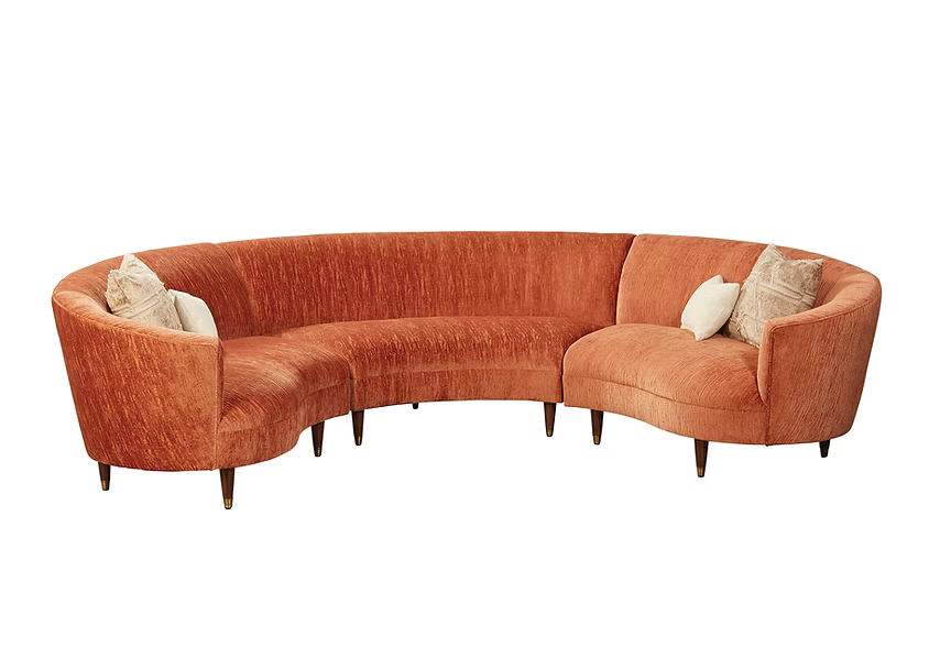 HIGHLIGHTED FEATURESBold Designer Look:-Graceful, sculptural curves-Walnut wood legs with brass caps-Elegant and upscale presenceComfort Without Compromise:-Fixed (tight) cushions maintain a smooth and clean silhouette-Tight back design + accent pillows filled with Pluma Plush for extra comfortPerformance Fabrics, Real Life Ready:-Wide variety of colors and textures-Available in performance fabrics (e.g. Crypton) – stain-resistant, durable, and made for everyday lifeFlexible Configurations:-Large 3-piece curved sectionals for open layouts-Space-conscious 2-piece versions for smaller rooms-Custom-order options to fit your unique spacePerfect for Large & Small Spaces:-Makes a statement in big rooms-Feels balanced and proportioned even in compact areas