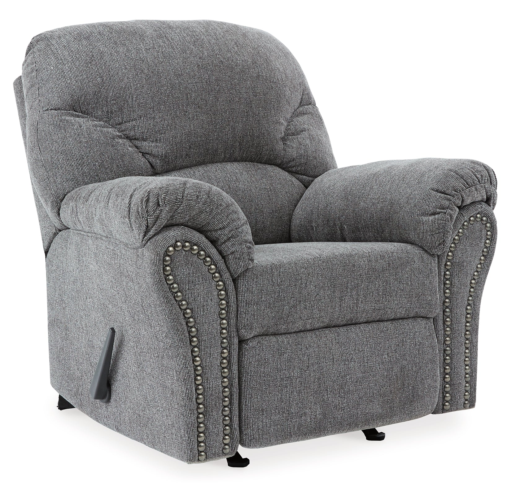 Pourquoi sacrifier le confort au style (ou le style au confort) quand vous pouvez avoir le meilleur des deux avec ce fauteuil inclinable à bascule en gris étain. Les éléments comprennent un design chic à dossier divisé et des accoudoirs recouverts d'un coussin qui facilitent l'endormissement. Les accoudoirs élégamment évasés attirent l'attention - une garniture en nickel noir à tête de clou pour une touche de caractère cool.