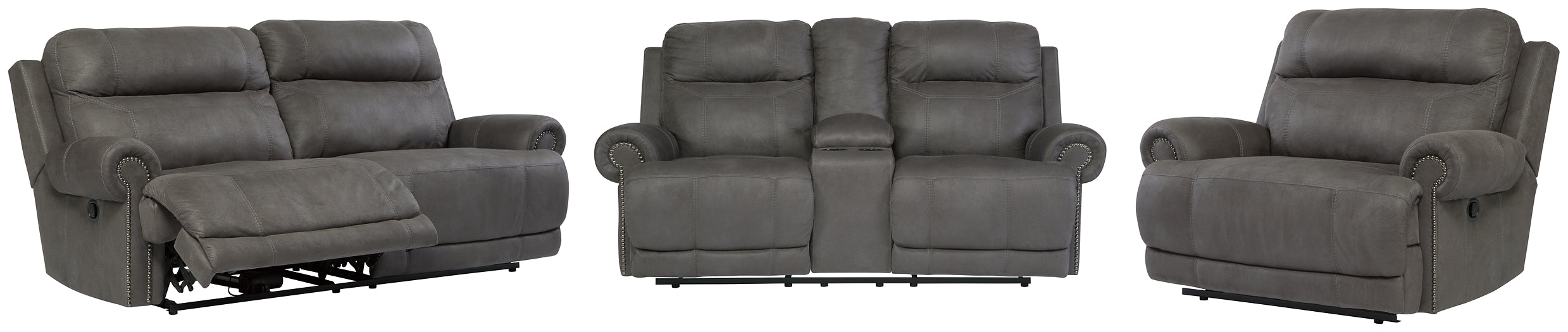 En évitant l'aspect « gonflé » que l'on pourrait attendre d'un fauteuil inclinable, cet ensemble canapé inclinable, causeuse et fauteuil inclinable ne se prive pas en matière de style contemporain. Des touches subtiles telles que des surpiqûres géantes sportives, une garniture cloutée et un effet « usé par les intempéries » sur le revêtement confèrent à cet ensemble élégant un attrait boutonné et une sensation de fraîcheur. La console centrale de la causeuse avec deux porte-gobelets apporte un élément pratique à l'agencement.
