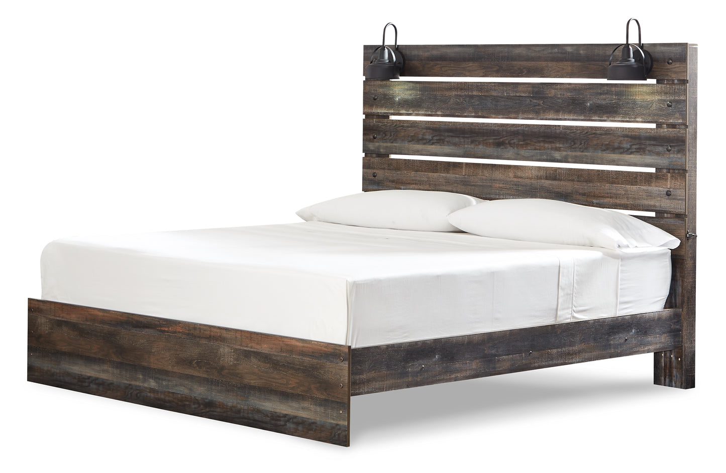 Lorsqu'ils sont combinés de la bonne façon, les styles rustique et industriel peuvent former un mariage heureux. Exemple concret : ce lit à panneaux king size. Une version raffinée de la beauté des planches de grange, son grain de bois complexe et reproduit présente des touches d'orange brûlé et de tons bleu sarcelle pour une impression d'authenticité patinée par les intempéries. Vous aimez lire au lit ? Vous trouverez certainement la paire d'appliques lumineuses rétro-chic et les prises USB sur la tête de lit à lattes ouvertes une idée brillante. Matelas et sommier disponibles, vendus séparément.