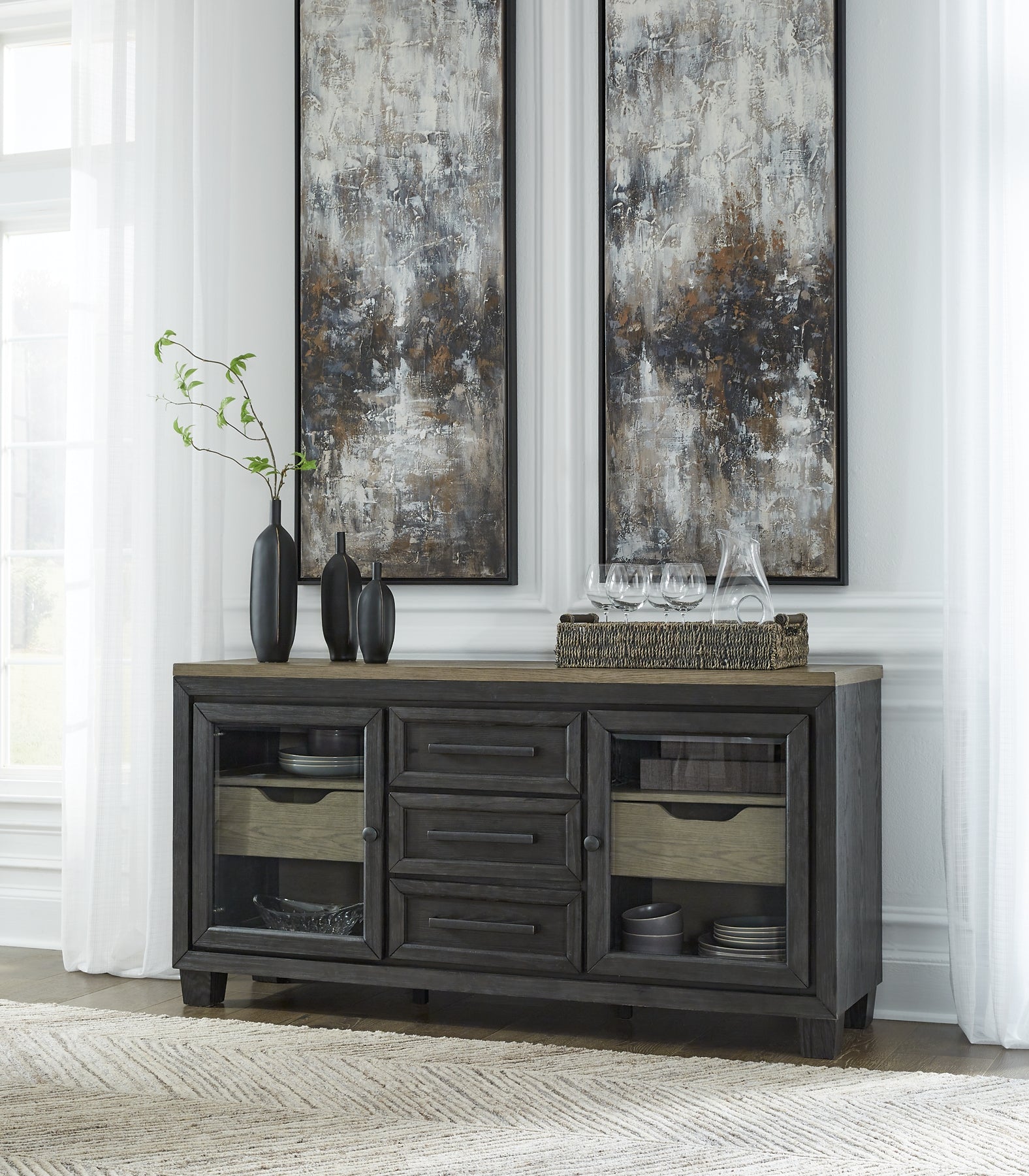 Ce buffet de salle à manger est de style contemporain décontracté, tout simplement bien fait. Sa palette de couleurs bicolores présente une riche couleur principale noire brossée accentuée par un magnifique ton de bois brun grisâtre poussiéreux. Cette pièce polyvalente comprend trois tiroirs centraux et deux autres soigneusement rangés derrière les portes, offrant beaucoup d'espace pour répondre facilement à vos besoins de rangement.