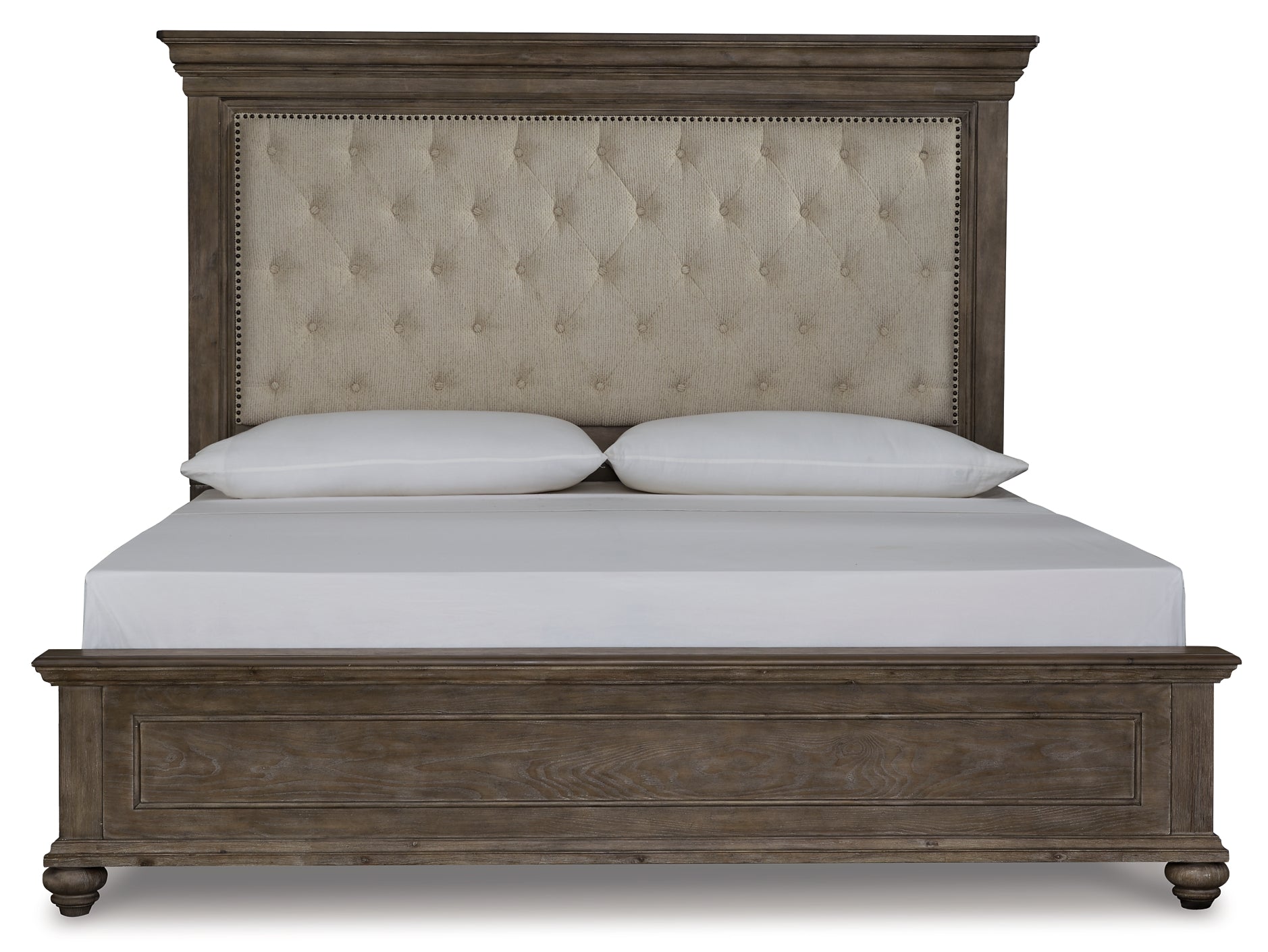 Accueillant. Chaleureux. D'une teinte céleste. Attrayant avec une finition grise patinée, des moulures substantielles et une tête de lit haute de style manoir avec une grande présence, ce lit rembourré California King est sûr de donner à votre propriété une sensation encore plus proche de chez vous. Le look est embelli par des placages d'orme pour un chef-d'œuvre de suite principale richement conçu pour des années de satisfaction. Le coussin de tête de lit encastré avec rembourrage touffeté et garniture de clou contrastante ajoute du confort et une sensation d'indulgence. Que votre esthétique soit classique, éclectique ou de ferme moderne, rassurez-vous, ce lit rembourré Cal King de haute qualité et de haute qualité est un choix inspiré. Matelas et sommier/sommier disponibles, vendus séparément.