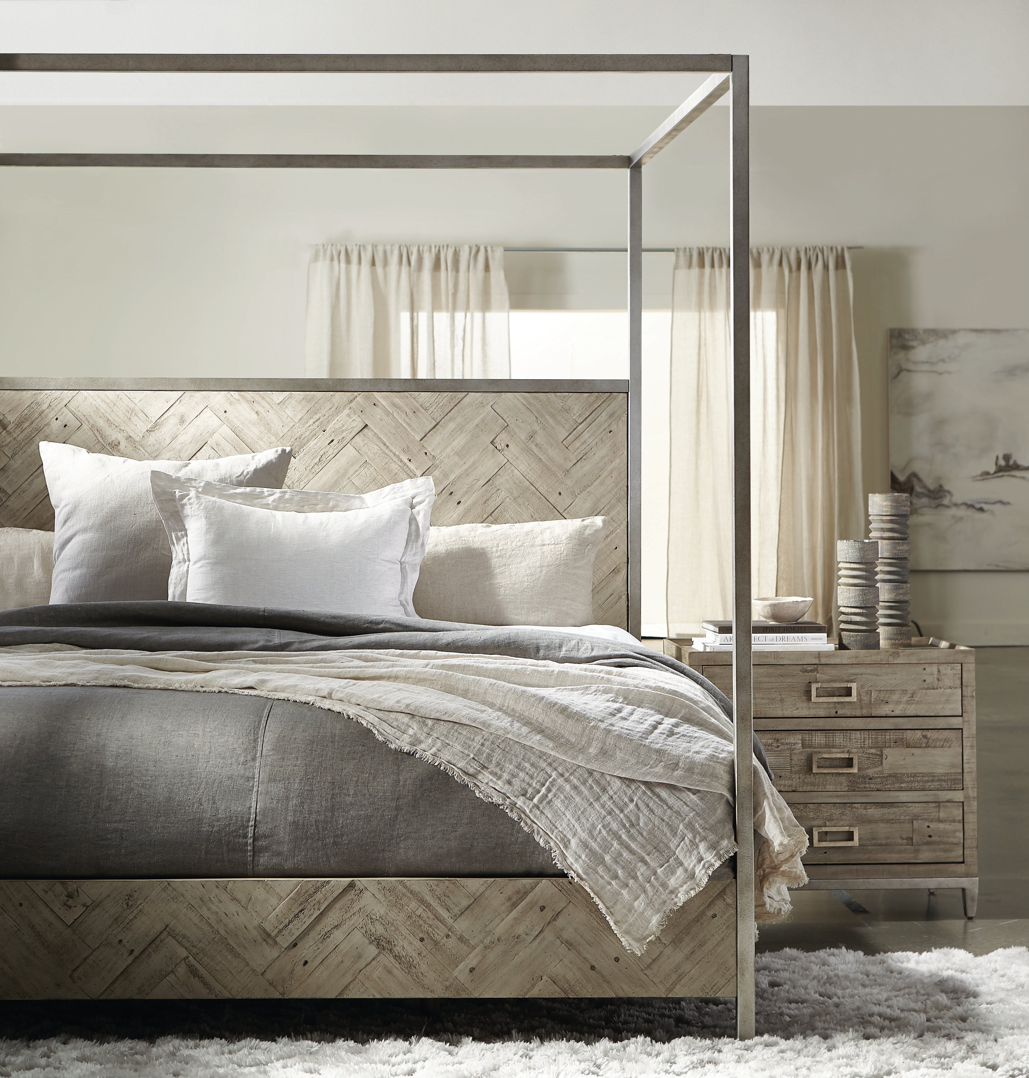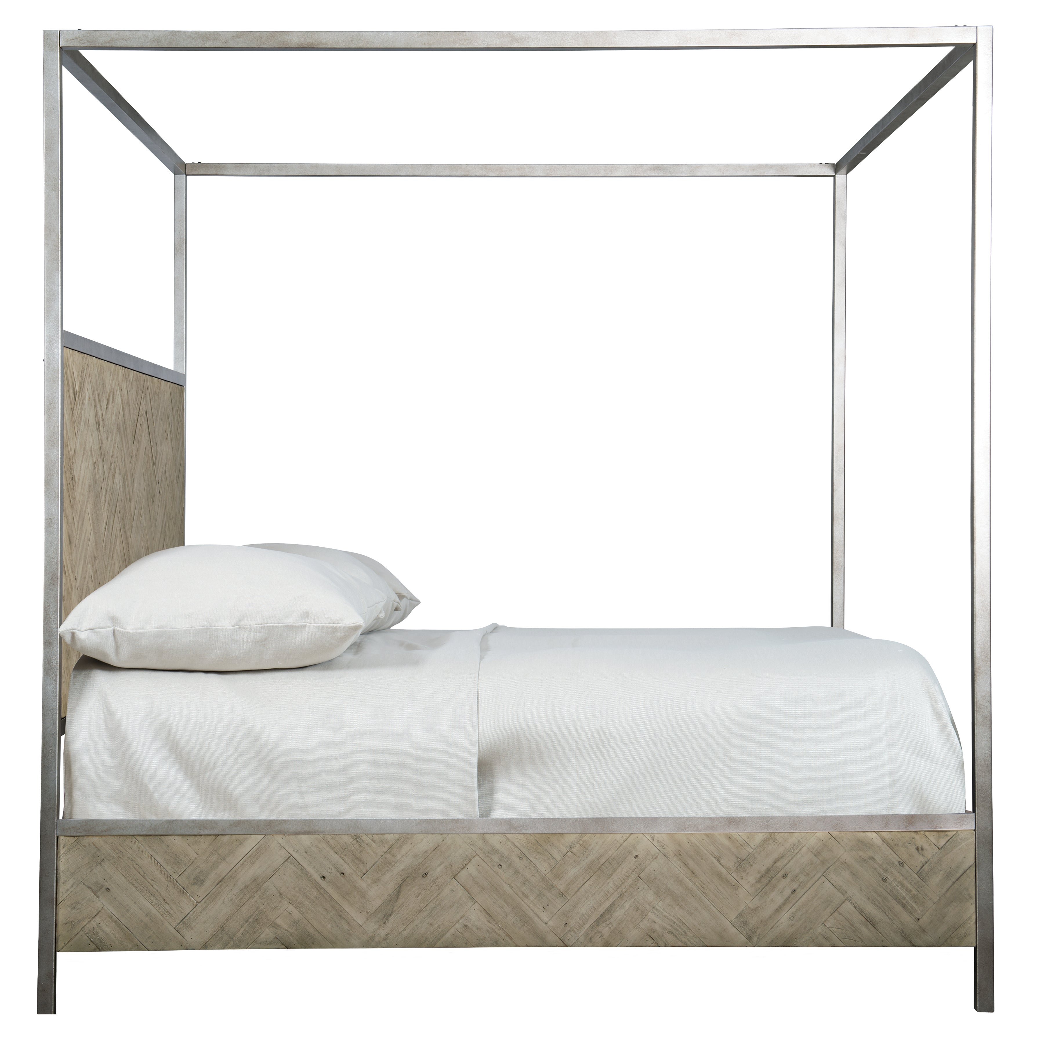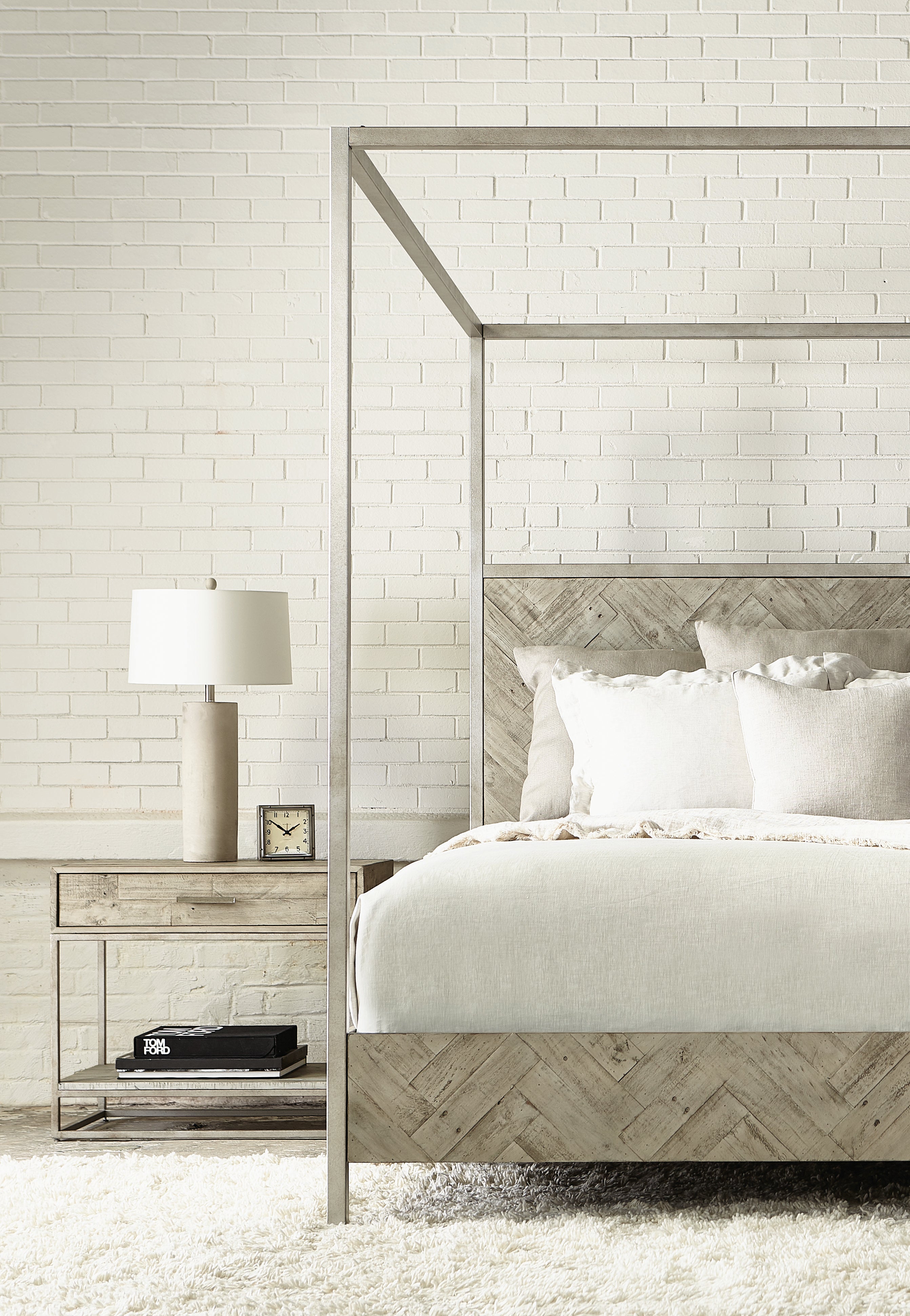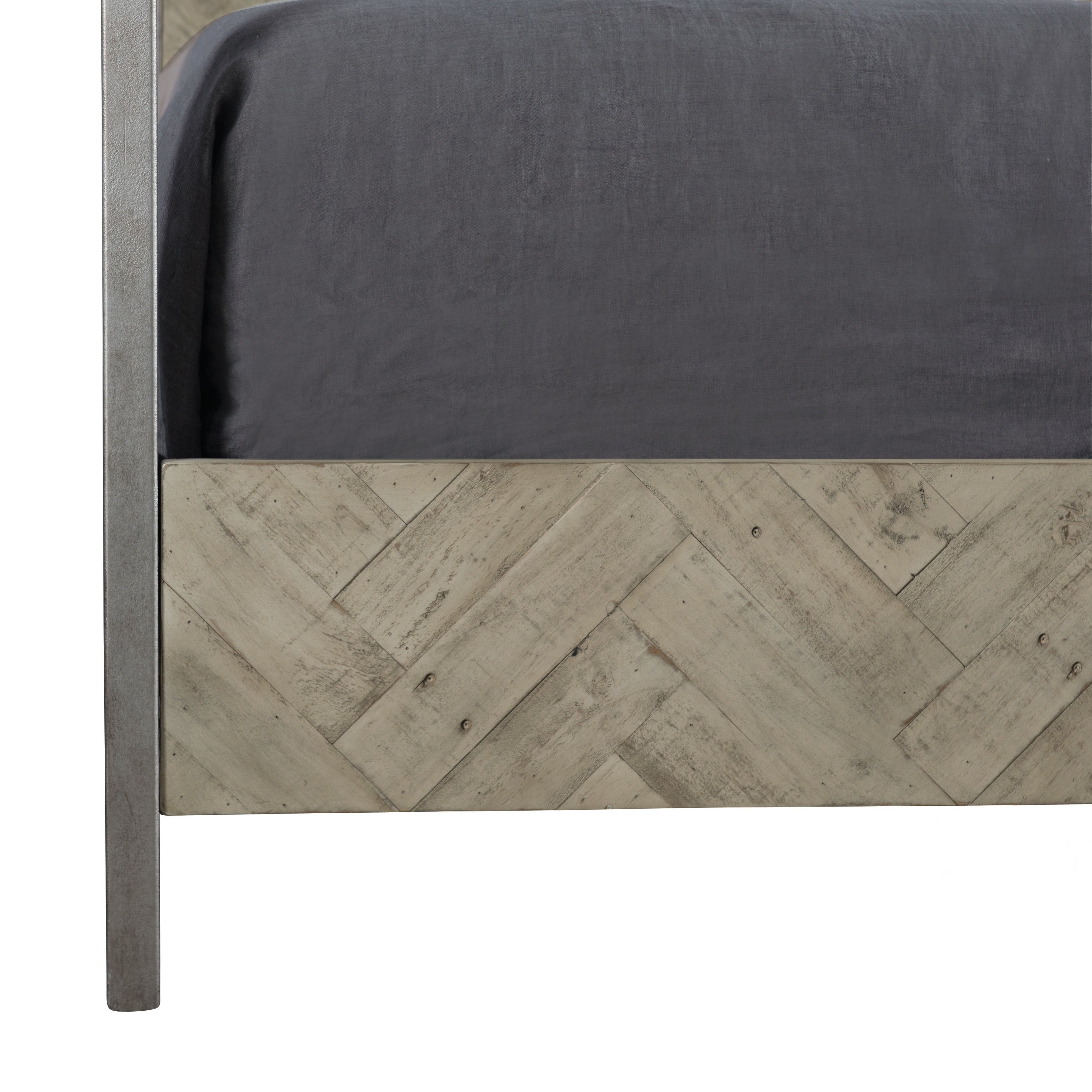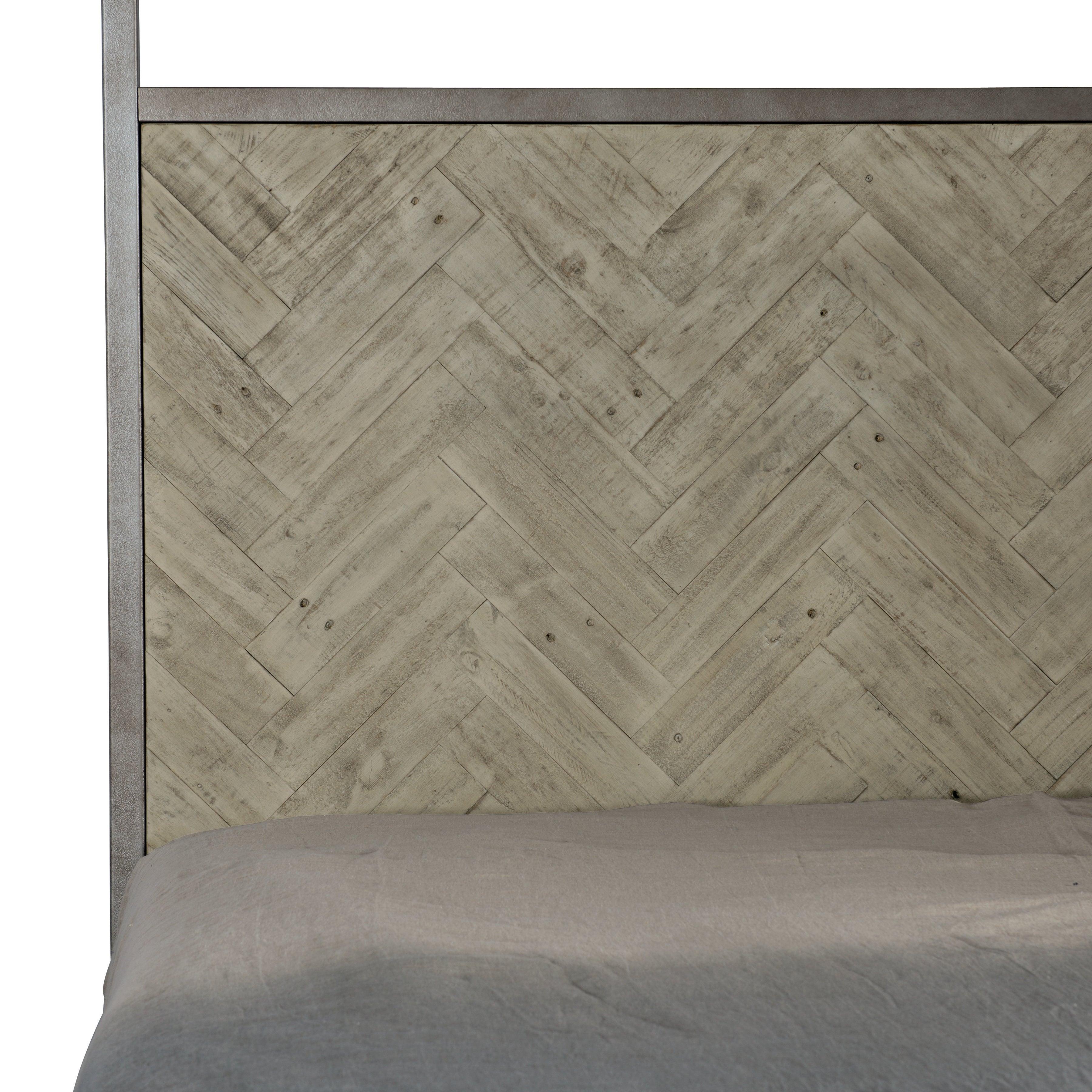 La collection Highland Park allie les meilleures caractéristiques du design du milieu du siècle et de la ferme, offrant un attrait éclectique avec une ambiance décontractée. Le lit à baldaquin Milo ajoute des couches de texture rustique à une forme épurée et moderne. Les planches de pin récupéré forment un motif à chevrons dynamique sur la tête et le pied de lit. Le pin vieilli est fini dans un gris Morel atténué, mettant en valeur le grain et les imperfections du bois. Fabriqués en acier tubulaire et en tôle dans une finition argent glacé, le cadre et le baldaquin confèrent des détails architecturaux élégants et une sensation métropolitaine à cette pièce unique.