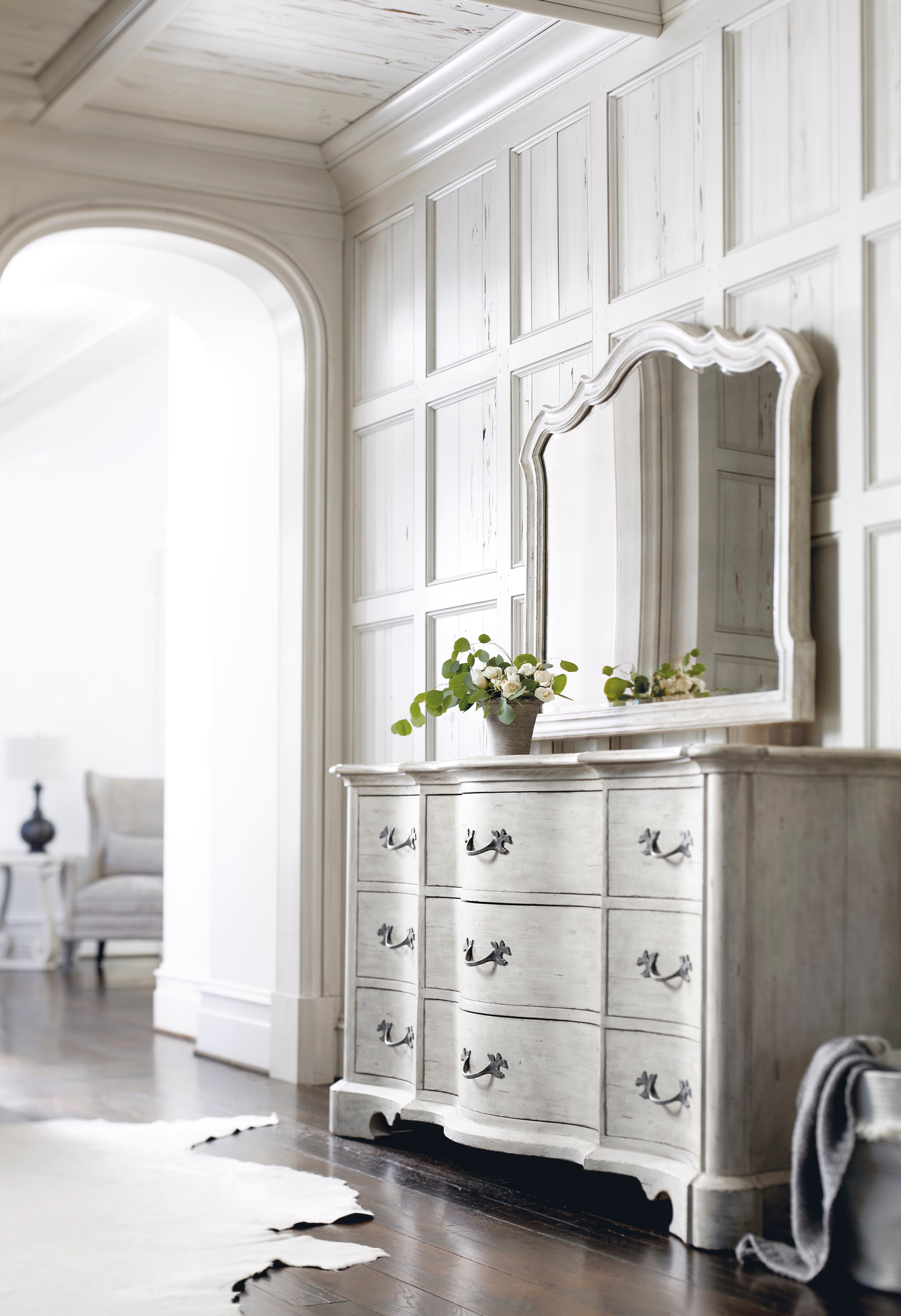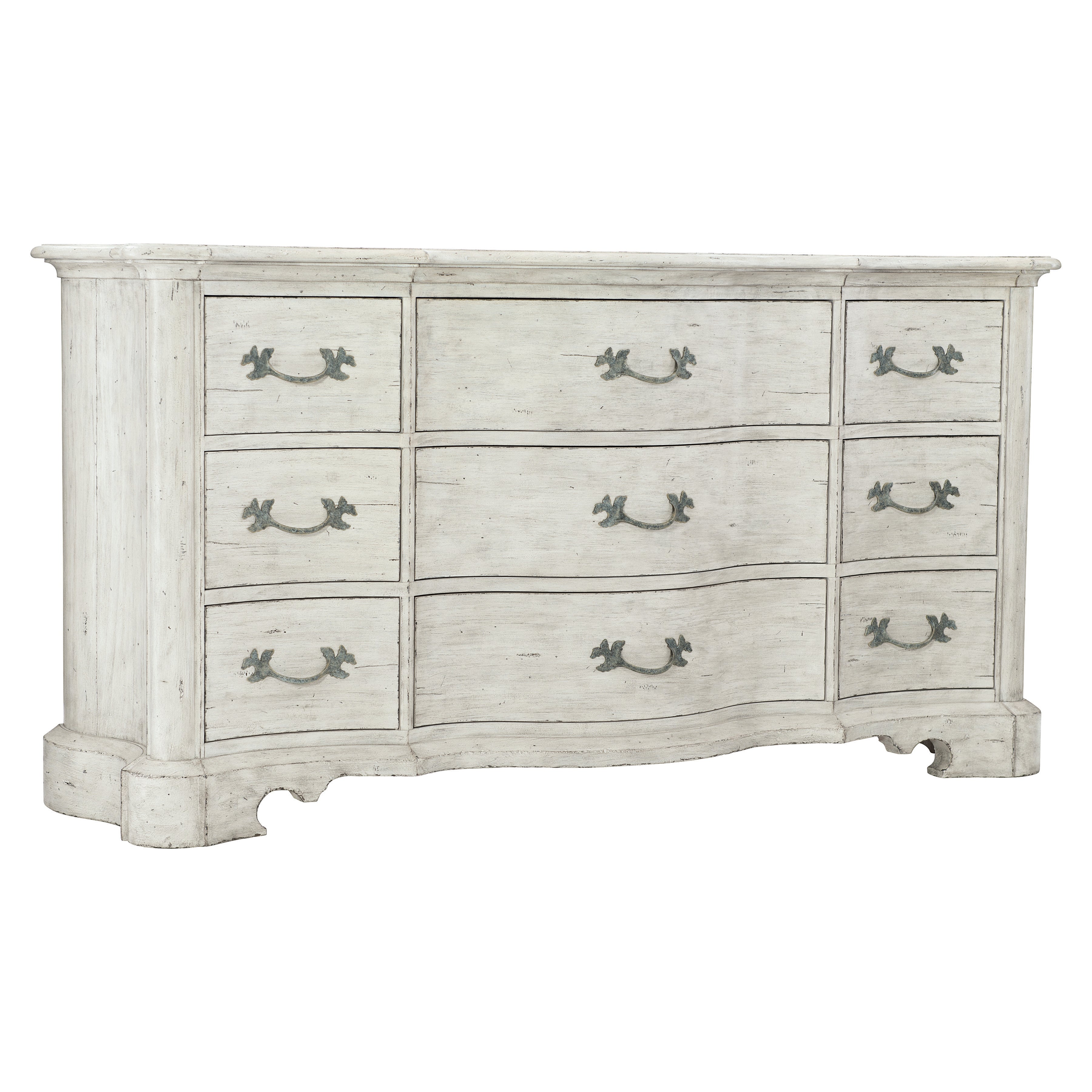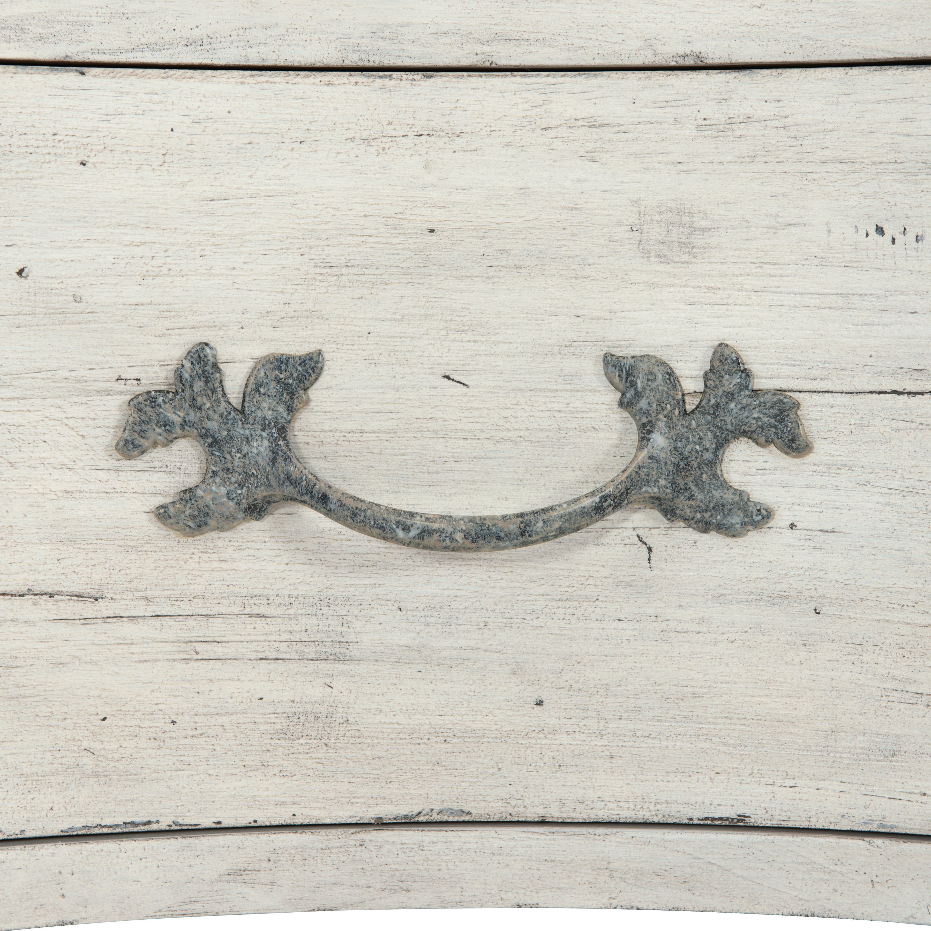 Fabriquée en bois avec une finition en coton blanchi à la chaux légèrement usée, la commode Mirabelle à neuf tiroirs apporte une touche douce et décontractée à une forme traditionnelle. Inspirée du style provincial français du XVIIe siècle, elle associe une forme serpentine douce à des pieds de support et à des ferrures ornementales pour un look sophistiqué et habillé, mais décontracté et accueillant.
