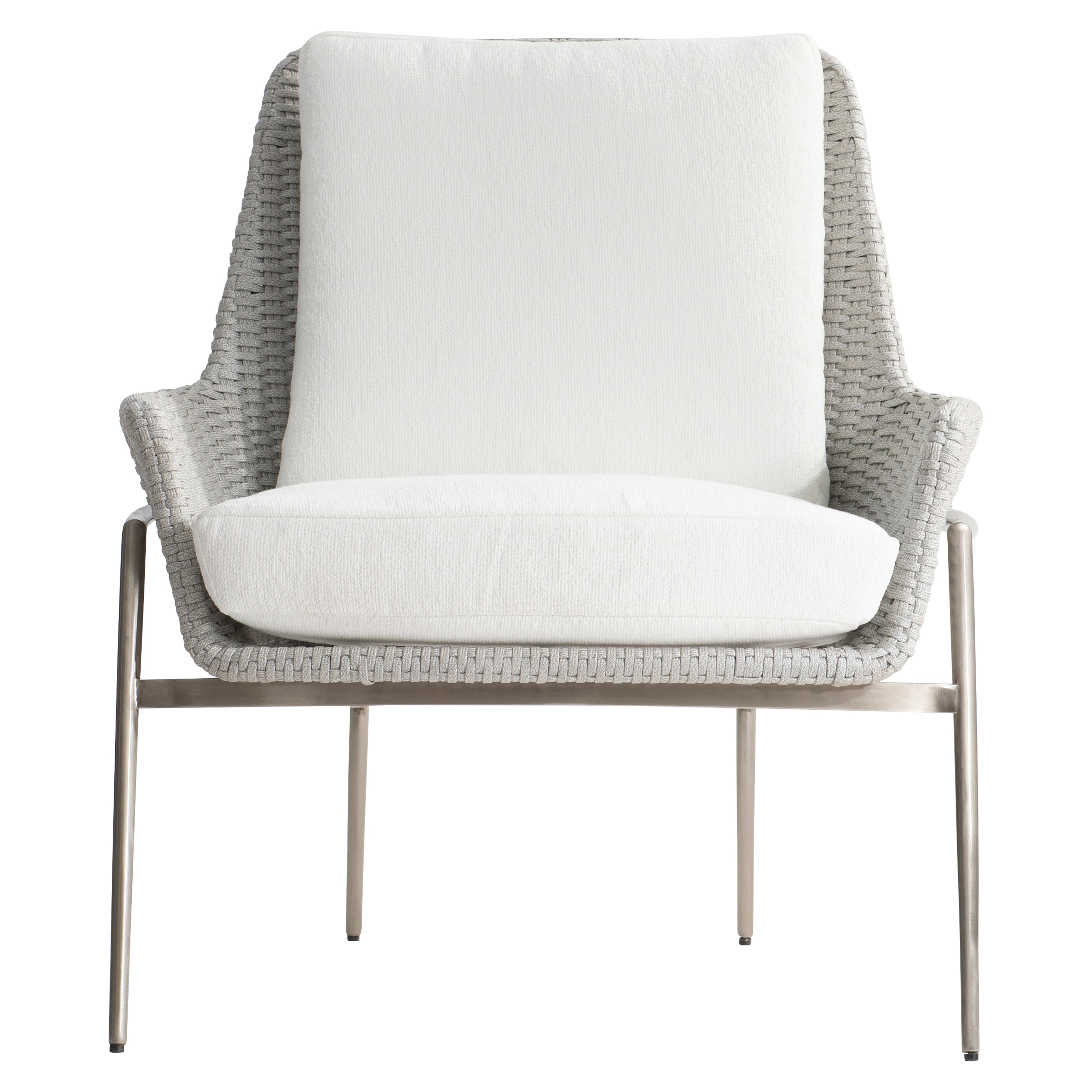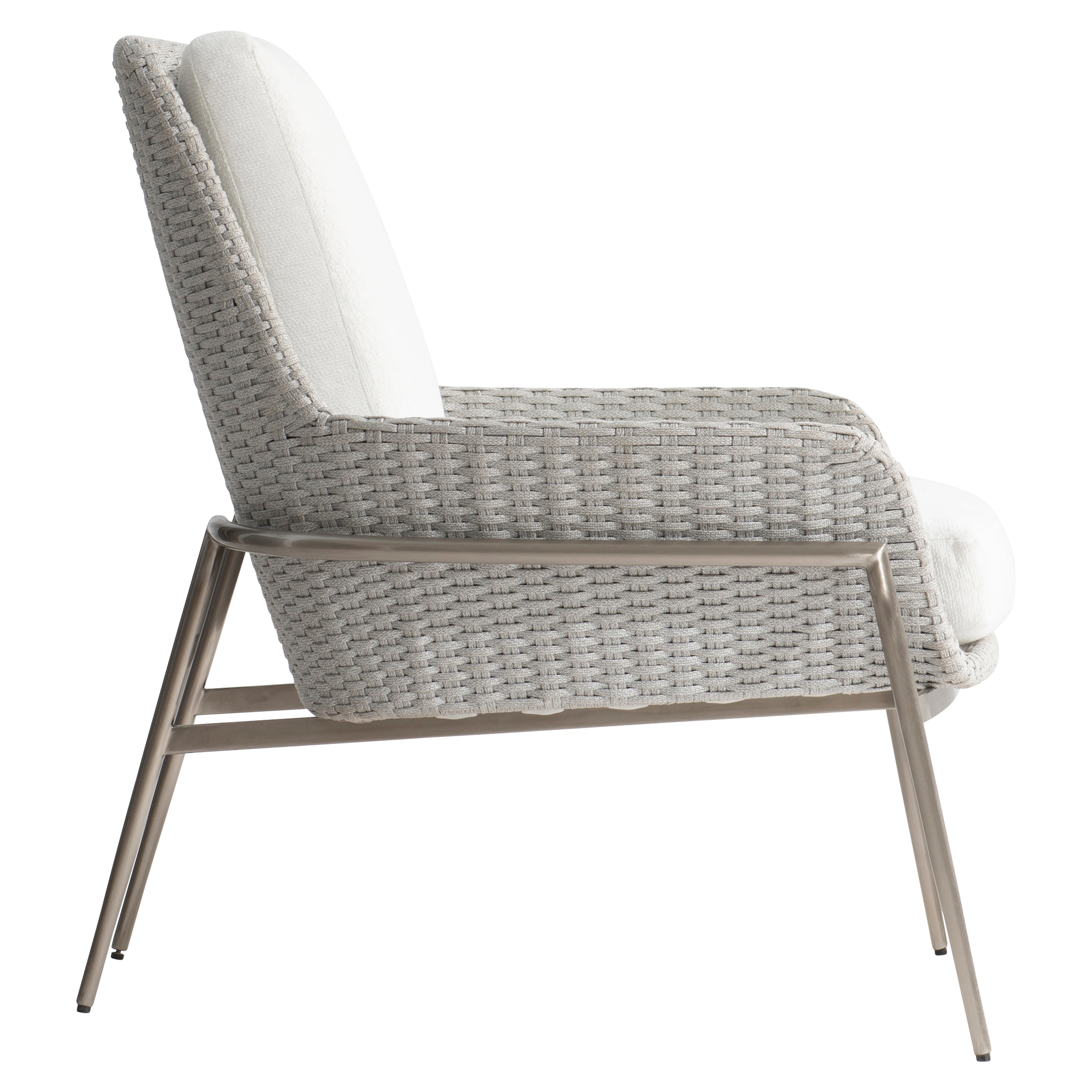 Un siège en corde plate tressée en Silver Pearl flotte dans un cadre en aluminium sur la belle chaise d'extérieur Salou. Des accoudoirs légèrement évasés et un siège légèrement incliné offrent un contrepoint incurvé aux angles et aux lignes du cadre en métal. Un coussin d'assise et un coussin de dossier amovibles incroyablement doux assurent une assise confortable.