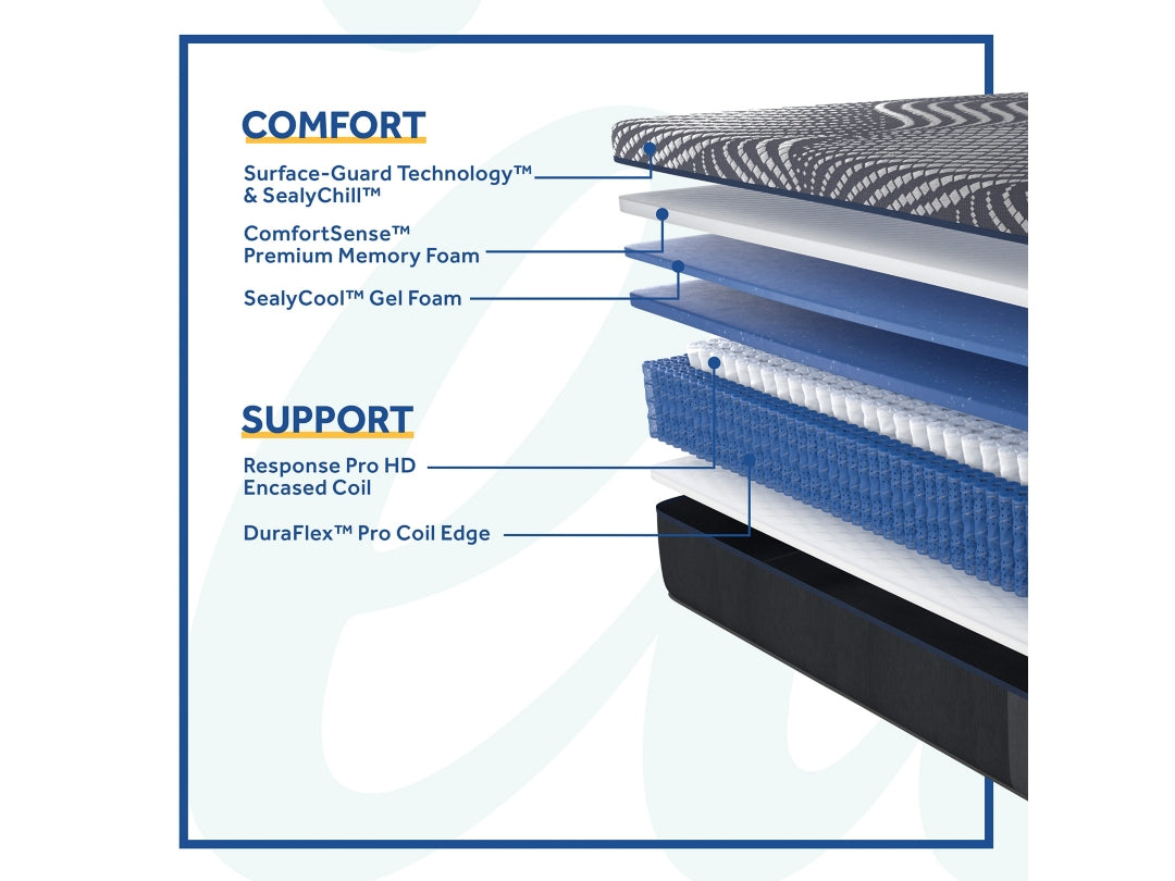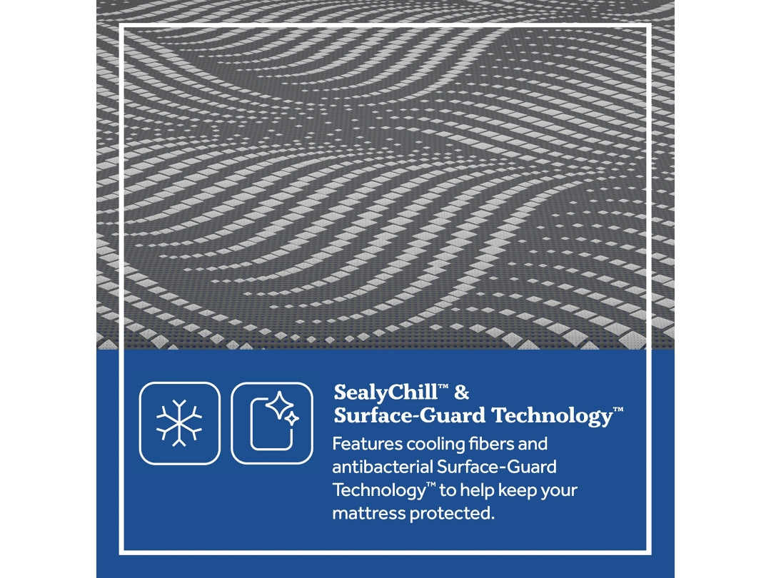 This mattress is an advanced version of Sealy's best of both worlds comfort, with more motion reducing coils for support and a ventilated, reinforced edge to improve breathability and durability. The SealyCool™ gel foam promotes a cooling environment and helps cushion, delivering comfort and support with a medium feel. The DURAFLEX™ pro coil edge system consists of densely packed coils surrounding the edge of this mattress for added durability, more sleeping area, a solid seating surface and better flexibility when paired with an adjustable base. The protective cooling cover is a cool to the touch version of Sealy's stretch knit cover with cooling fibers for comfort and Surface-Guard Technology™ that protects the mattress surface from odors and stains caused by bacteria and common allergens.