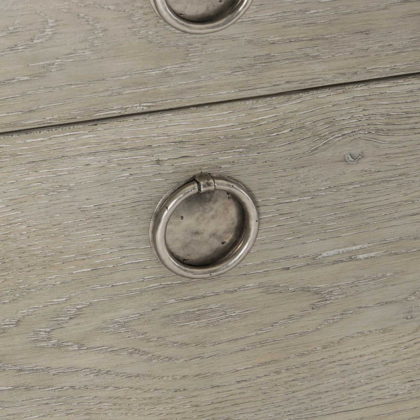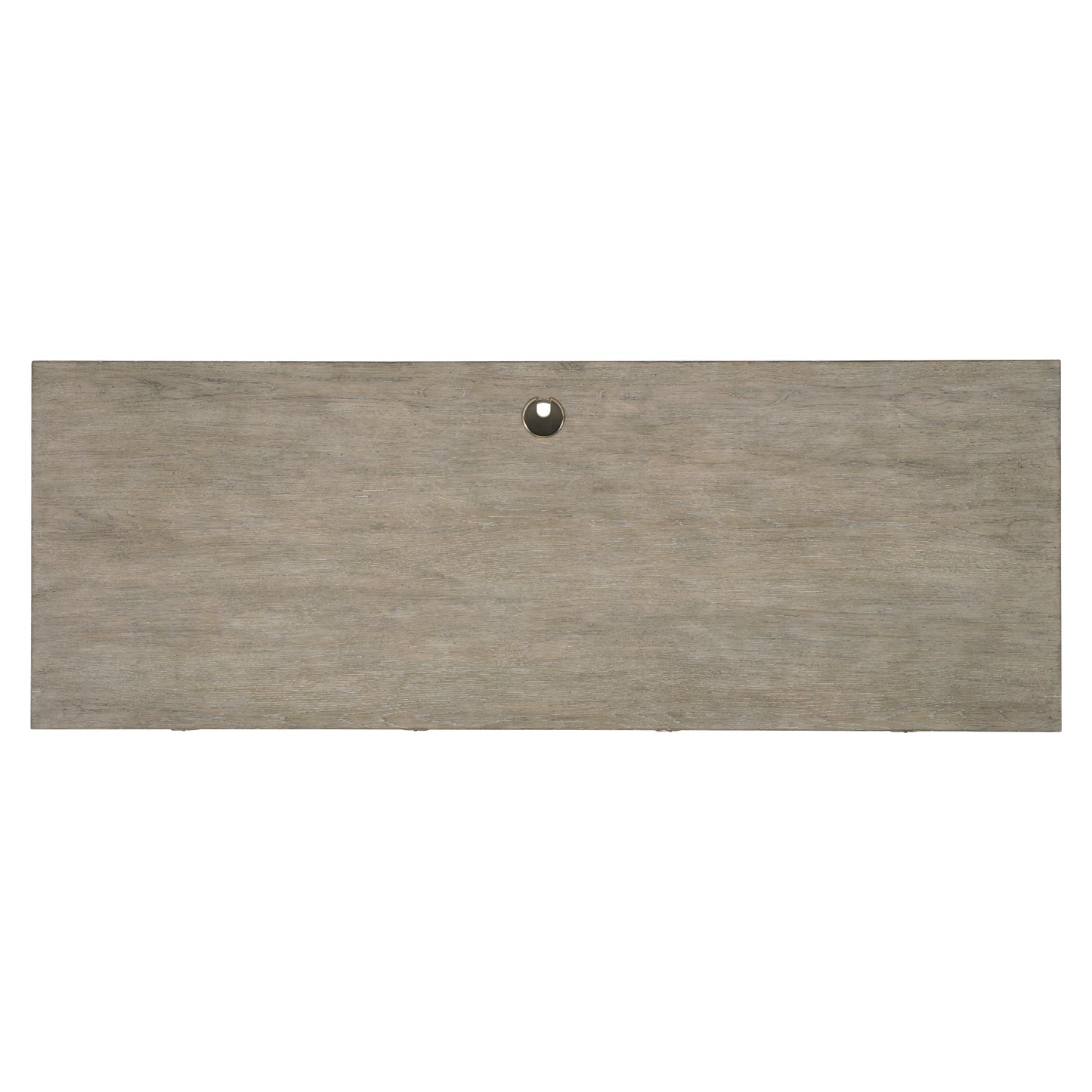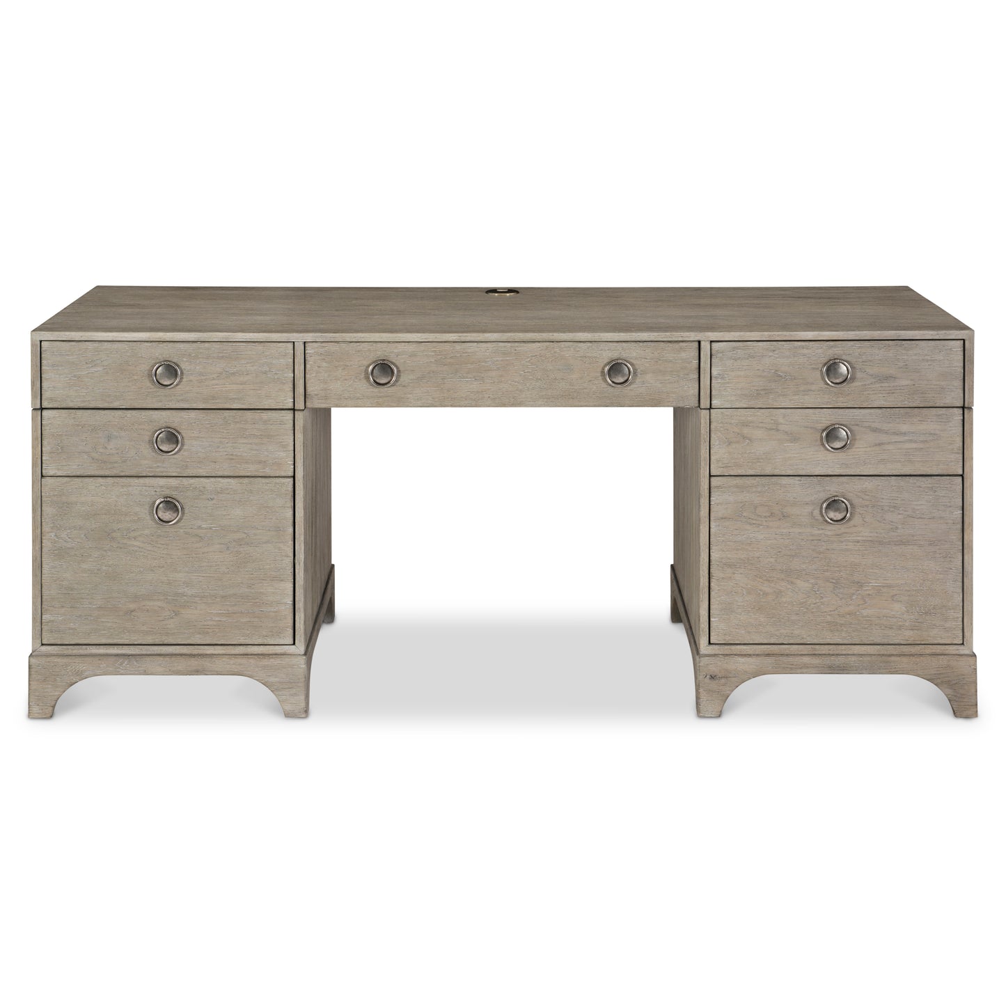 Pewter finished desk with two drawer banks for a total of seven drawers. Desk is finished on all sides. One metal covered grommet on top. One interior receptacle with two USB charging ports and two outlets. Each left and right drawer bank has three drawers - two smaller at top and one larger file drawer at bottom with removable hanging file rods for letter or legal files. The center drawer has a drop front and back cutout for cord management. Adjustable glides.