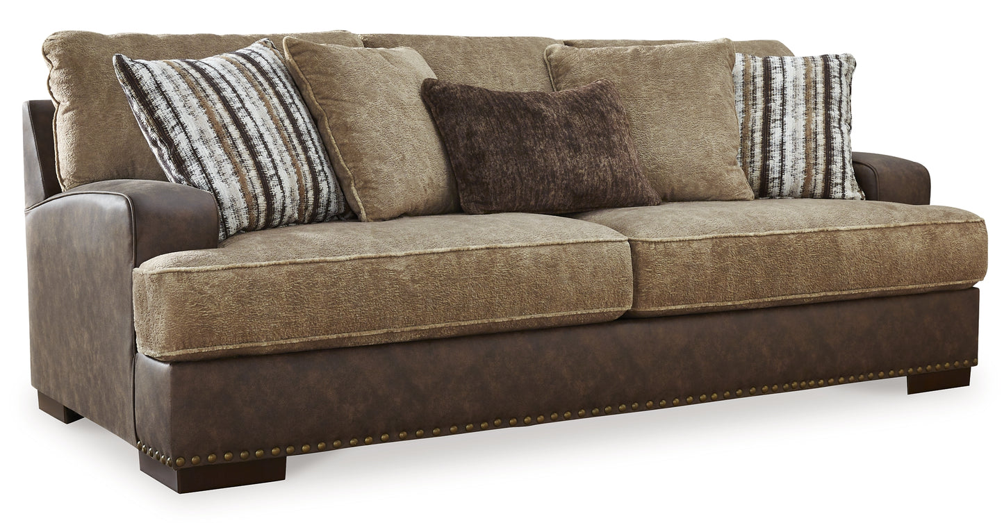 Punctuated by a subtle band of nailhead trim, this sofa is perfect for those who love the look of leather. Two textural tones provide twice the style and comfort—and incorporate an added layer of visual interest. Throw pillows add a fun decorative element.