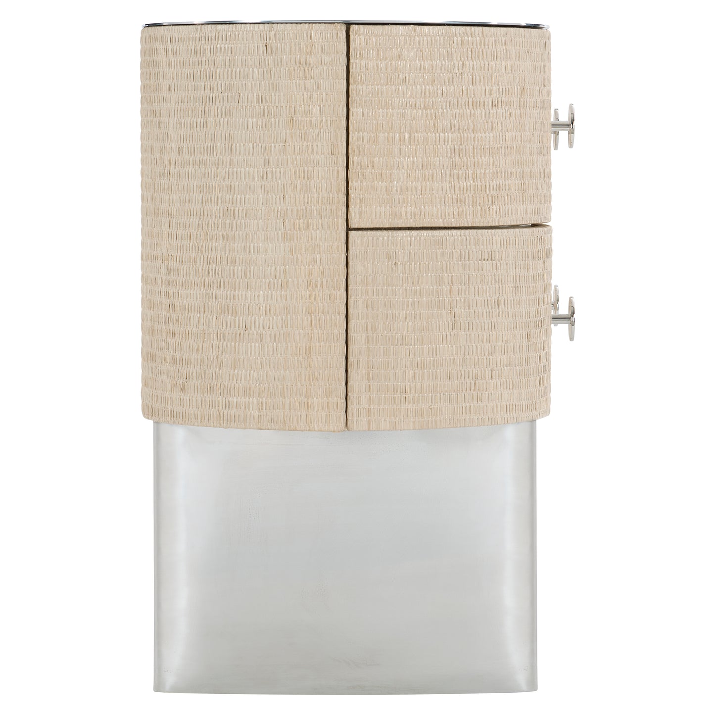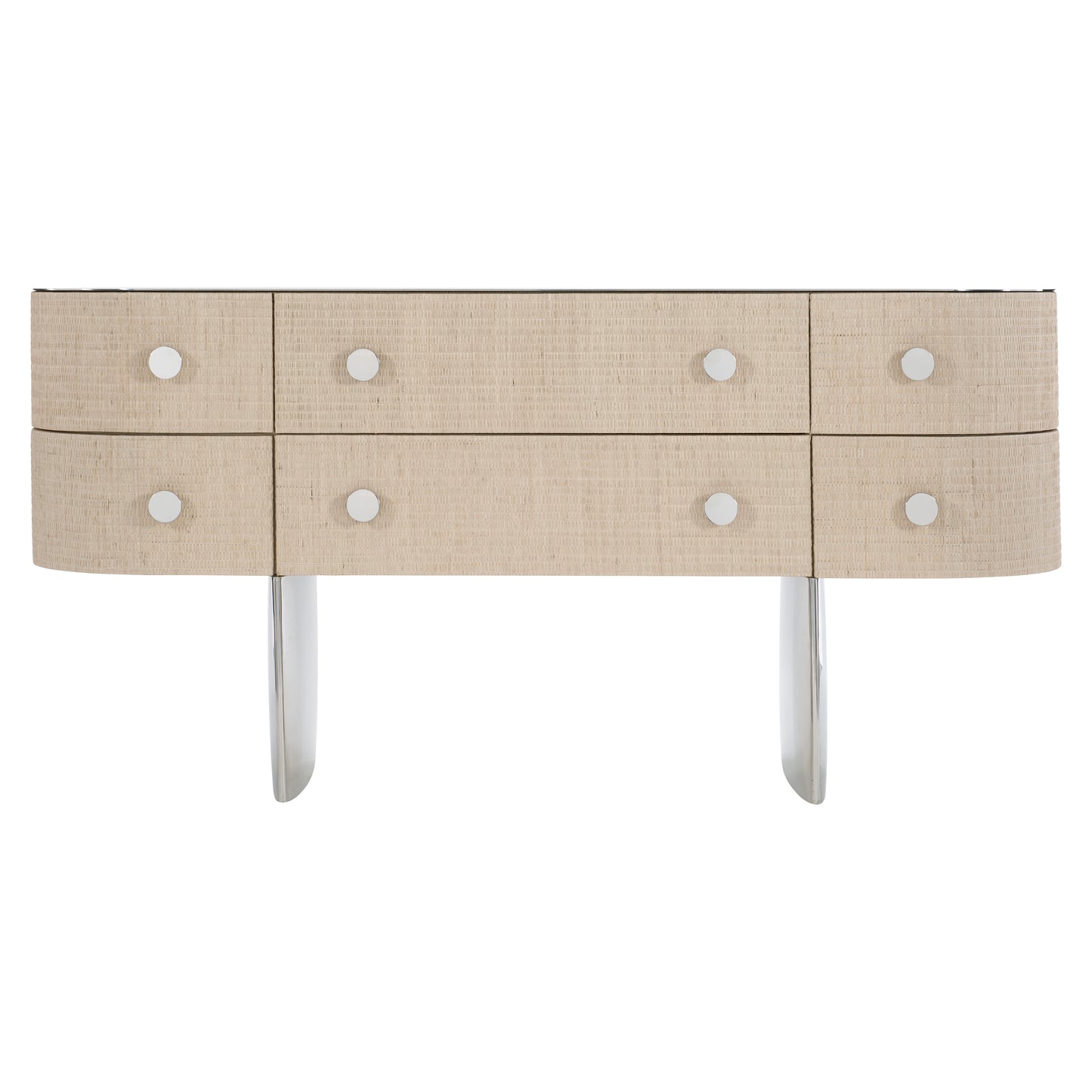 Wrapped woven bleached raffia case. Polished stainless steel top and leg frames. Six soft-close drawers. Adjustable glides. Anti-tip kit. Note: Not designed to support TV &/or other media.
