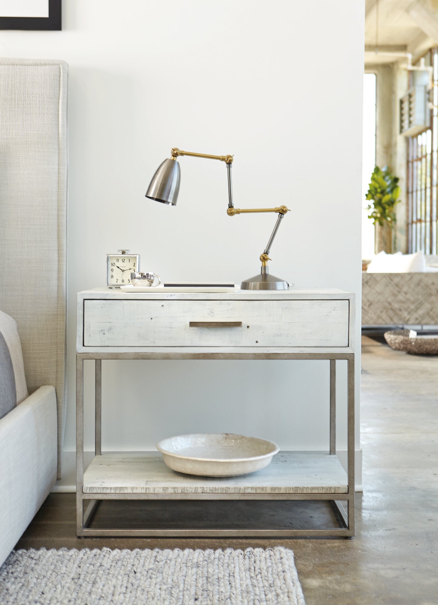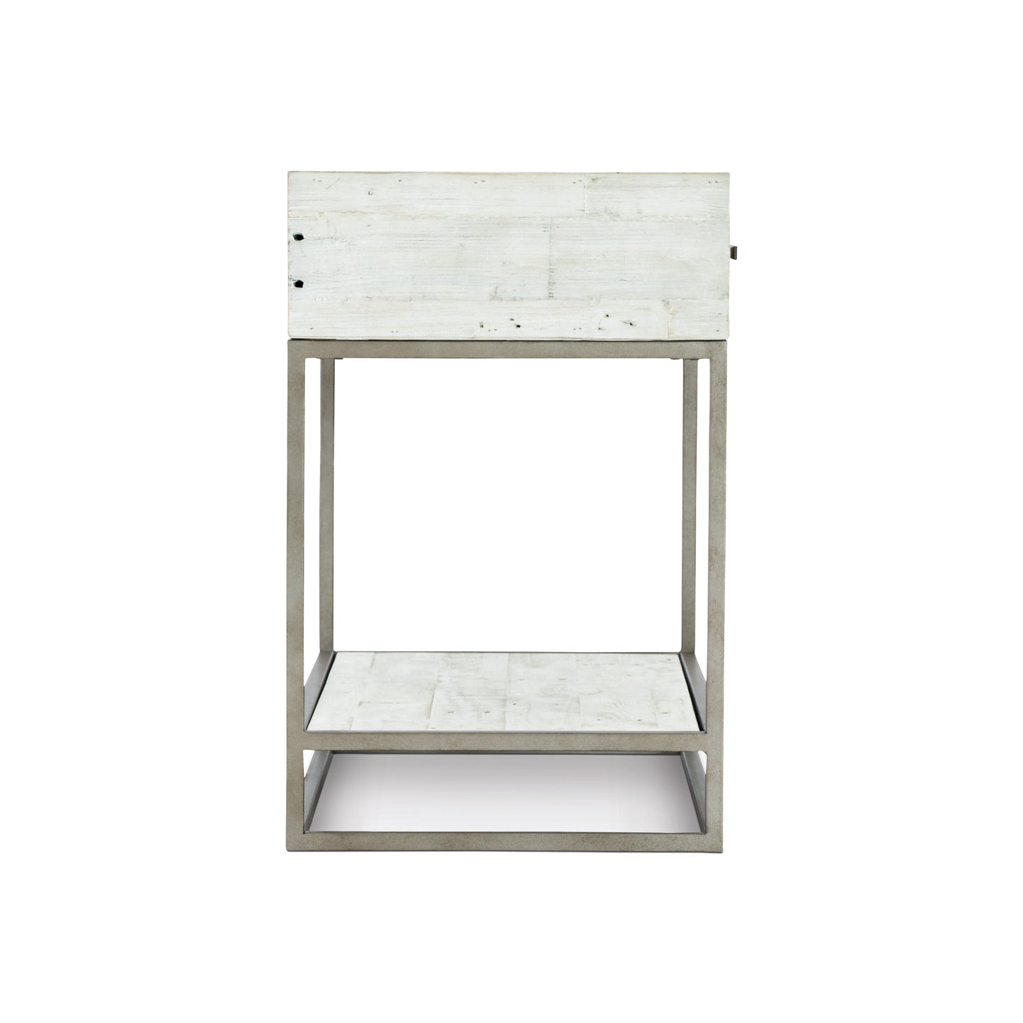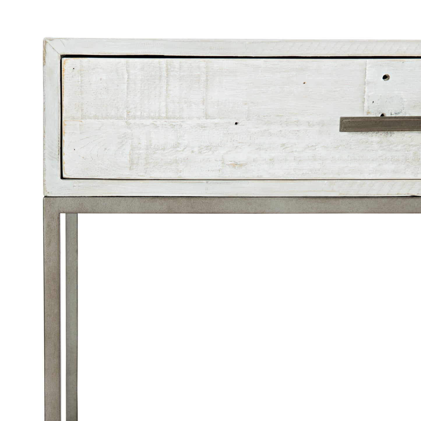 Drawing influence from farmhouse and mid-century design, the Alvar nightstand uses reclaimed wood and rustic metals to create a modern look with a laid-back cool. The drawer box and shelf are crafted from distressed pine in a planked pattern, adding a rugged, organic texture. A Brushed White finish highlights the grain and imperfections in the wood. Finished in glazed silver, the tubular steel base complements the rustic elements with clean lines and a touch of industrial chic.