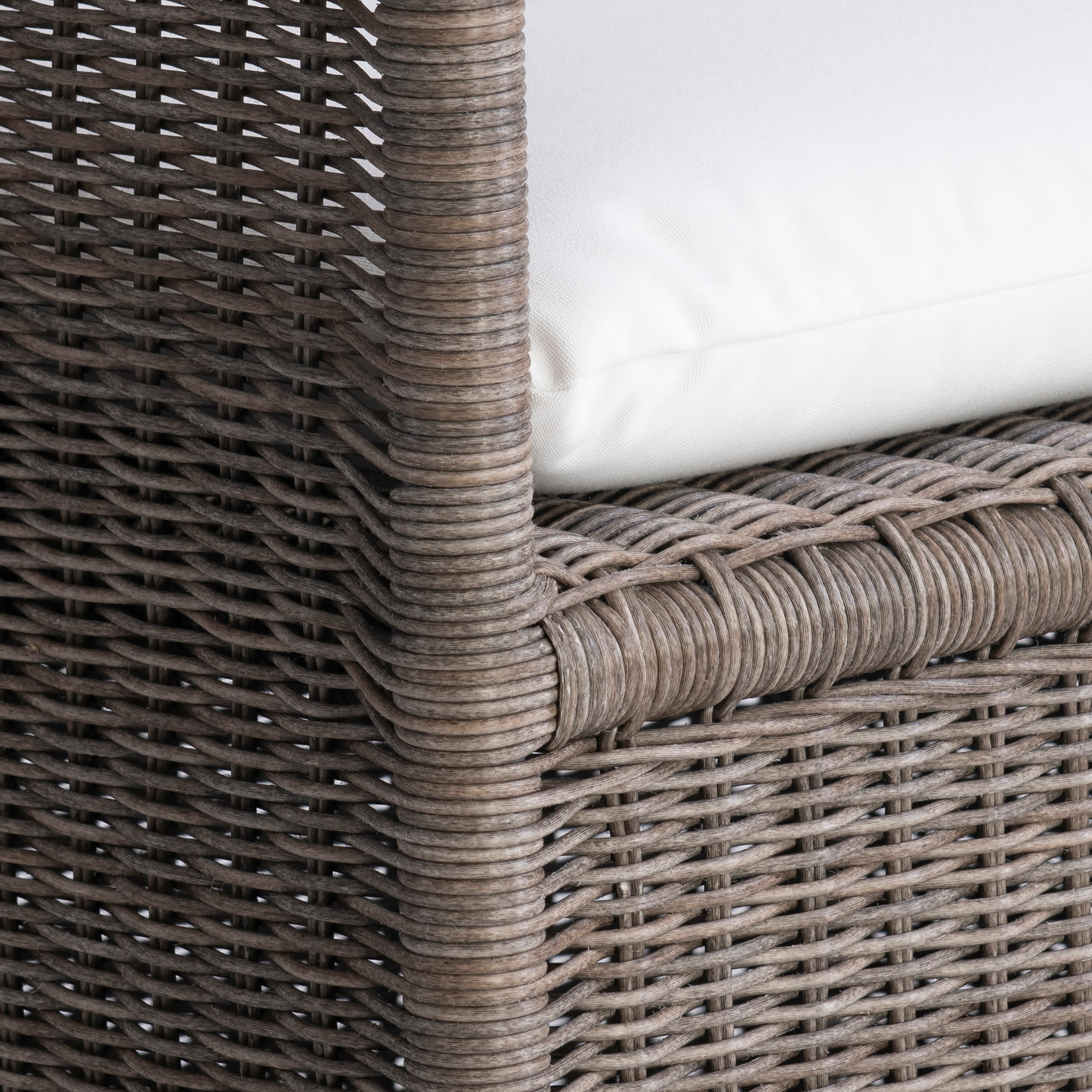 The Amelia outdoor arm chair takes a traditional woven design and gives it a very modern update. Lines are sleeker, and the woven panels go all the way to the floor. A seat cushion also offers comfort for this elevated profile.