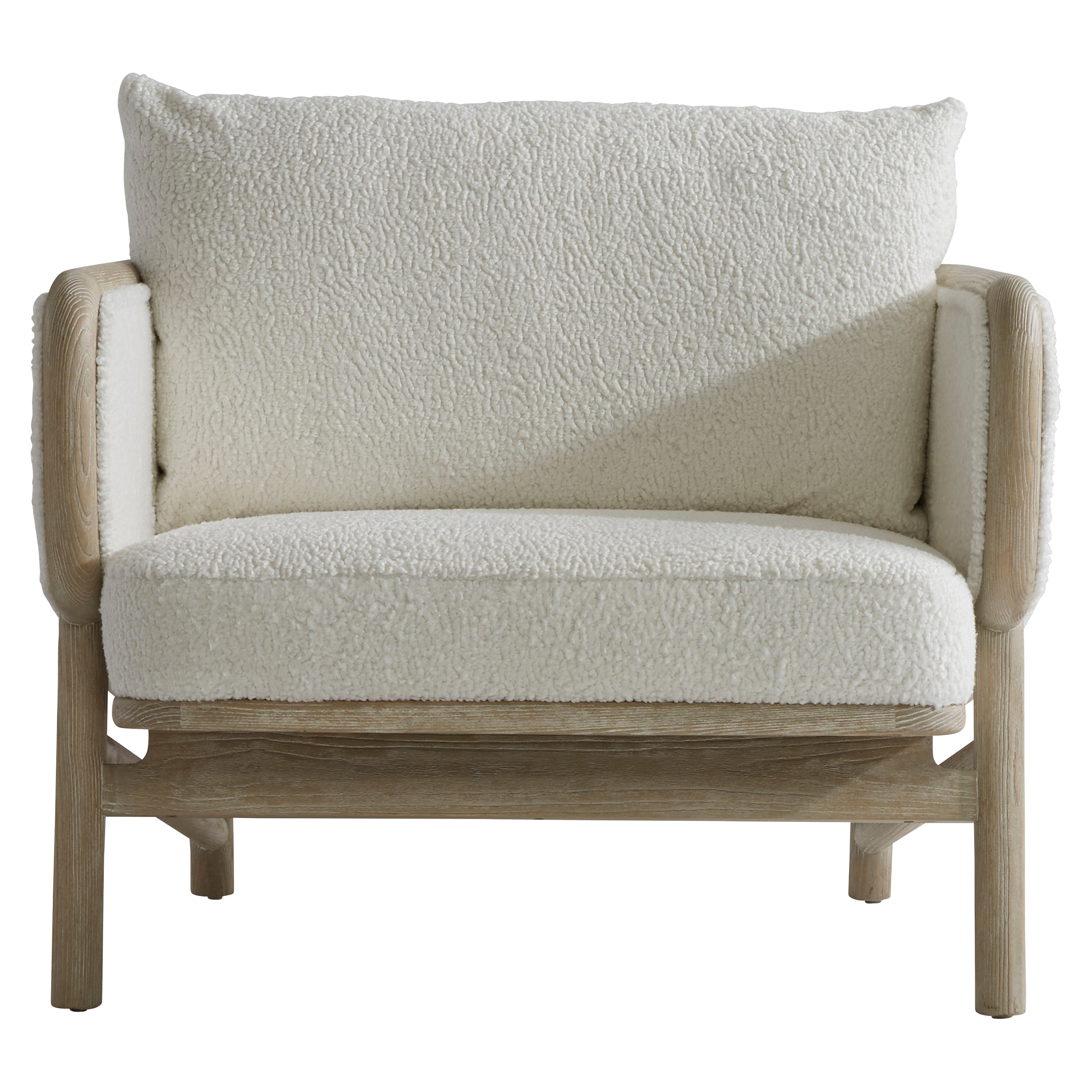 The Anders chair updates the traditional barrel chair shape with modern lines inspired by aerodynamic design. The back wraps around in a swoop of wood-framed fabric, creating curved arms that are connected to the base and legs in a Flaxen finish. The look is both contemporary and nostalgic.