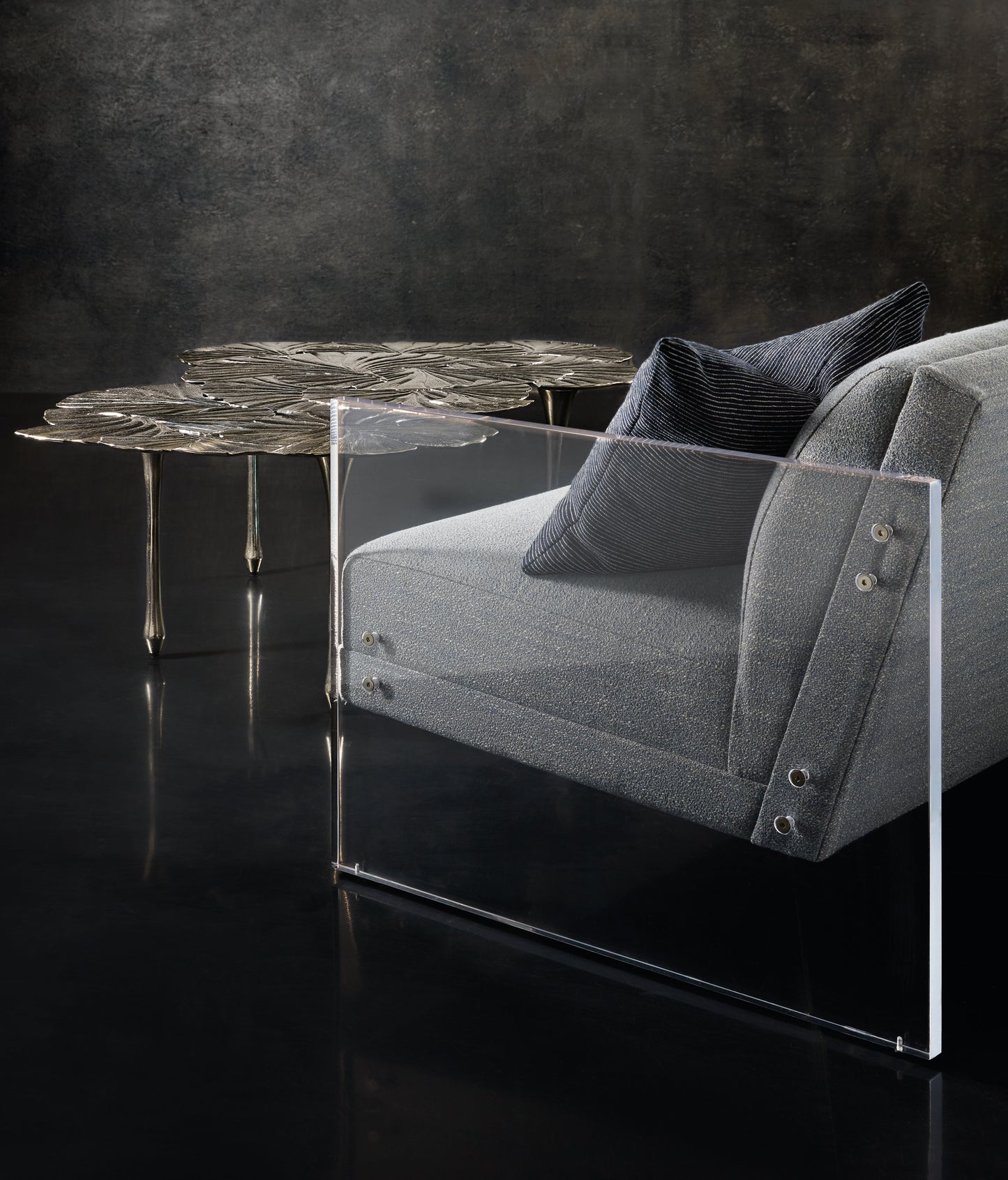 Bernhardt Interiors is an eclectic collection of luxury home furnishings featuring fine craftsmanship, unique materials, and a distinctly modern styling. Inspired by ginkgo leaves, the Annabella cocktail table entices with its organic, sculptural design and subtle shine. Slim tapered legs with spade feet support the elegant tabletop, which resembles leaves floating on the water’s surface. A satin nickel finish gives this cast aluminum table a soft luster, contributing to its delicate, feminine appeal.