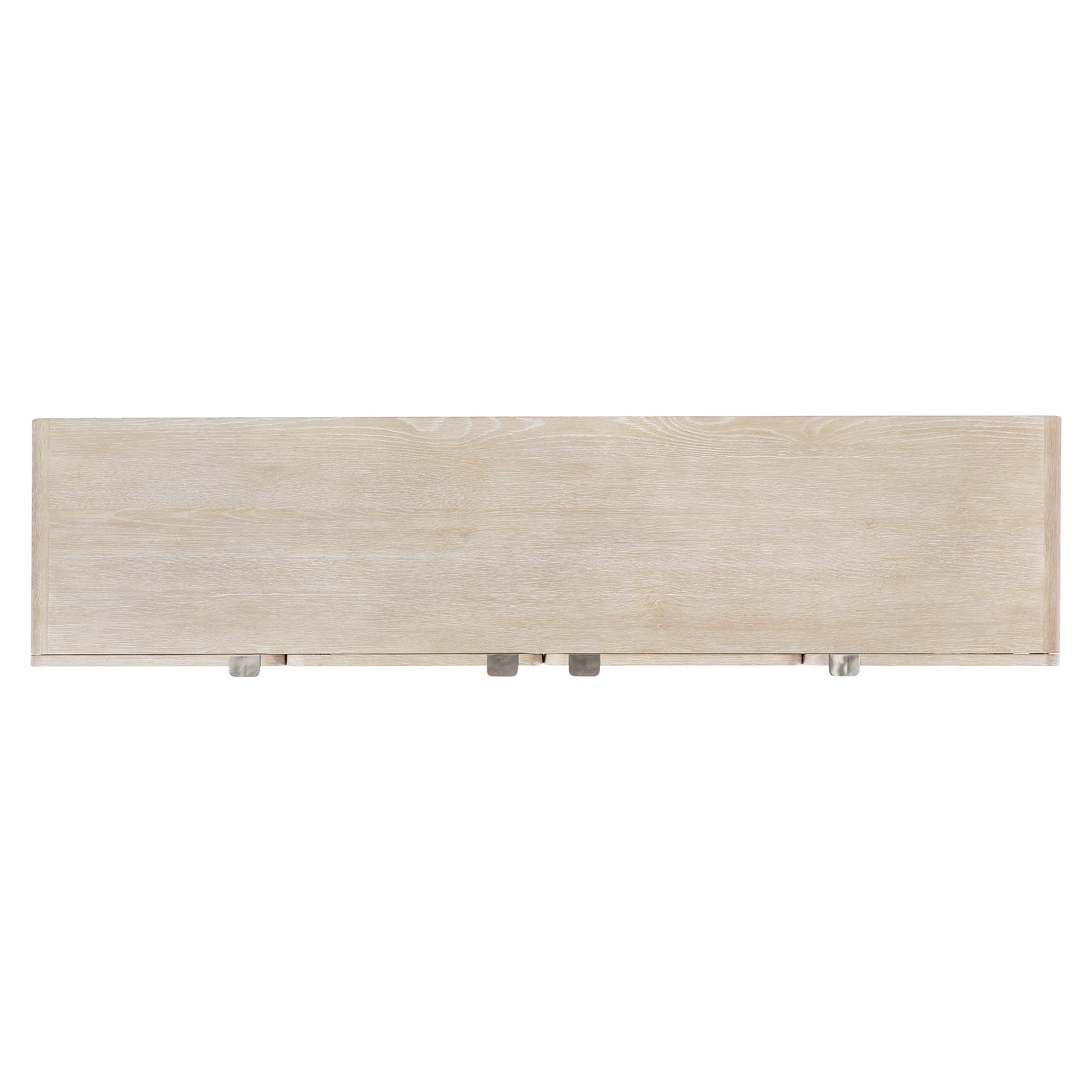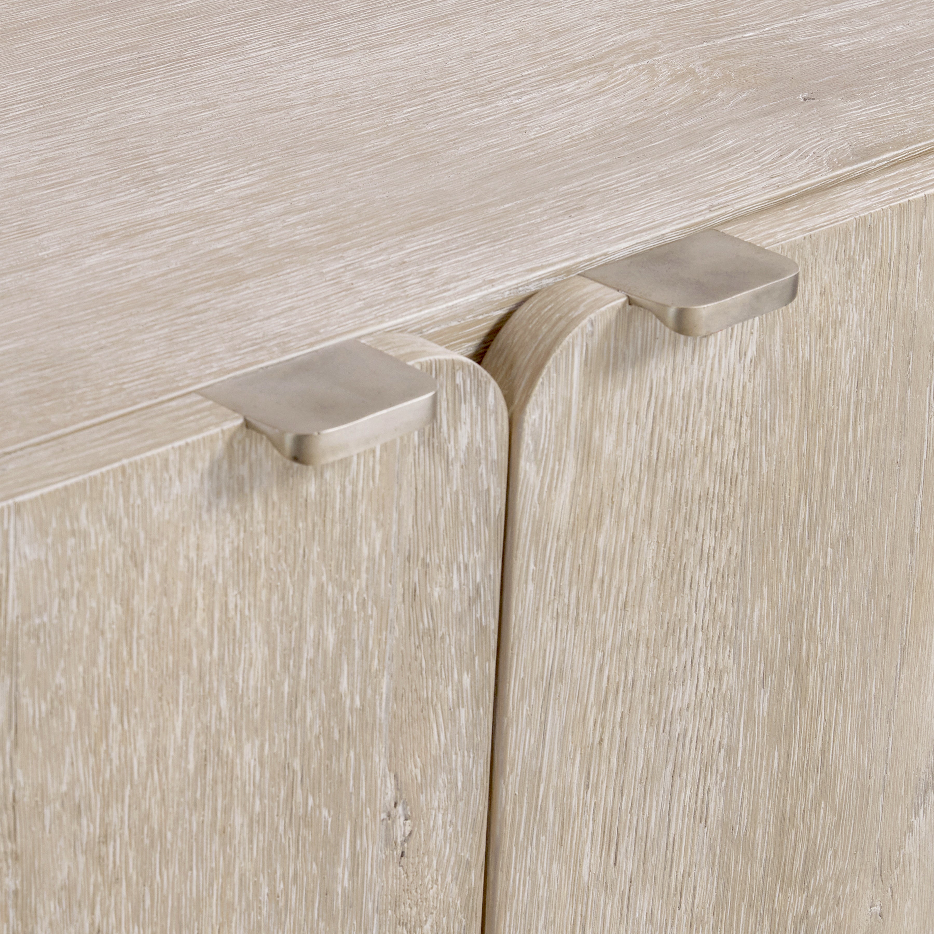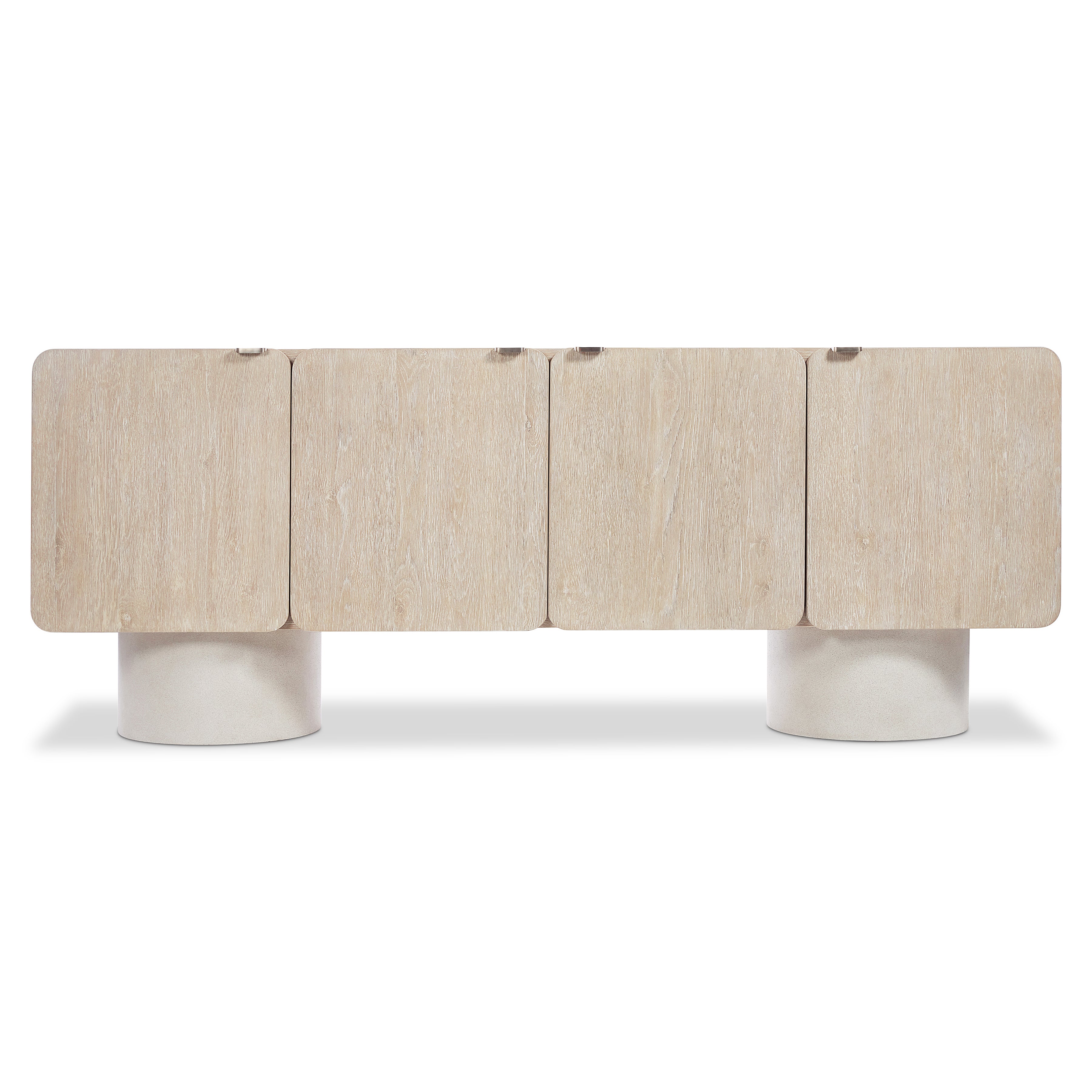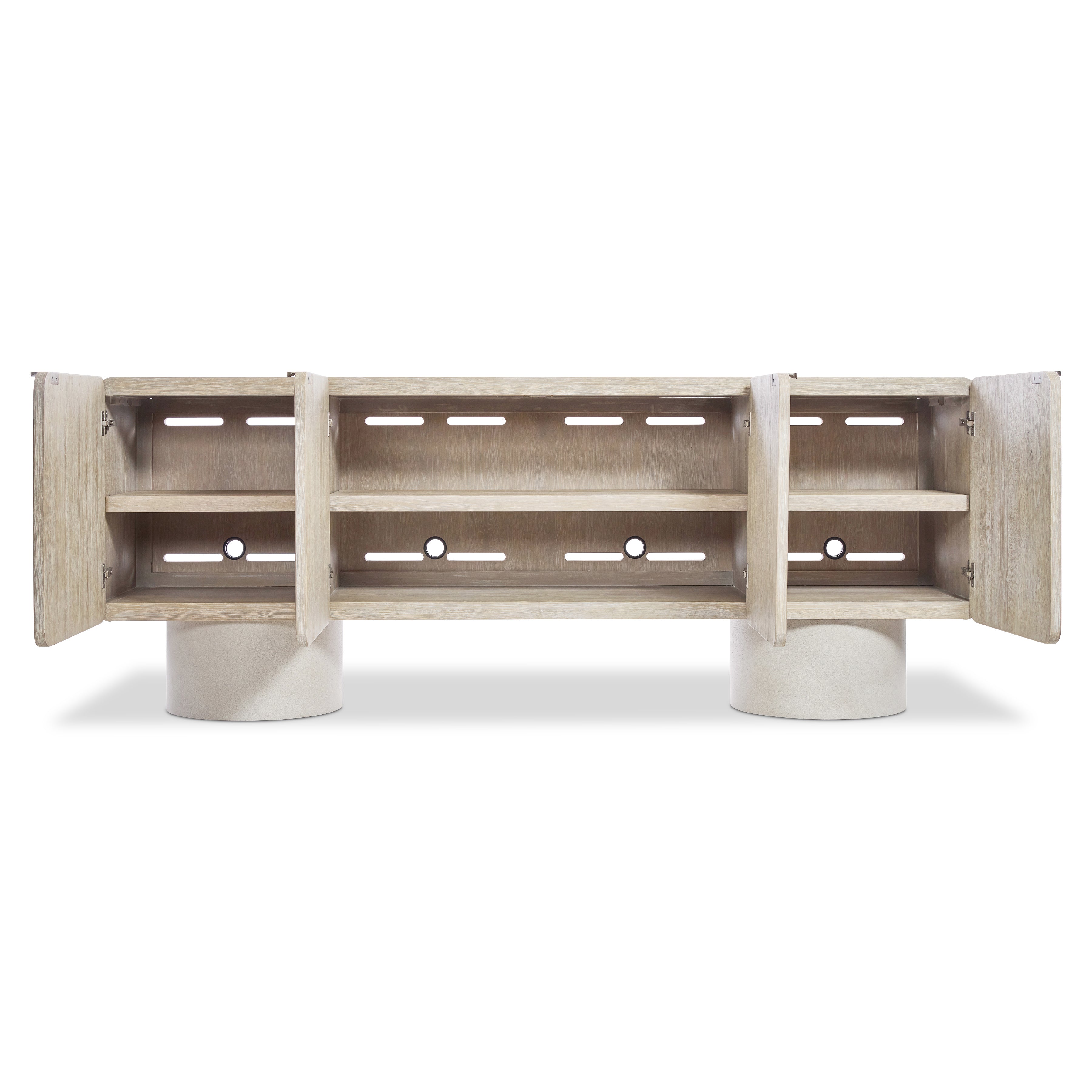 The Antibes entertainment credenza takes an elemental approach to modern organic design. Two round pedestals are deeply textured in glass-reinforced concrete. They support the wooden case in a light Roz finish, with four pull-to-open doors that have cast aluminum tab pulls. Interior storage includes three adjustable shelves.