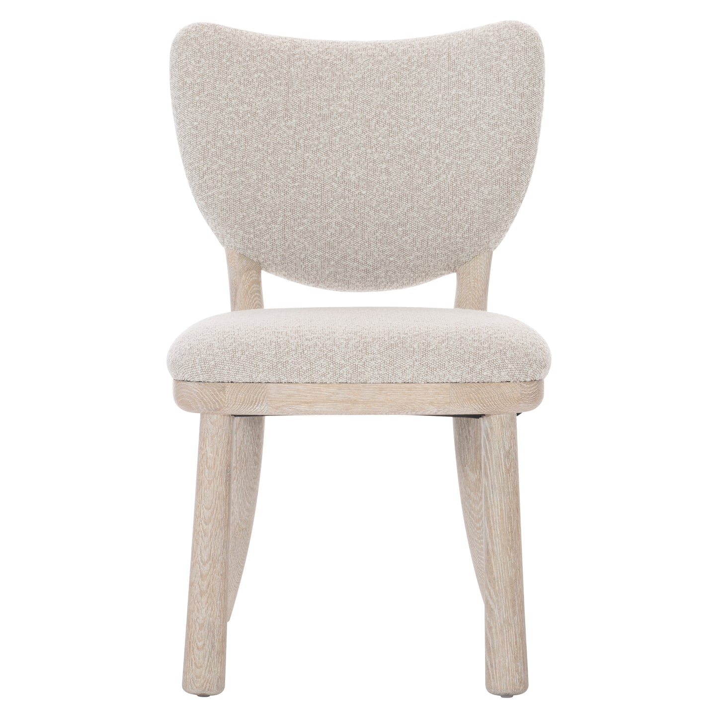 A softened shield back takes on a slight curve for comfort in the Anzu side chair. An exposed wood frame in the Flaxen finish supports an upholstered seat and lifts the back over an open space. It's a modern redesign of farmhouse styling that creates a contemporary rustic look.