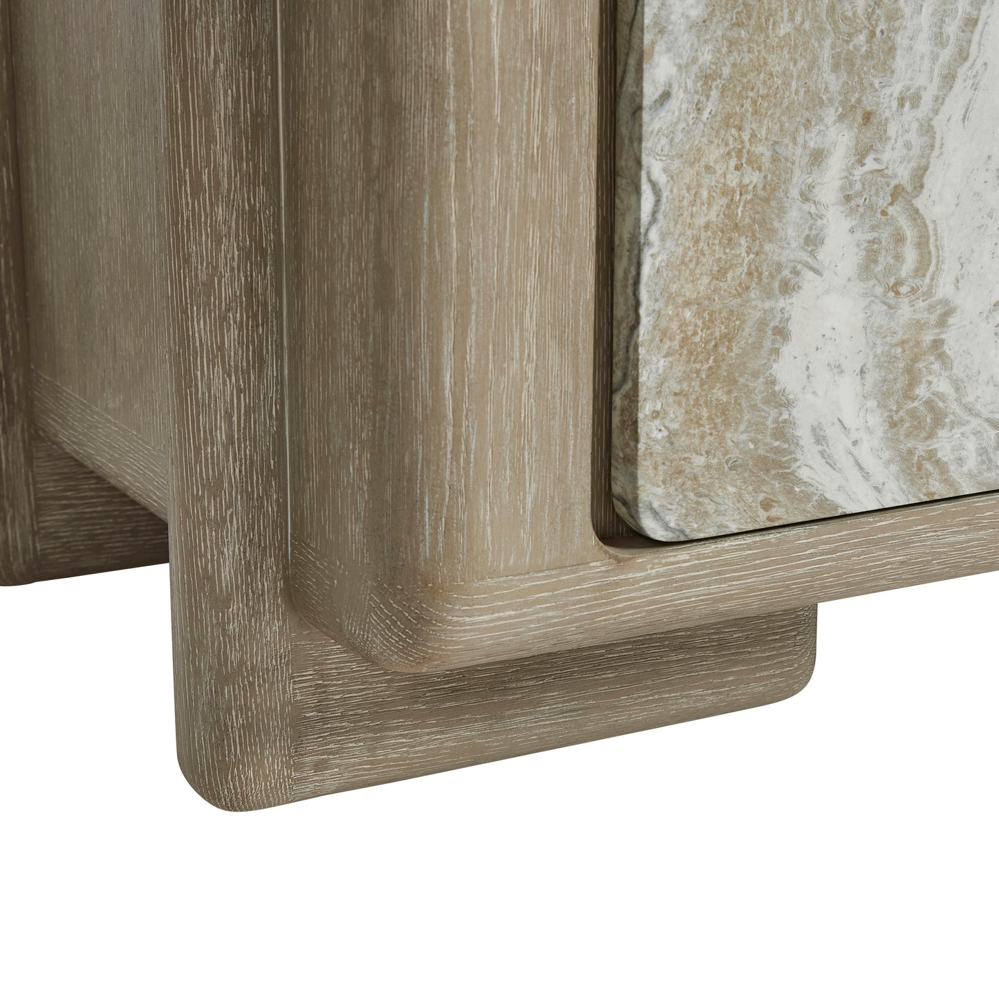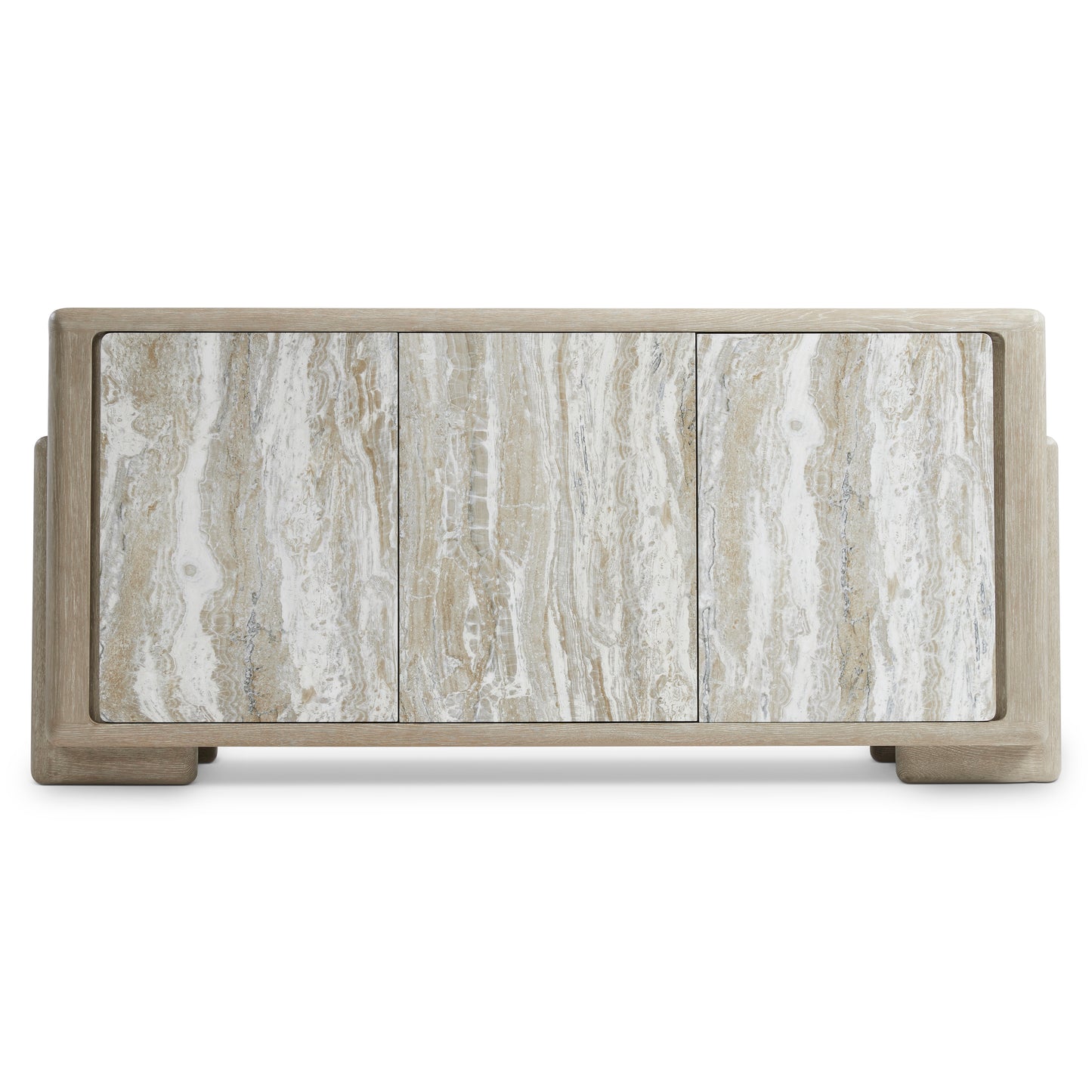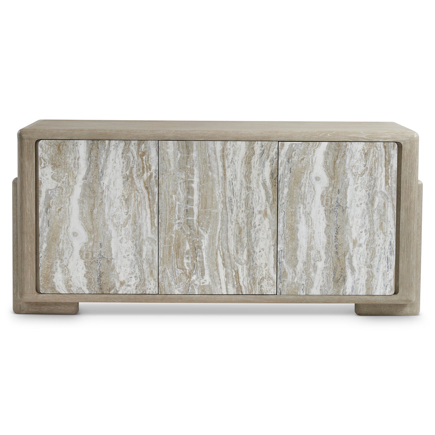 An elemental, serene design marks this stunning Arcadia buffet. The three doors have faux stone overlays in Kalta finish that mimic flowing woodgrain or swirls of natural marble. The wire-brushed oak case in Clay finish offers a tactile element, while the interior provides necessary functionality.