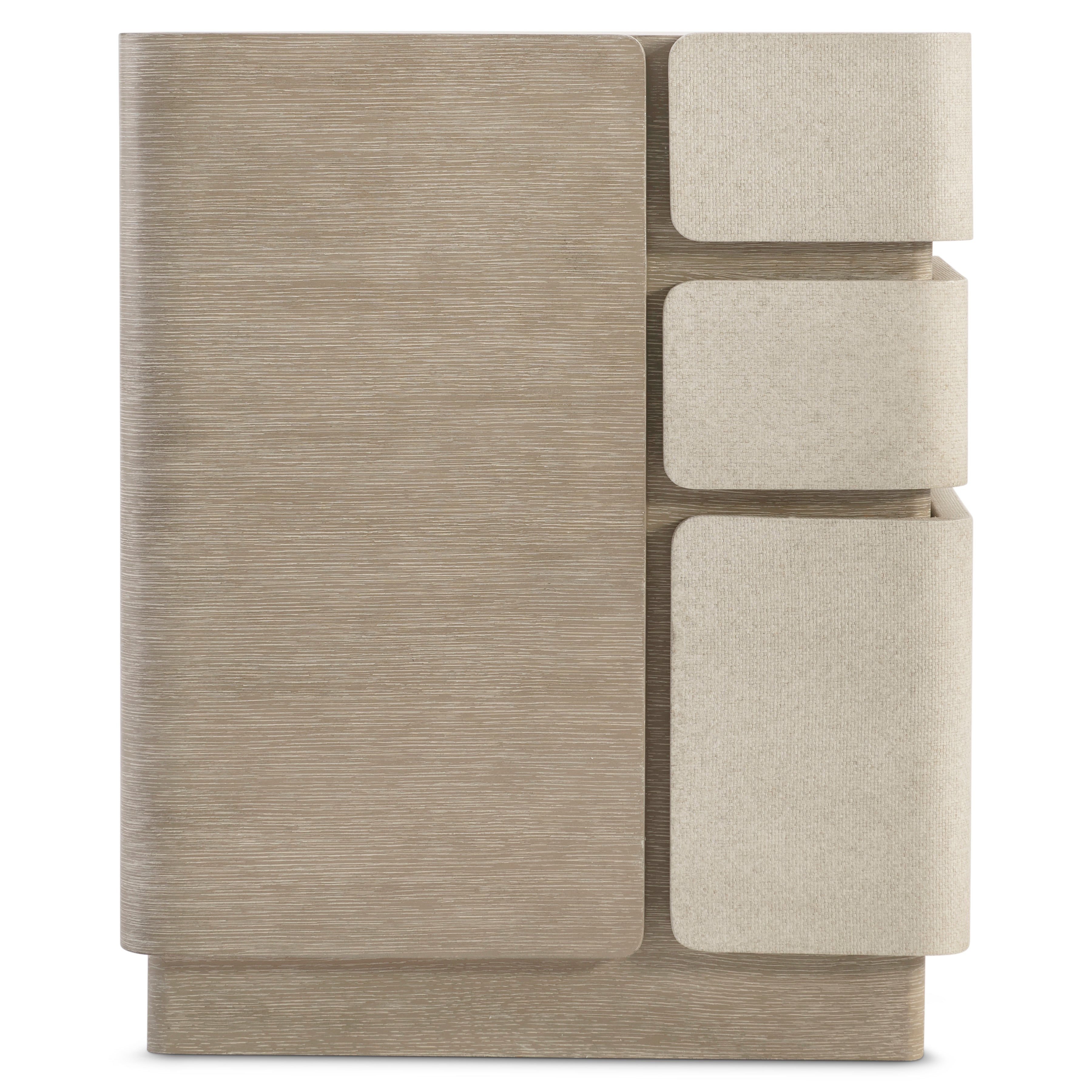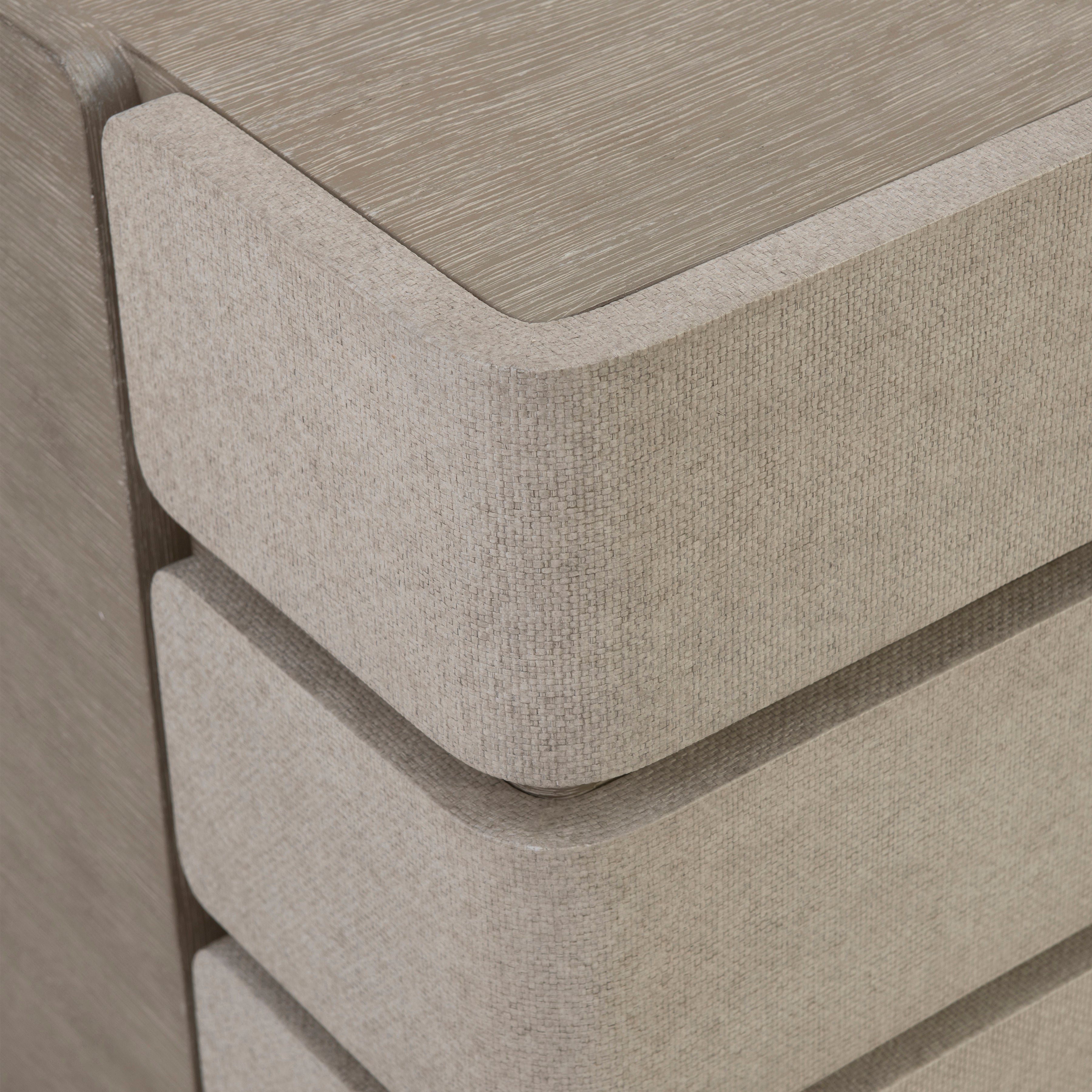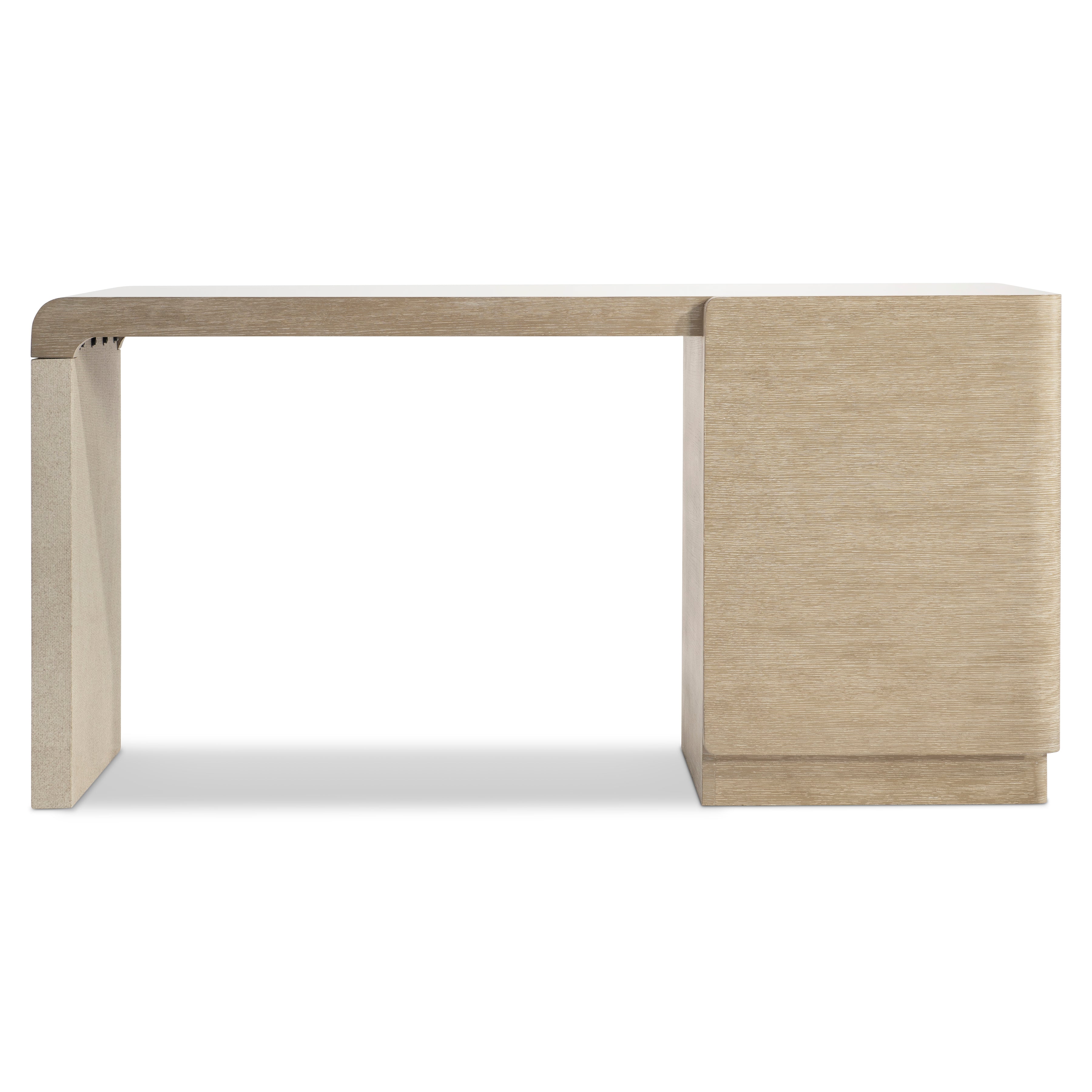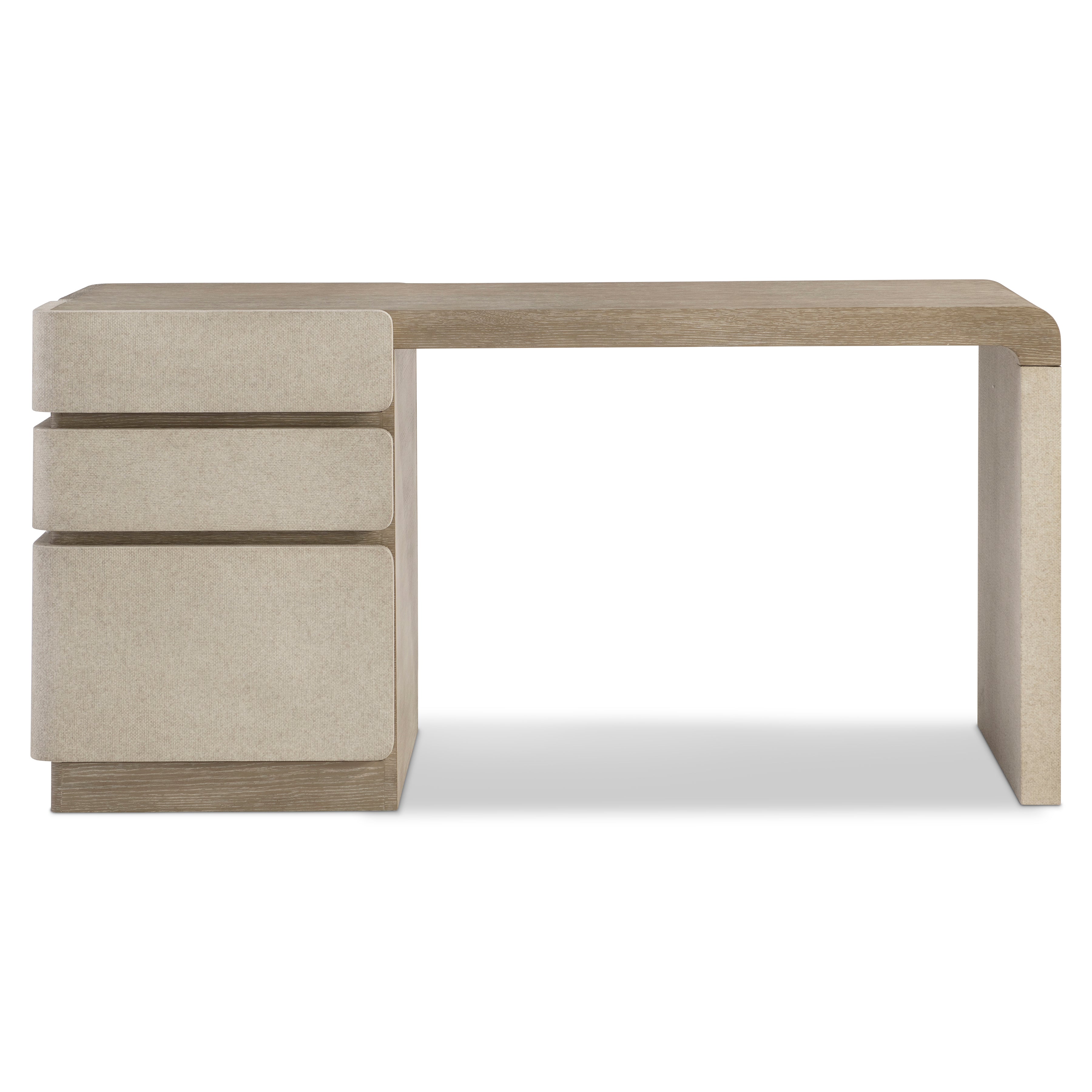 Tactile materials showcase an elemental style on the Arcadia desk. Raffia wraps a support panel and three drawer fronts, curving around the sides for a unique design. The wire-brushed wood is in Clay finish.