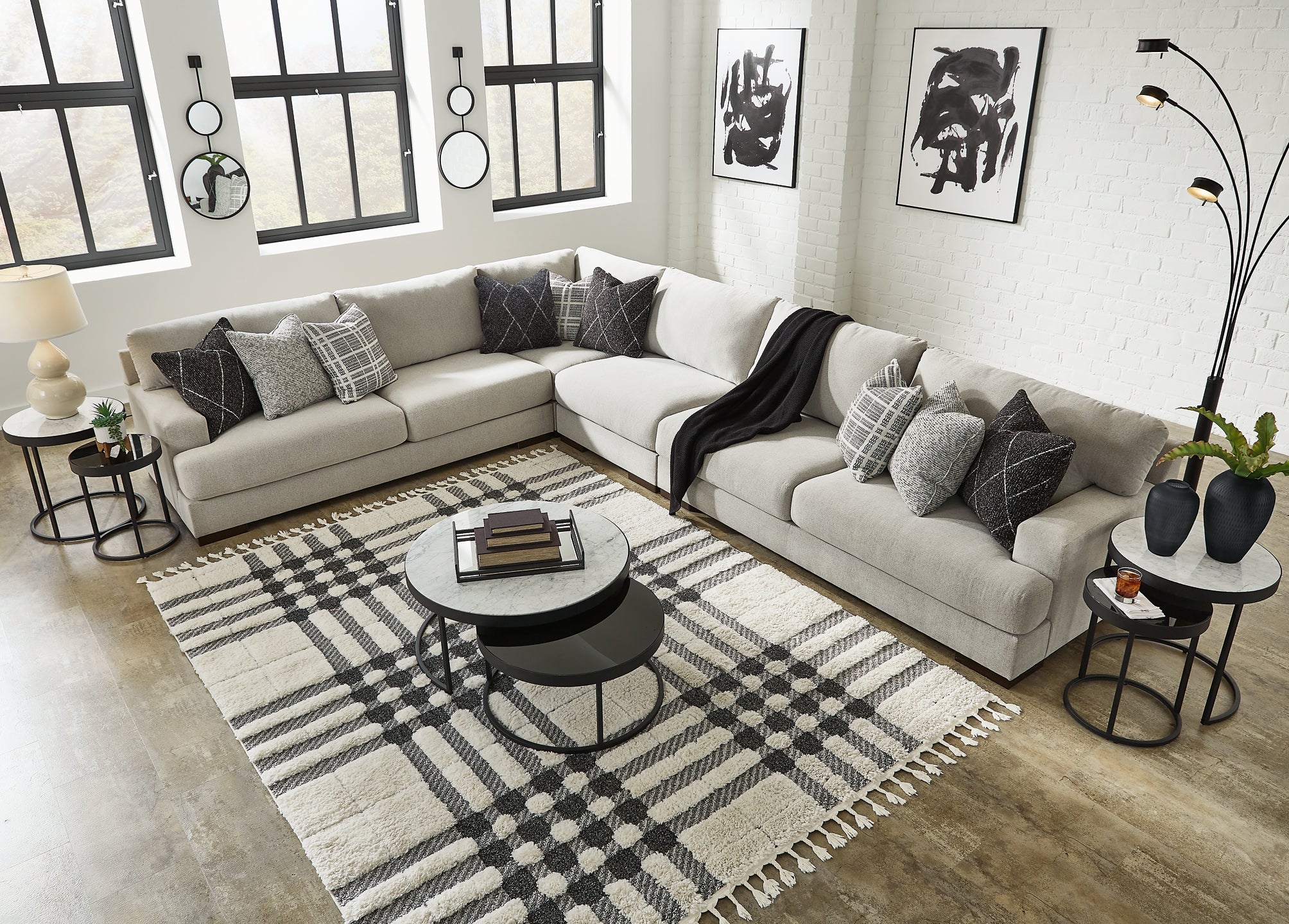 This sectional is a beautiful case of oversized space—fully utilized. Its generous scale ensures that everyone has a place to kick back and relax in style. Stunning in light gray, its cool color is only part of the story, a bevy of black and white accent pillows ensures a happy landing for everyone.