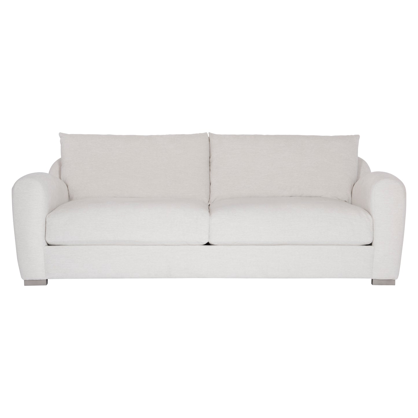 The Asher sofa has a unique frame with high-loft curved arms and a shaped back. Comfort comes from fiber back pillows, as well as four Blendown throw pillows. The enticing shape and deep seat creates a luxuriously restful statement.
