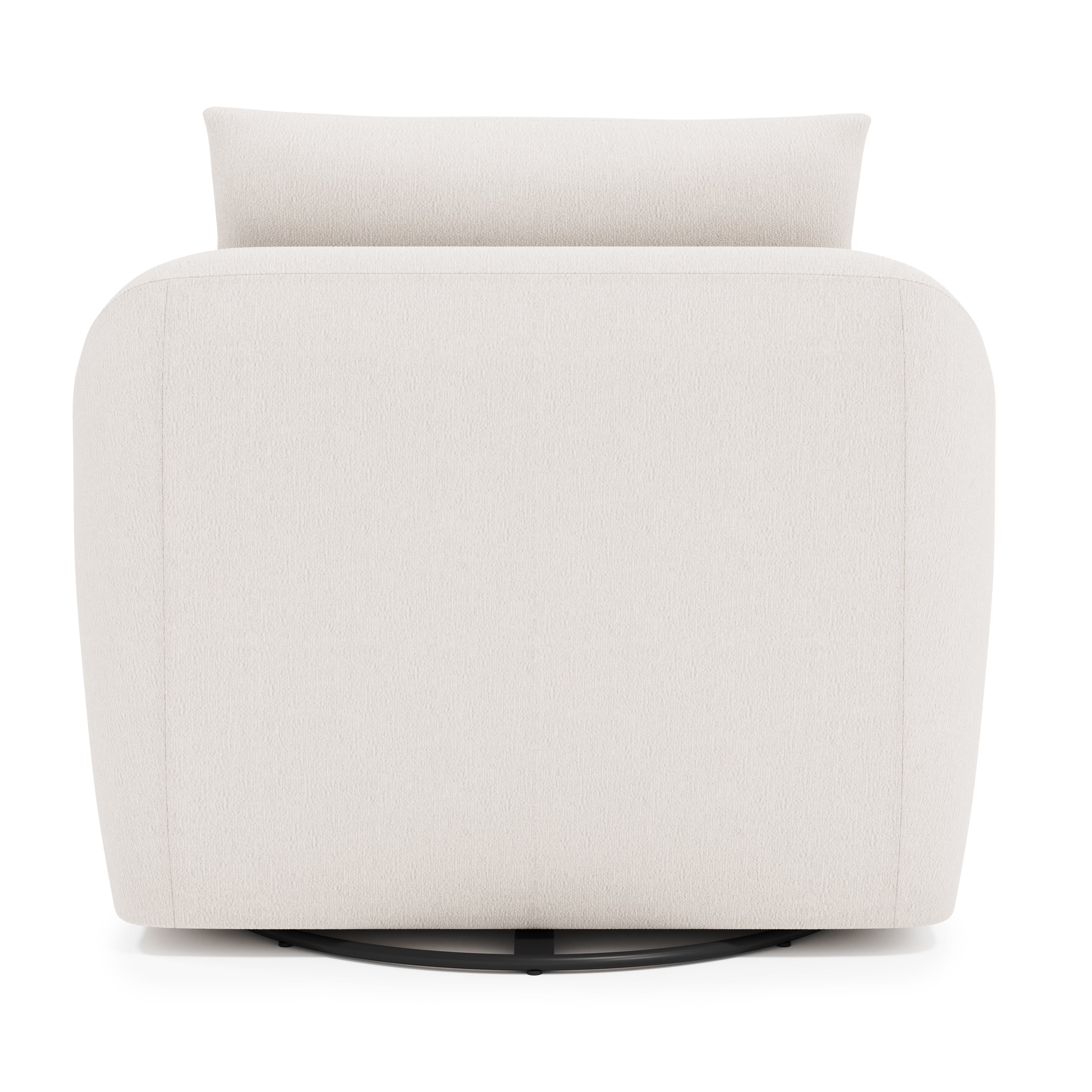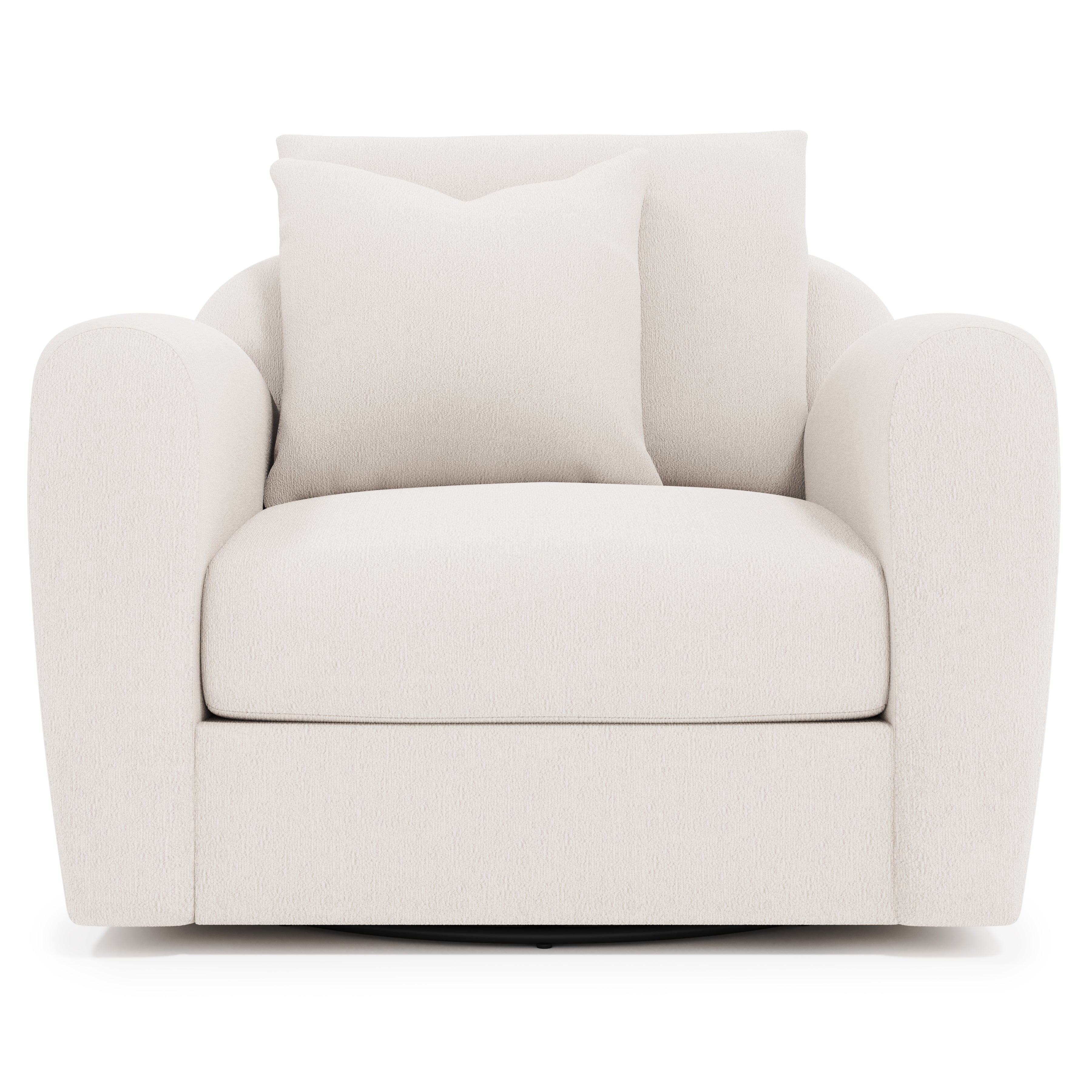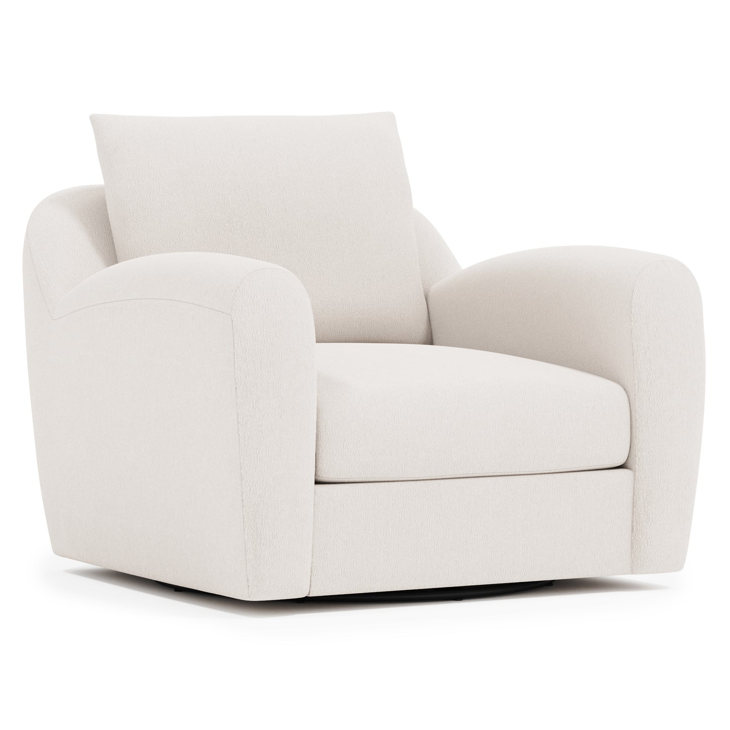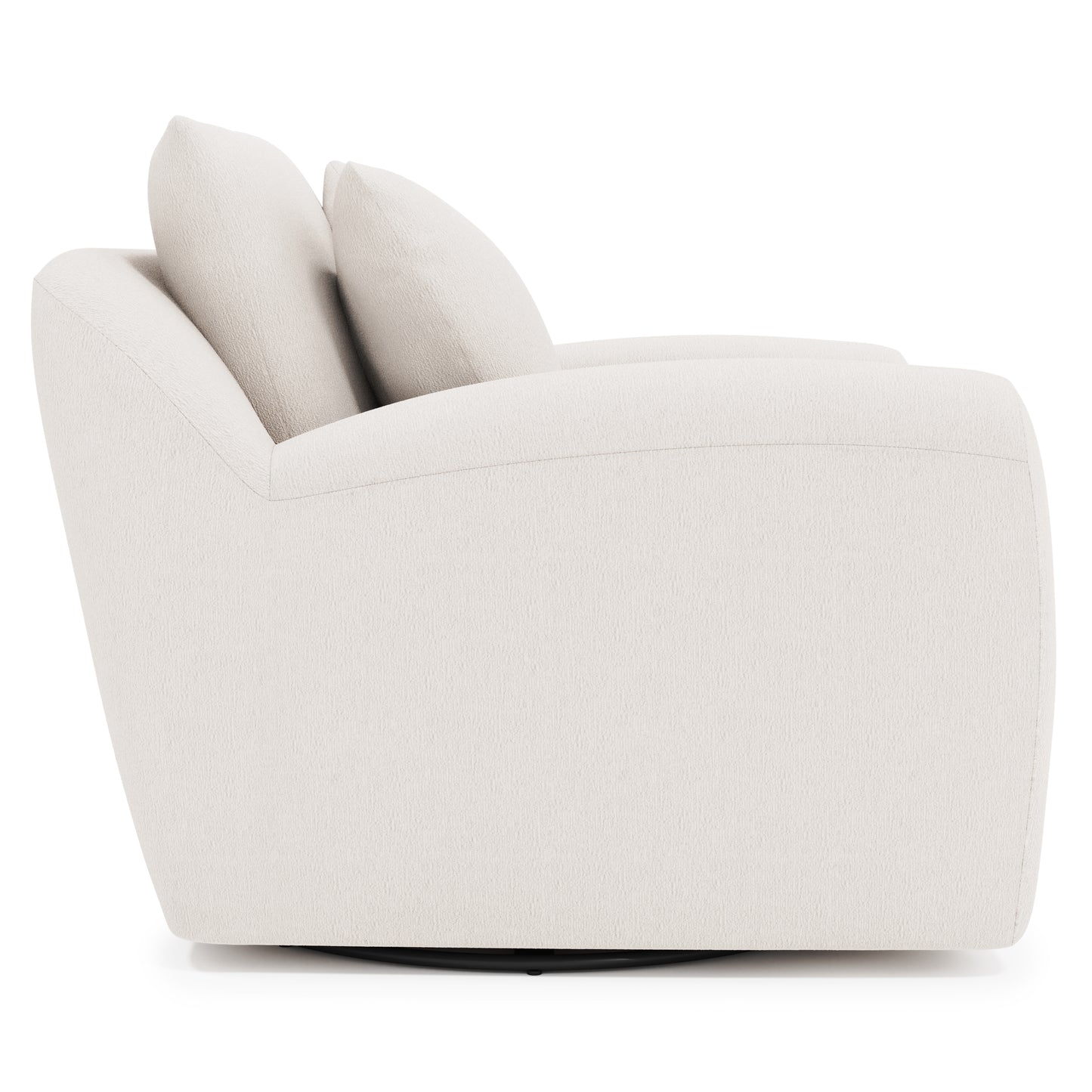 The Asher swivel chair has a unique frame, with high-loft curved arms and a shaped back. Comfort comes from a knife-edge back pillow, and a Blendown throw pillow. The enticing shape, swivel base and deep seat create a luxuriously restful statement.
