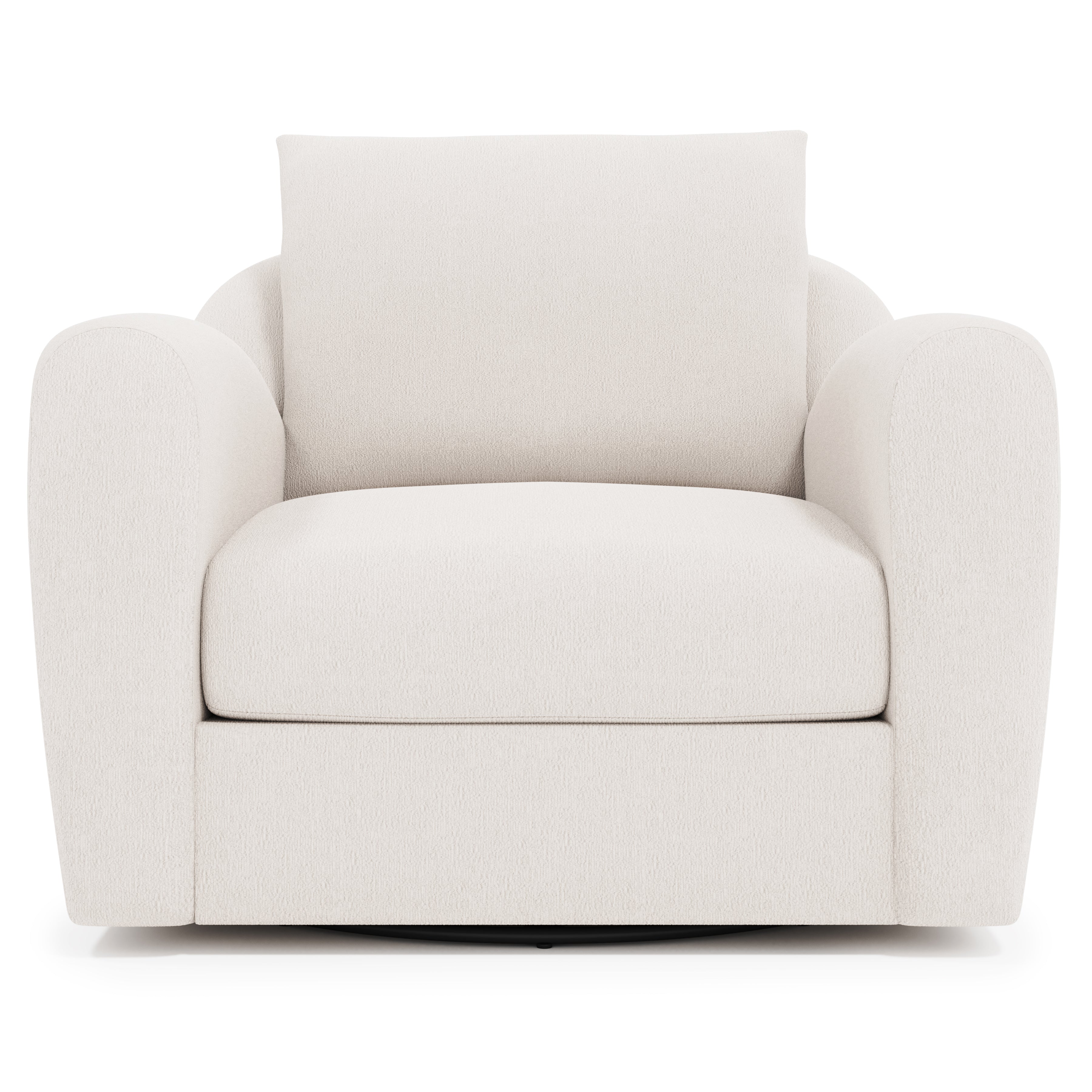 The Asher swivel chair has a unique frame with high-loft curved arms and a shaped back. Comfort comes from a knife-edge back pillow, and a Plush feather down seat cushion. The enticing shape, swivel base and deep seat create a luxuriously restful statement.
