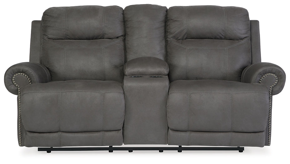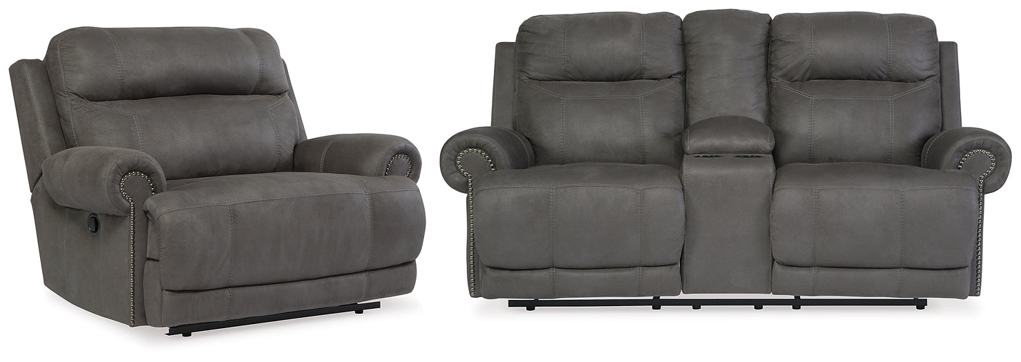 Sparing that "puffy" look you might expect from a recliner, this reclining loveseat and recliner set doesn't hold back when it comes to contemporary style. Subtle touches such as sporty jumbo stitching, nailhead trim and a "weather worn" effect on the upholstery give this handsome set a buttoned-up appeal and fresh feel. Loveseat's center console with dual cup holders brings a handy element to the arrangement.