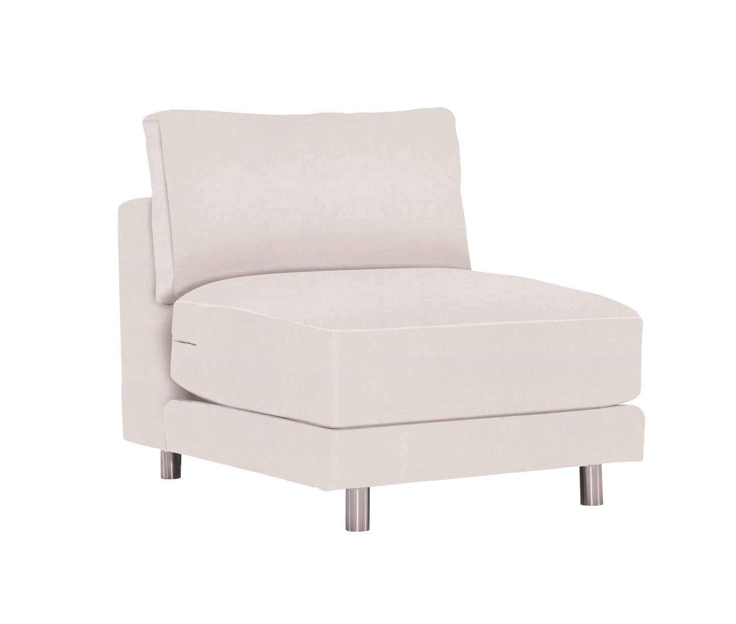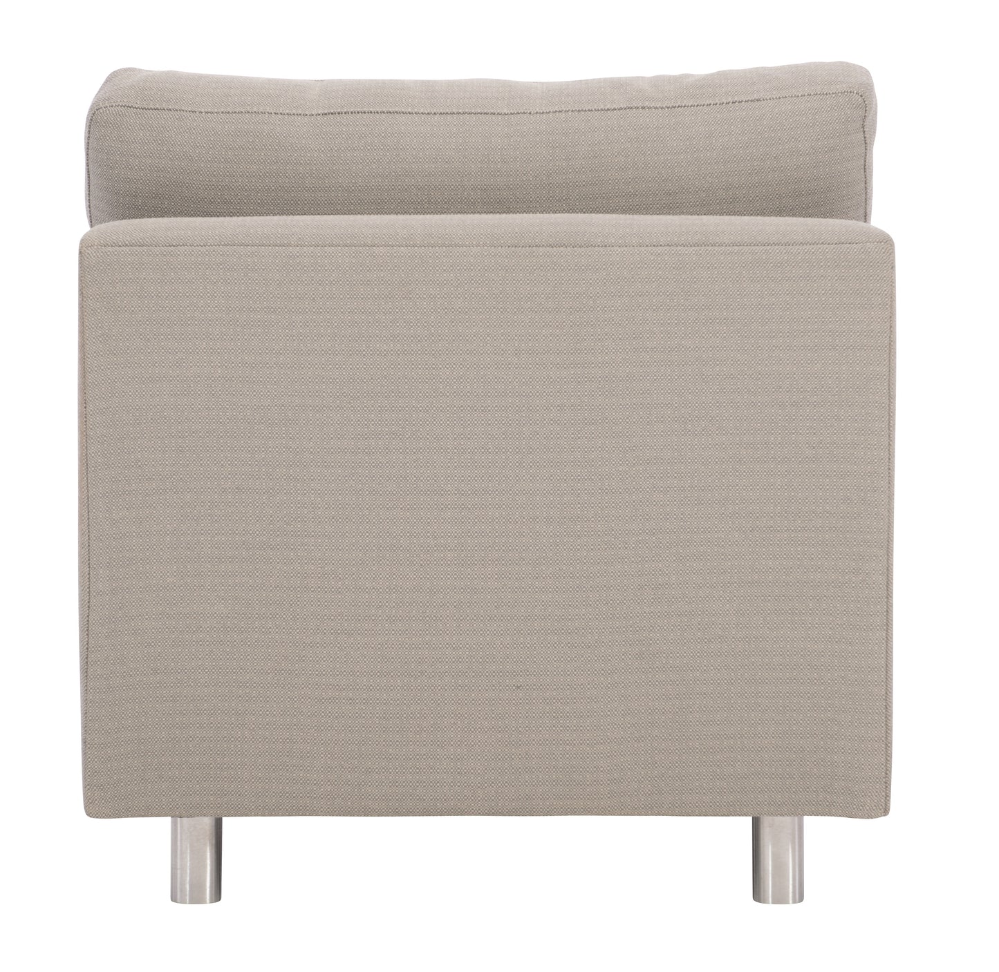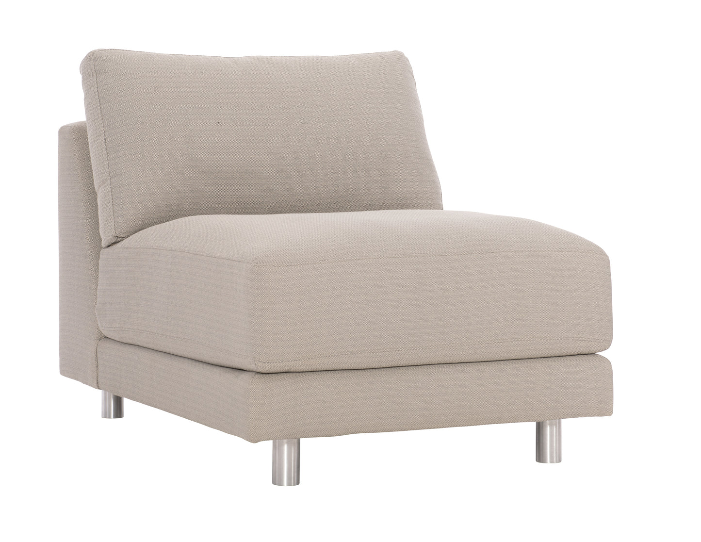 Bernhardt Exteriors is characterized by exceptional luxury, ultimate comfort and elegant design. The clean, modern design of the Avanni armless chair features a linear, low-profile frame and cylindrical aluminum legs. Plush cushions create a soft, inviting look.