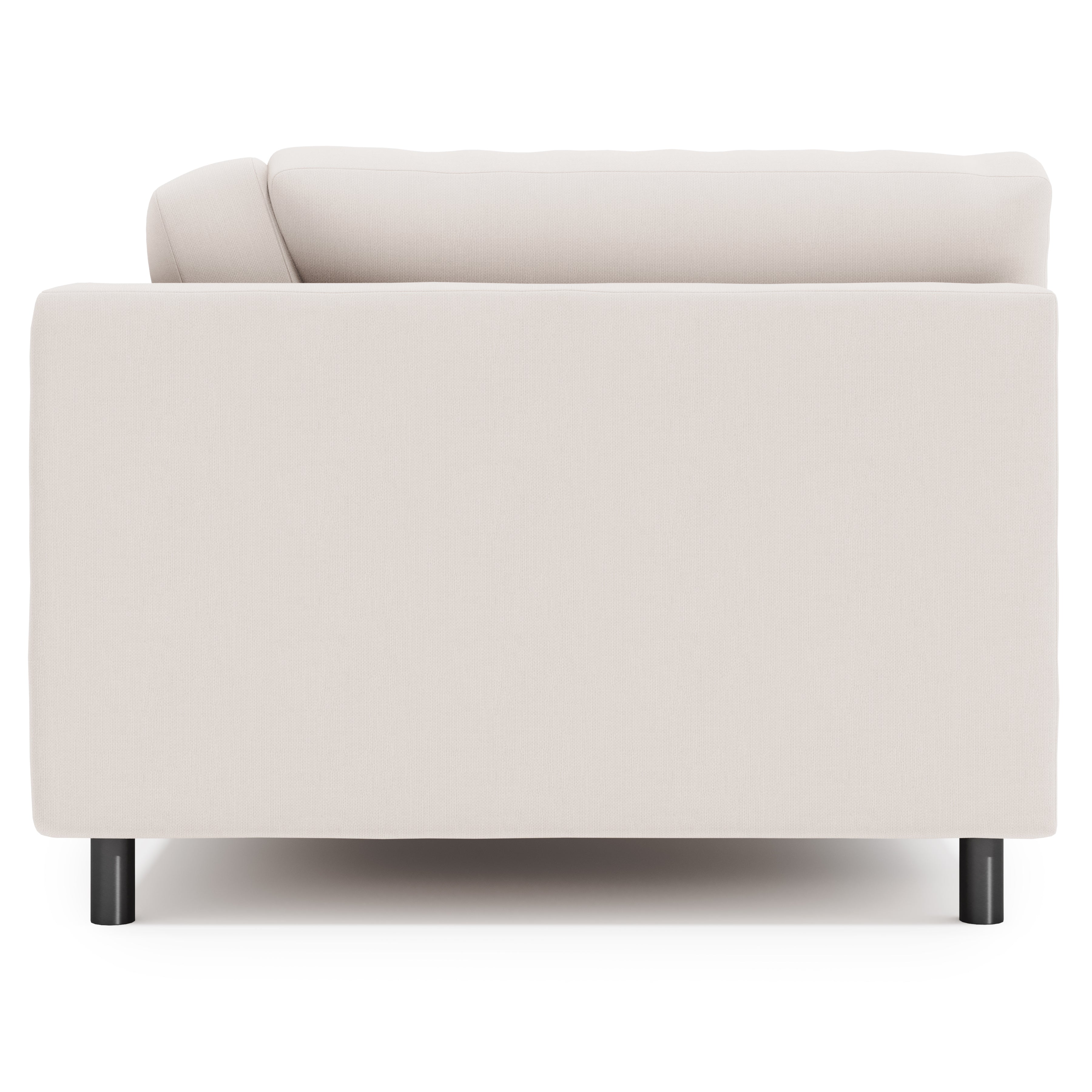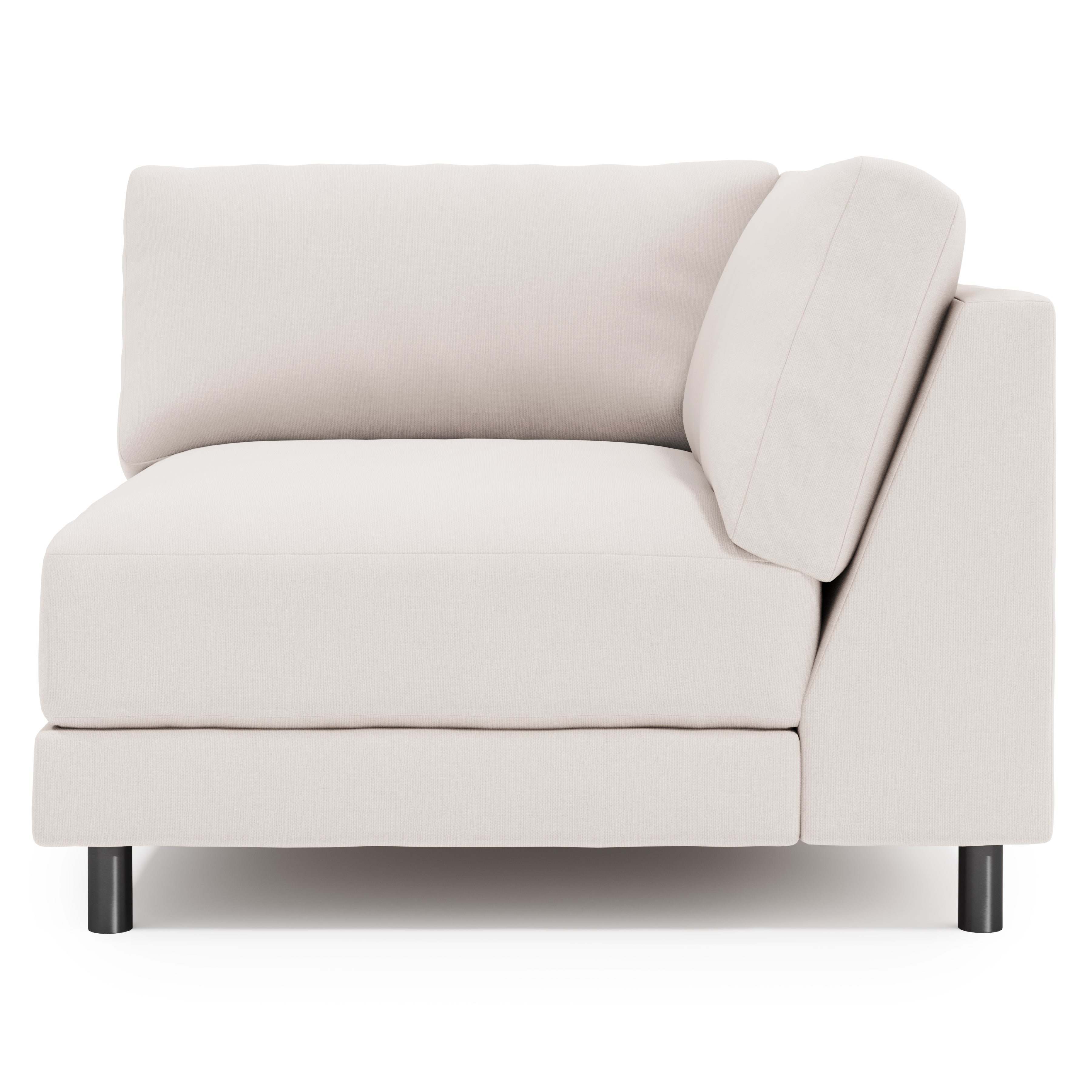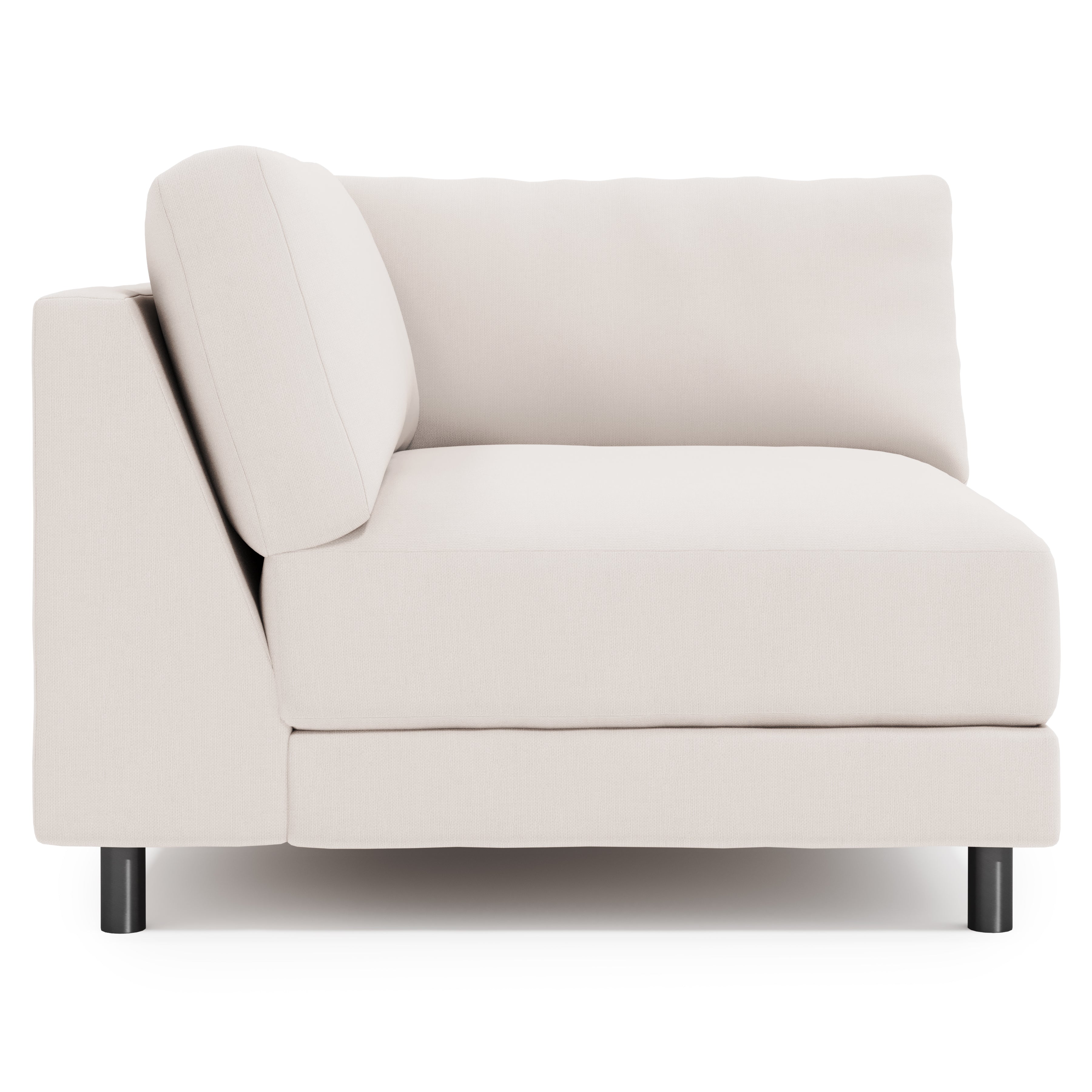 Bernhardt Exteriors is characterized by exceptional luxury, ultimate comfort and elegant design. The clean, modern design of the Avanni corner chair features a linear, low-profile frame and cylindrical aluminum legs in matte black finish. Plush cushions create a soft, inviting look.