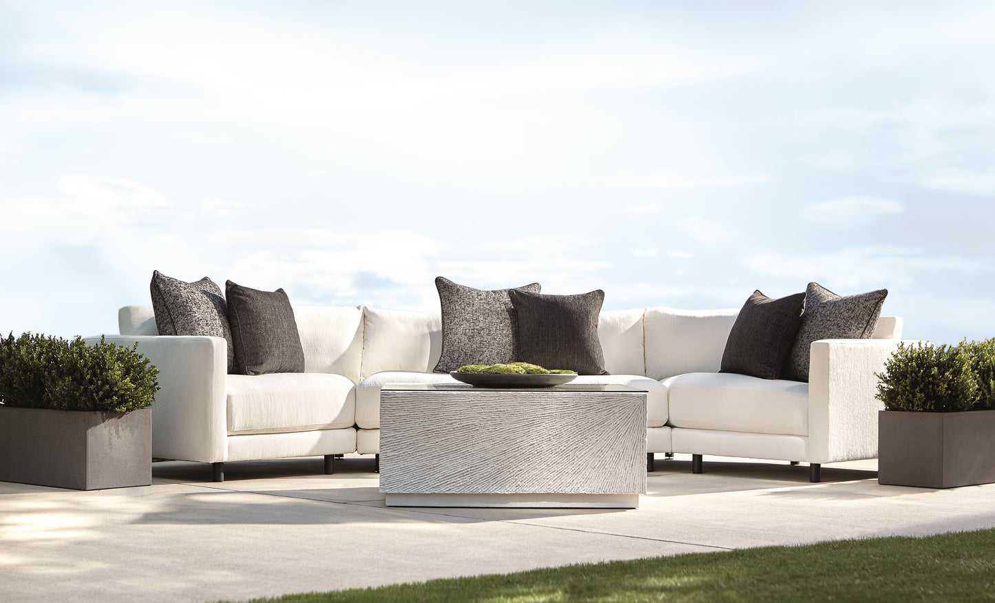 Bernhardt Exteriors is characterized by exceptional luxury, ultimate comfort and elegant design. The clean, modern design of the Avanni right arm cuddler features a linear, low-profile frame, a track arm and cylindrical aluminum legs in matte black finish. Plush cushions create a soft, inviting look.