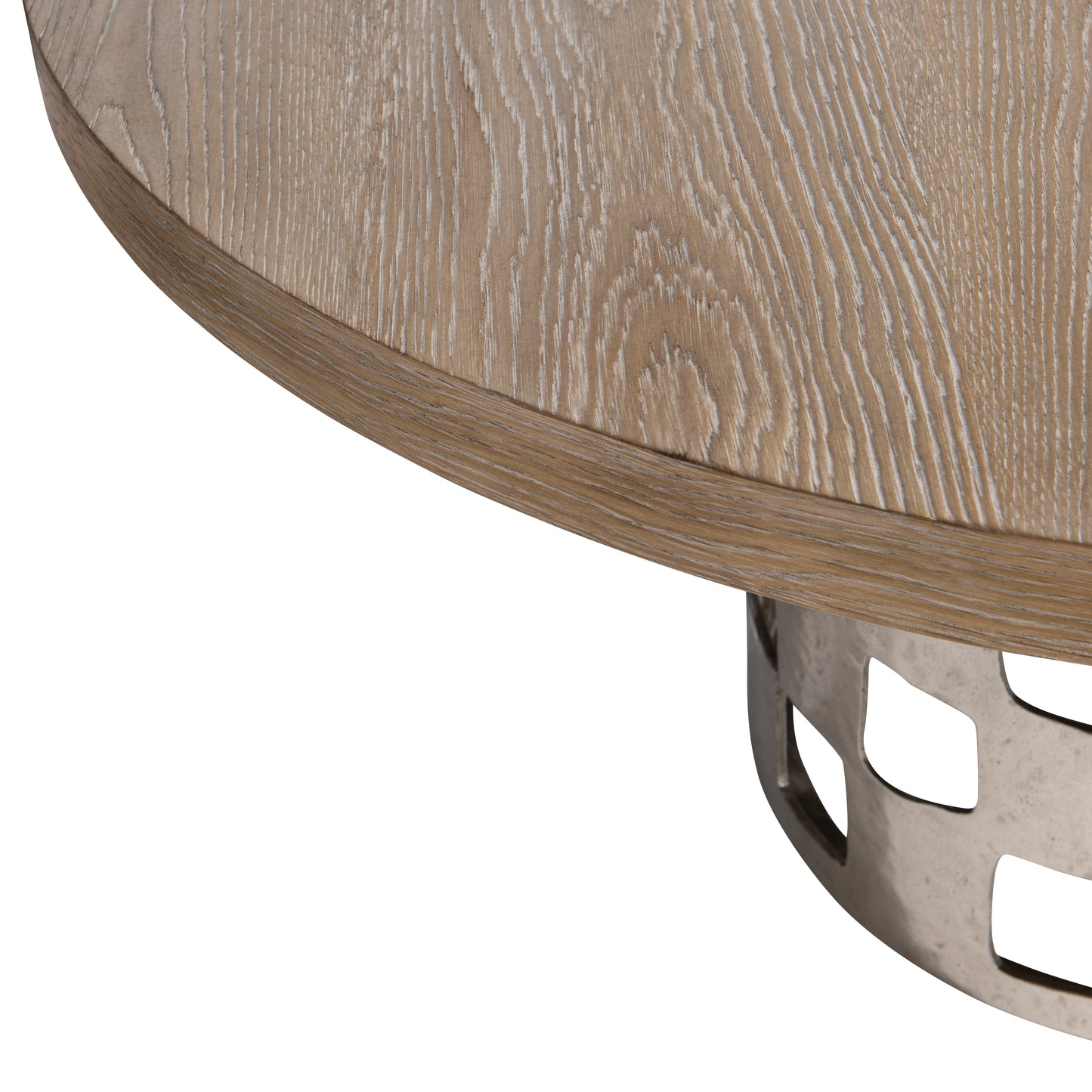 The Aventura dining table shows its midcentury architectural inspiration in a textured cast aluminum base with cutouts that resemble Palm Springs breeze blocks. The Frosted Nickel finish on the base perfectly complements the wood Marcona-finished top, which expands to an oval shape with a 20-inch leaf.