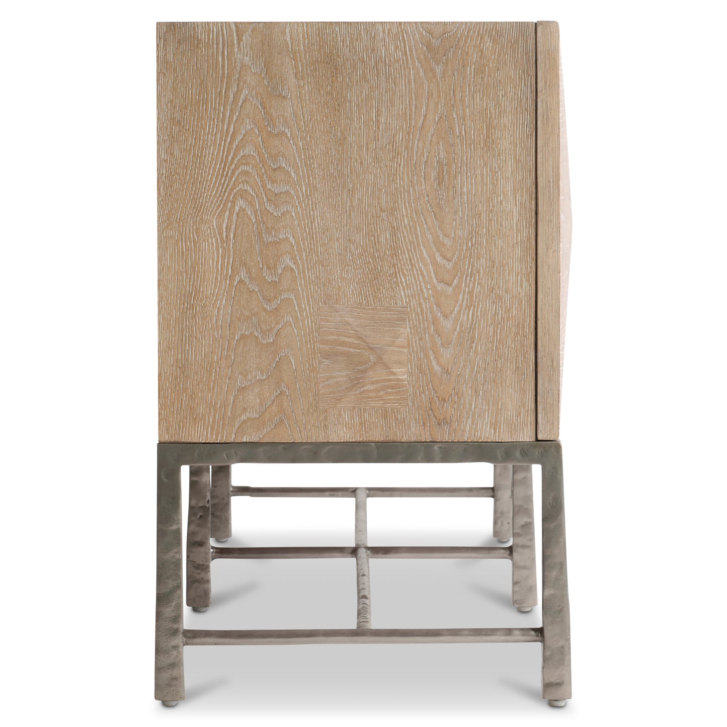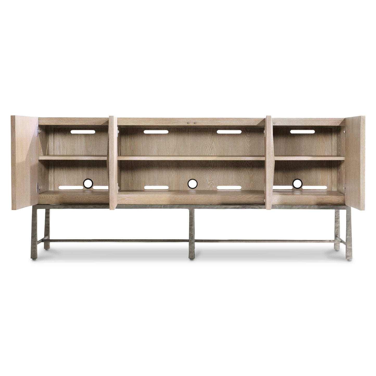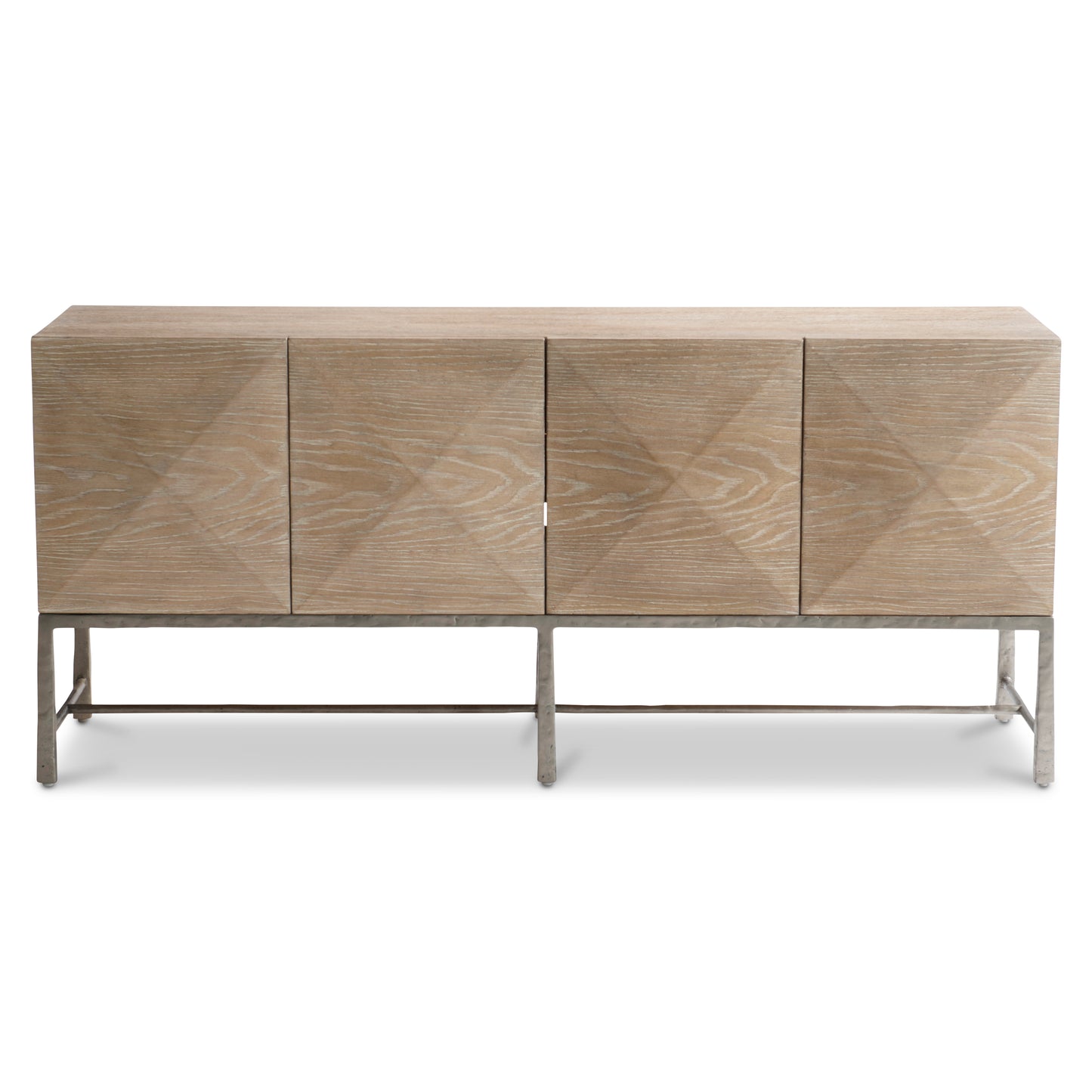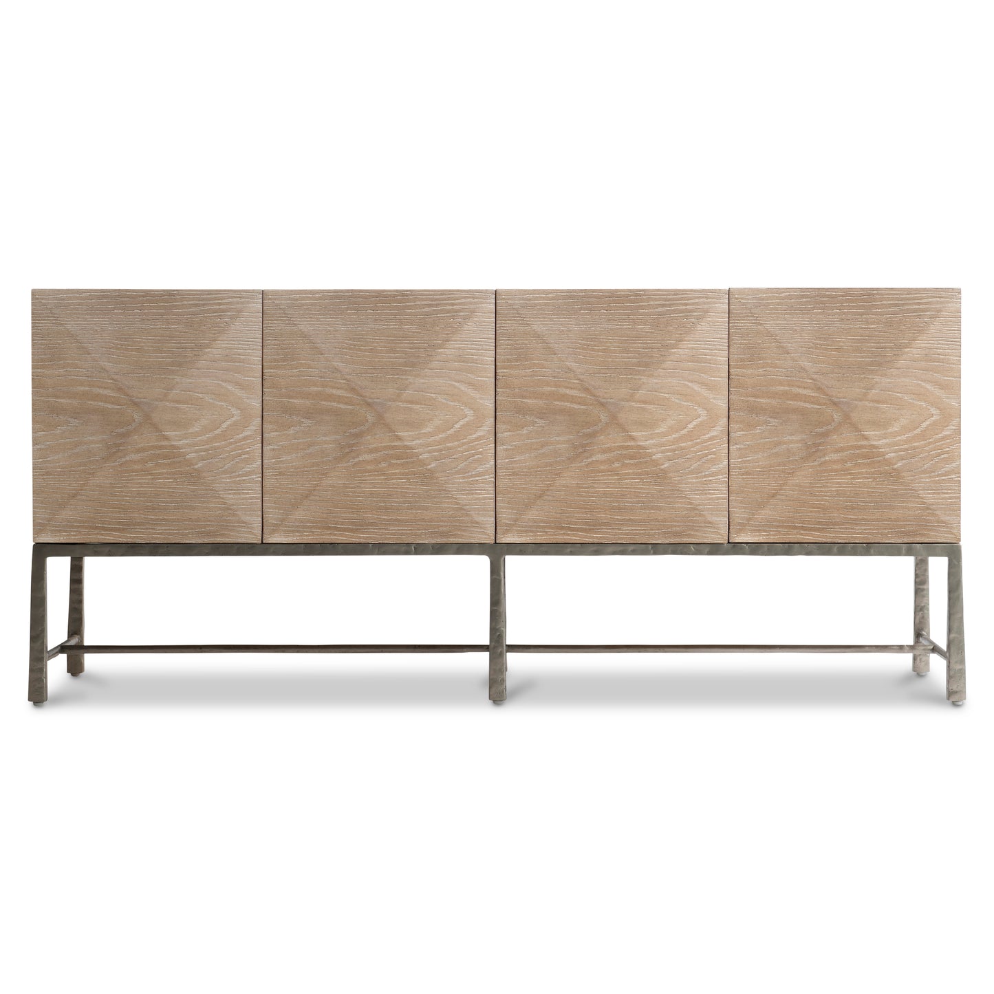 Dimensional pyramid shaping draws all eyes to the Aventura entertainment credenza. The textured aluminum base offers tapered legs in a Frosted Nickel finish. Behind the doors are adjustable and removable shelves, vents and covered grommet holes. A Marcona wood finish adds a chic but rustic look as the perfect final touch.