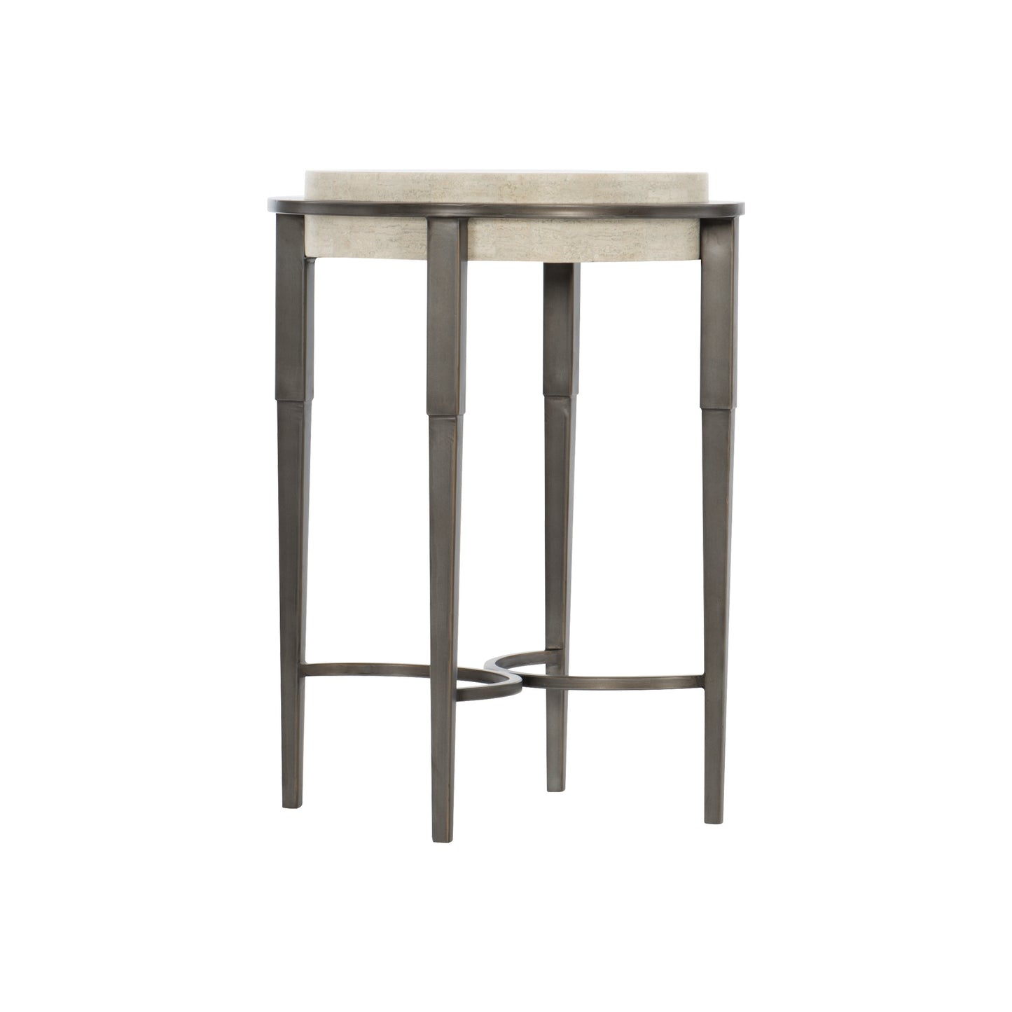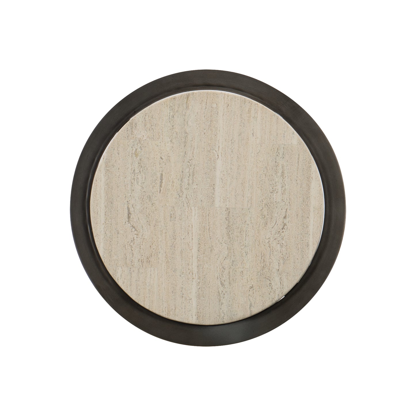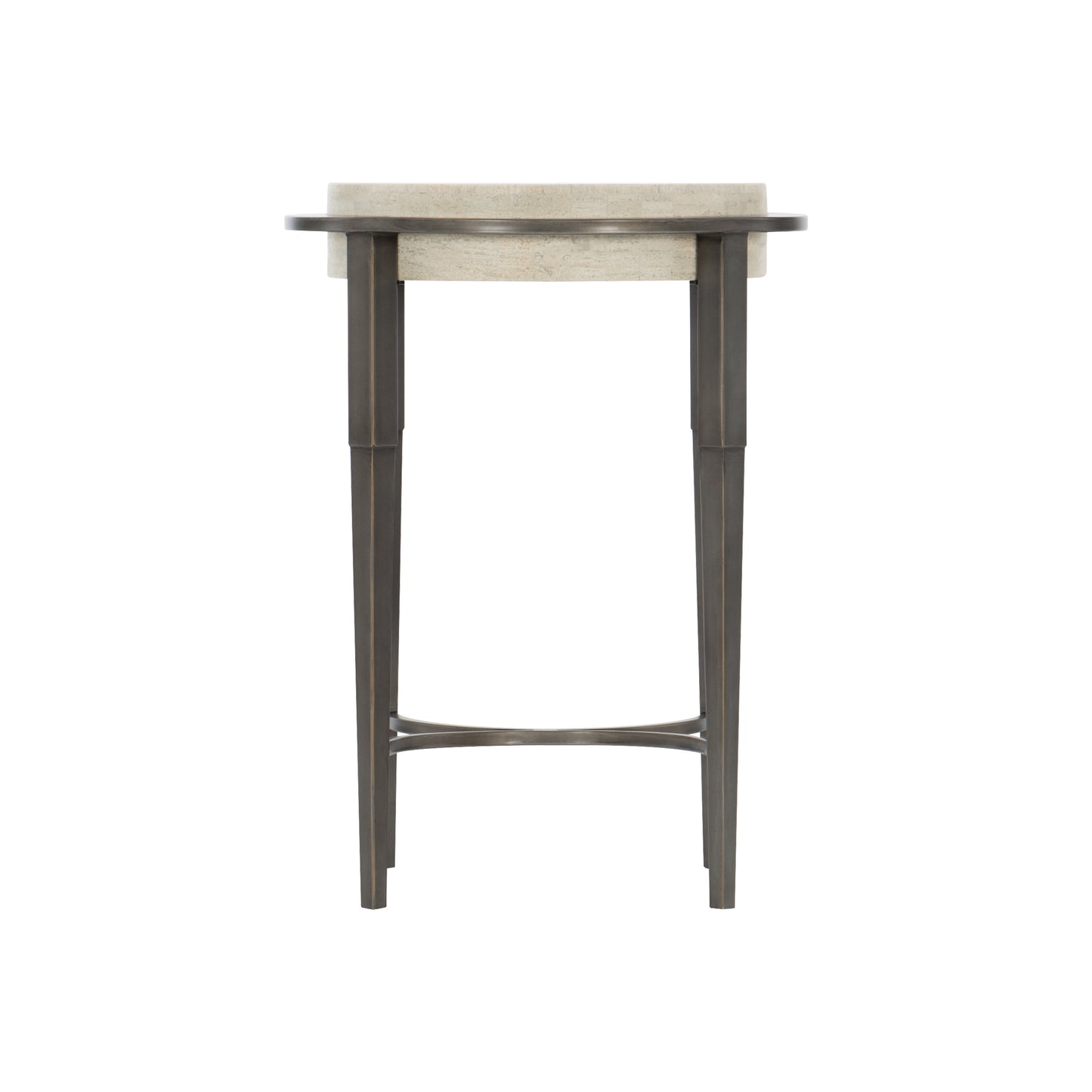 Exquisitely crafted, the Barclay drink table features a thick white travertine stone top floating on a plated steel base in an antique pewter finish. The striking modern design features sculpted tapered legs and semi-circular stretchers. This unique look delivers luxury with an eclectic edge.