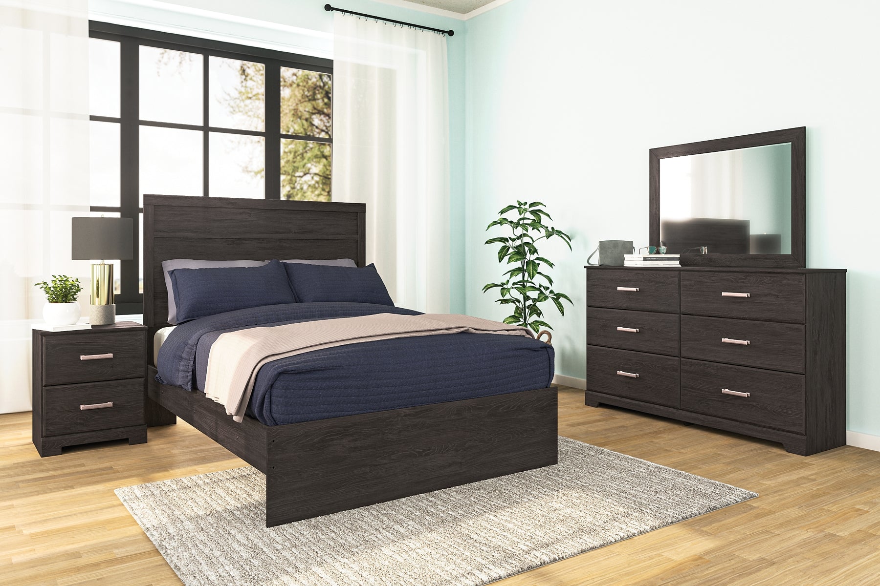 With its clean-lined look and modern attitude, this bedroom package is a fresh style awakening. A warm charcoal hue over replicated oak grain easily complements other furniture finishes. Smooth drawer fronts with antiqued pewter-tone handles complete the aesthetic.