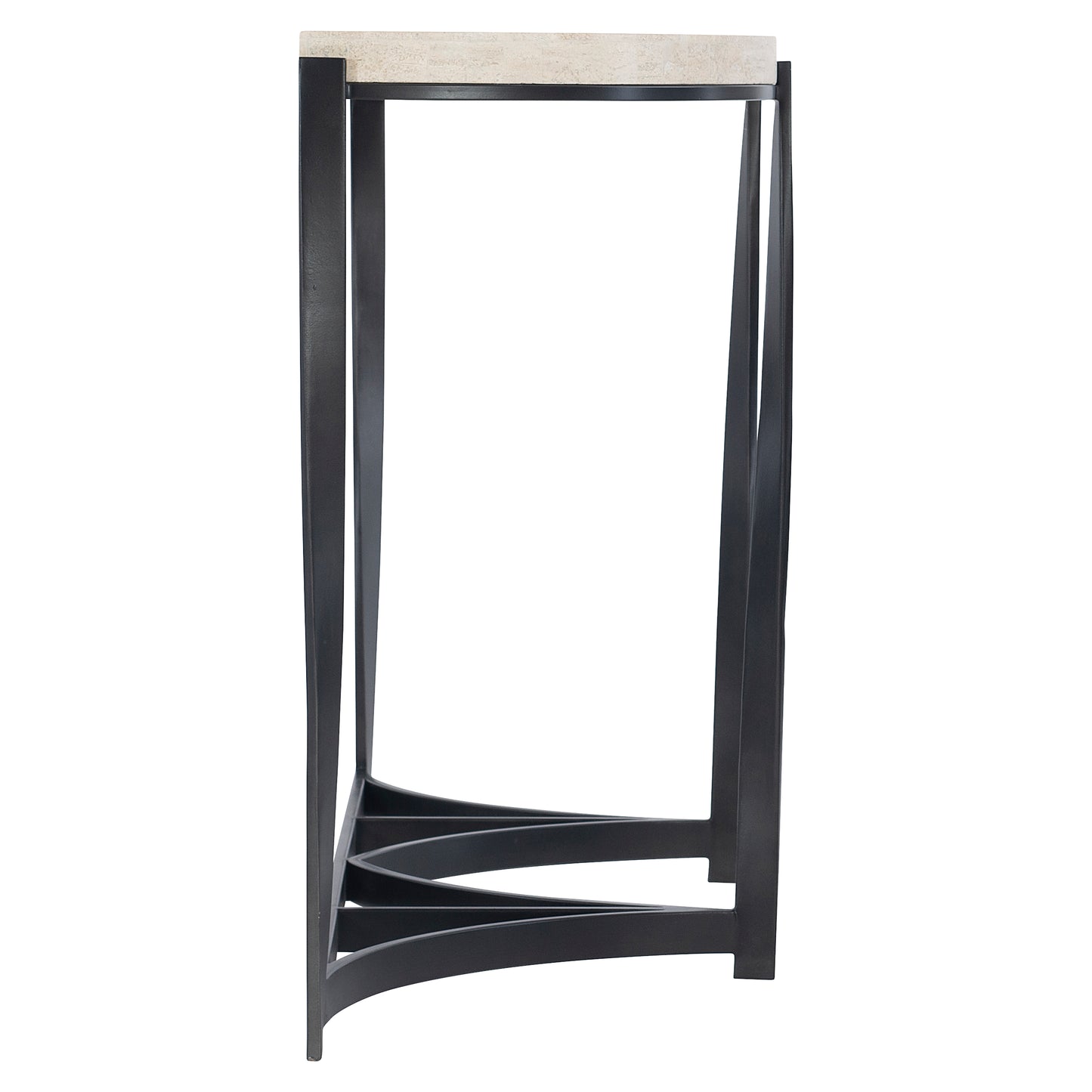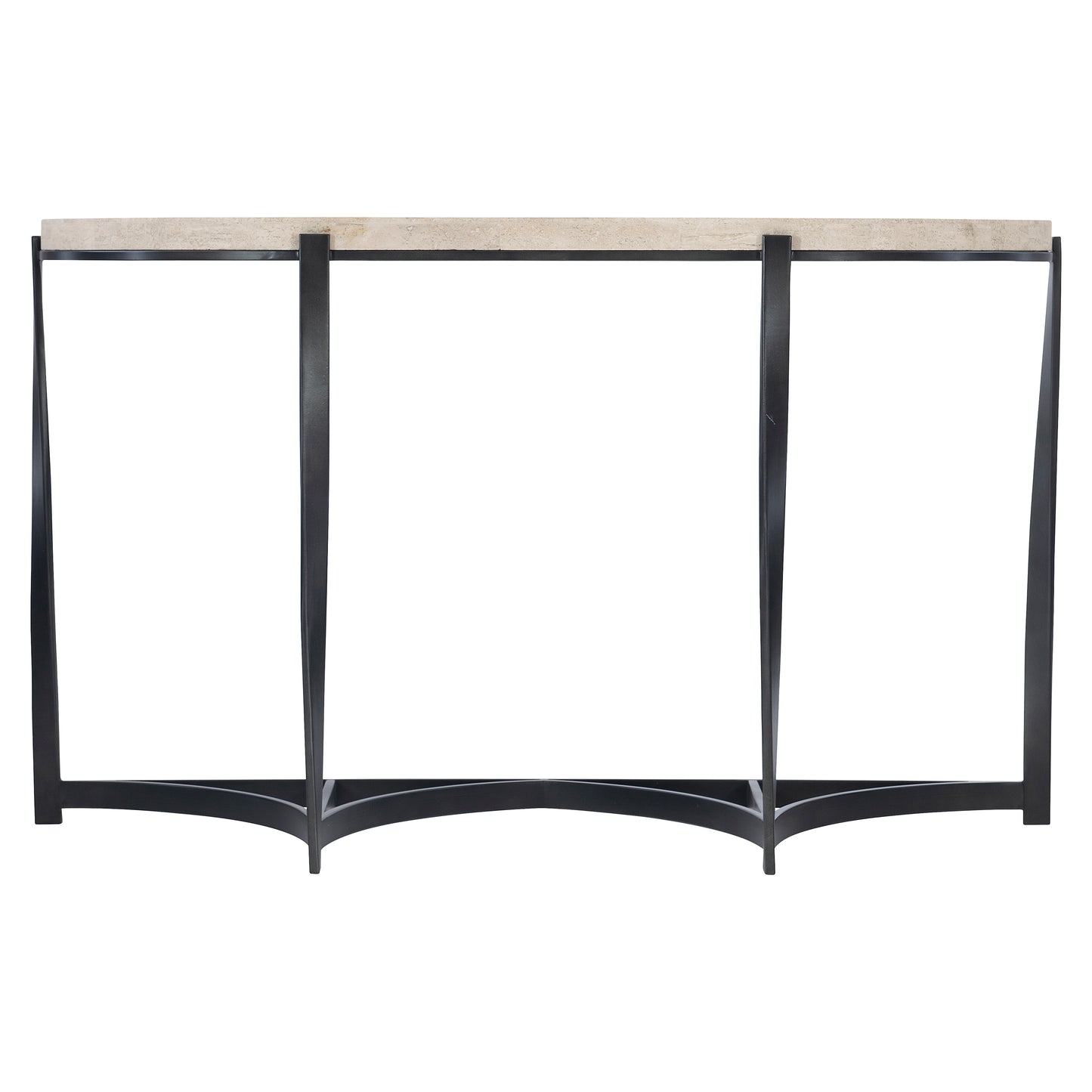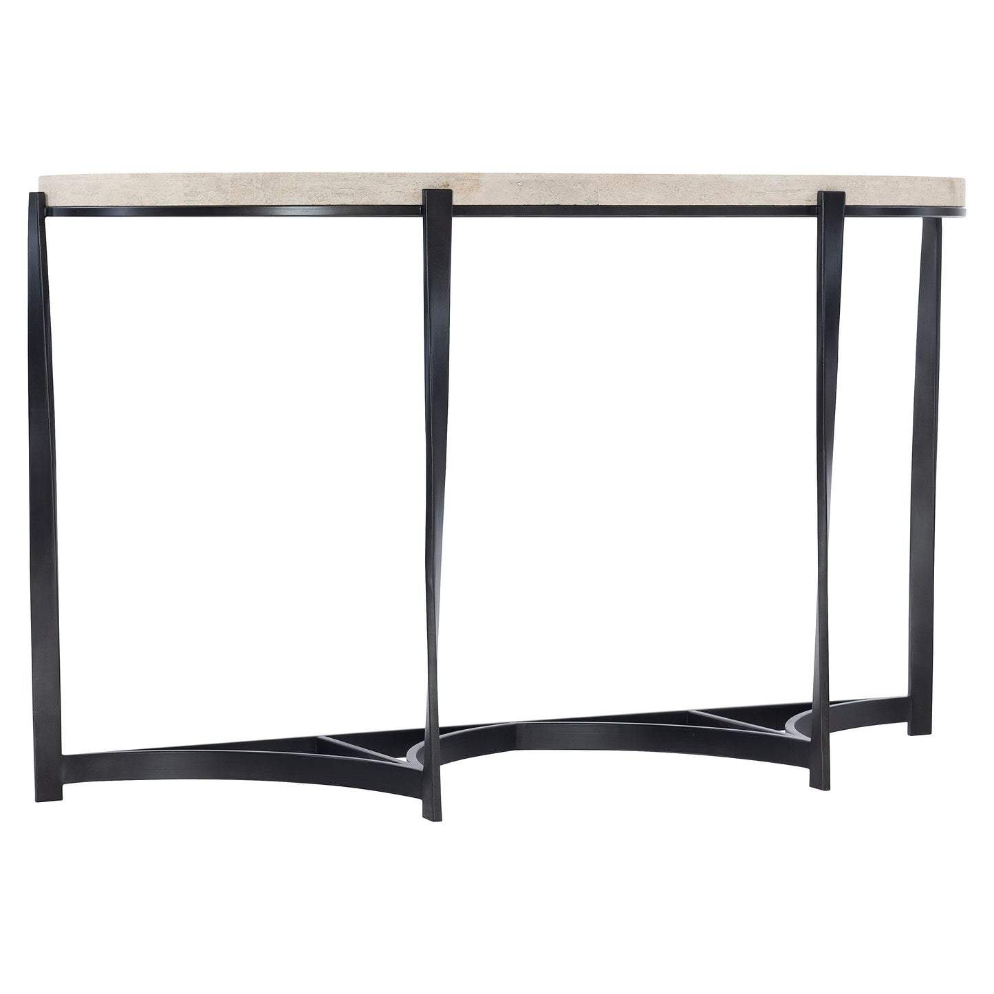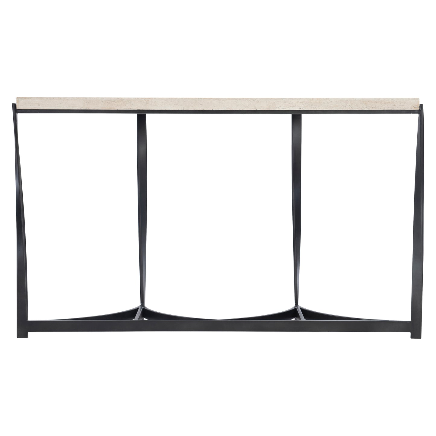 Bernhardt Occasional offers a range of upscale designs for luxe living spaces. The Berkshire console table pairs elegant stone with textured steel. Finished in aged pewter, the dark metal base contrasts with the organic, neutral hues of the stone top. Twisted steel legs add movement and visual interest.