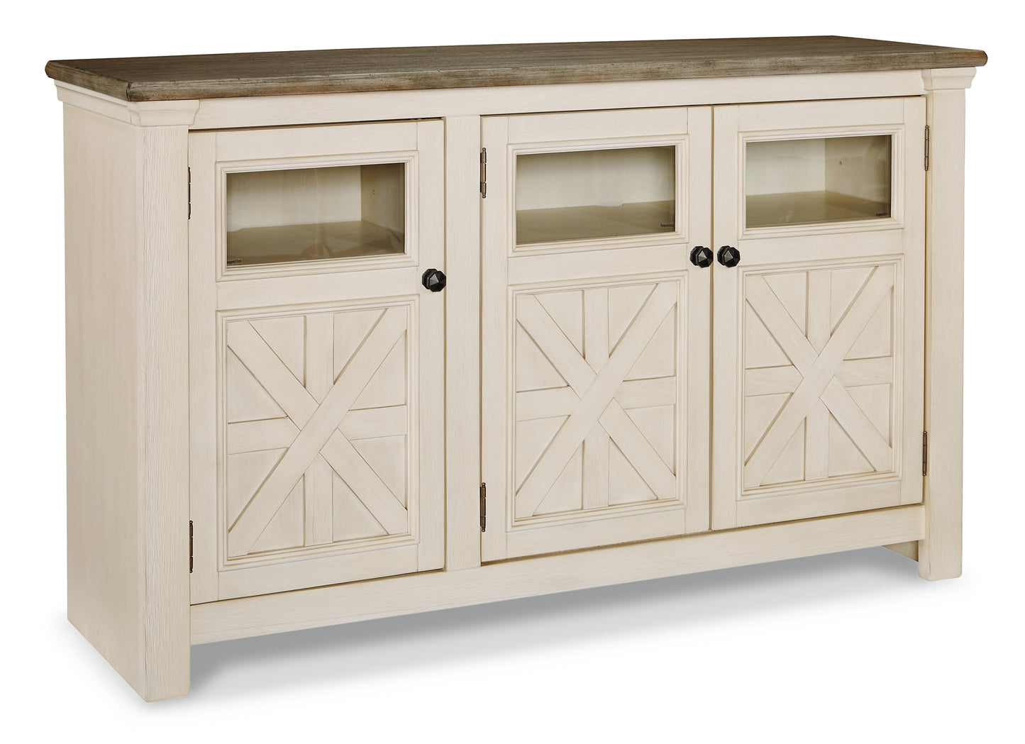 Whether your style is farmhouse fresh, shabby chic or country cottage, you’ll find this large TV stand perfectly in tune. Its two-tone finish pairs a trendy textured antiqued white with a weathered gray for that much more quaint character. Charming elements include crossbuck adorned cabinet doors with glass inlays for peek-through flair. Ample adjustable shelving and cutouts for wire management nicely accommodate your media needs.