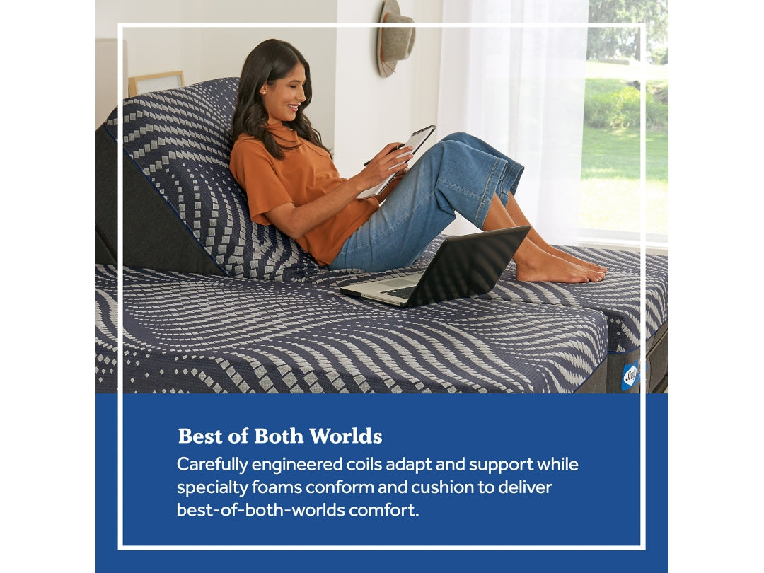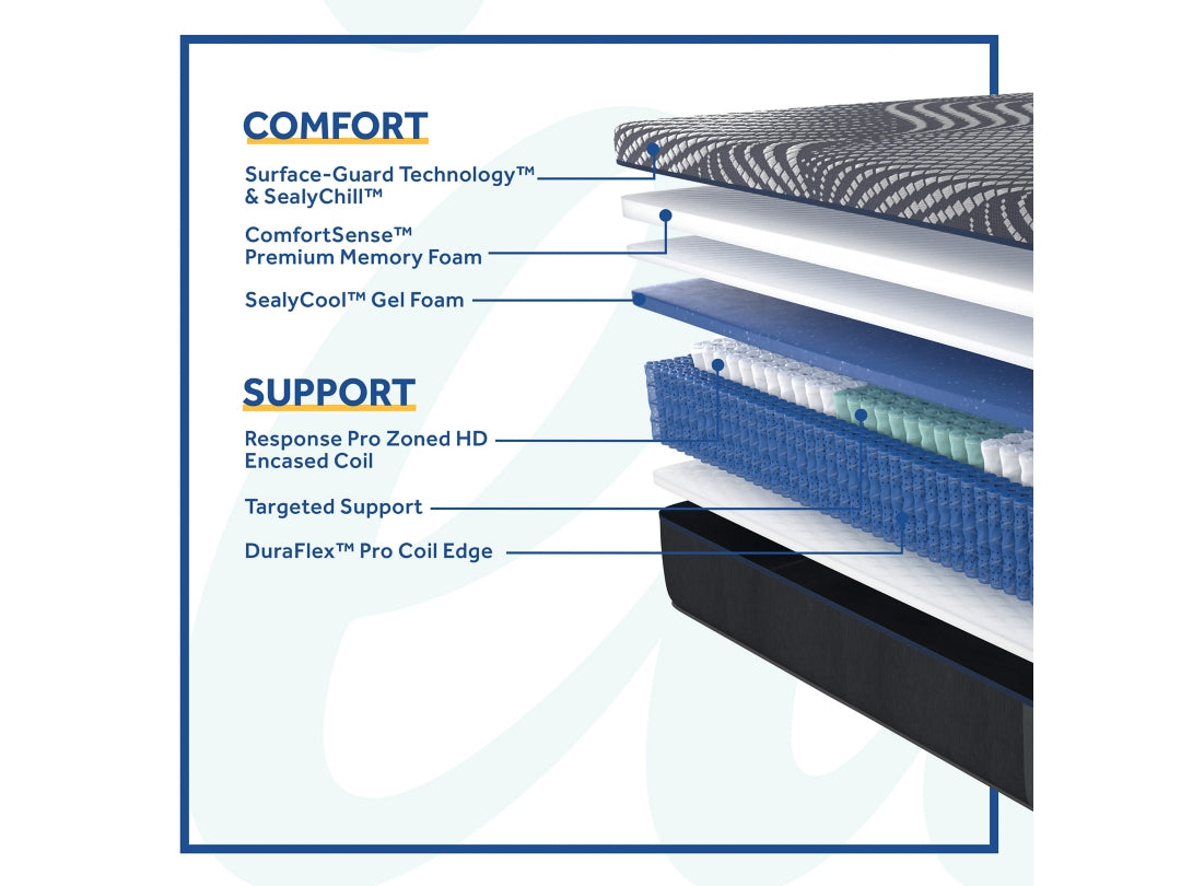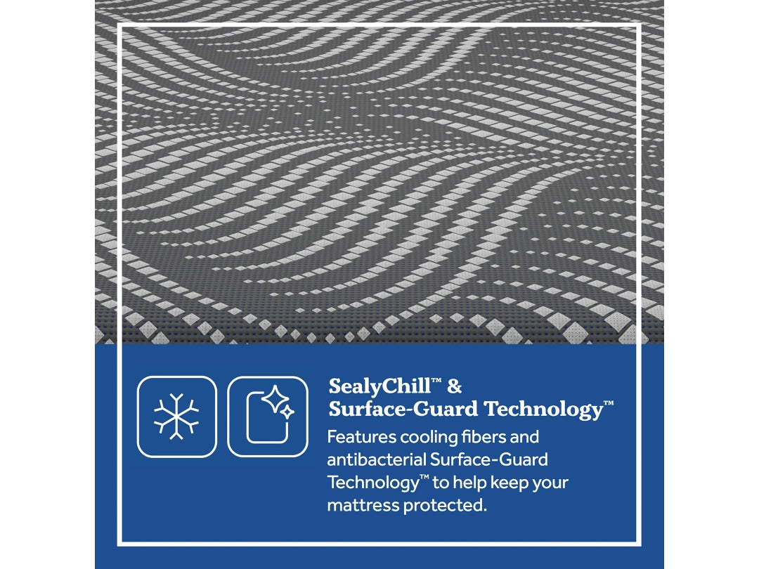 This upgraded hybrid mattress features Sealy's highest coil count and a thick layer of premium, pressure relieving memory foam. The SealyCool™ gel foam promotes a cooling environment and helps cushion, delivering comfort and support with a soft feel, while the densely packed coil system reinforces the center third of the mattress, delivering trusted, targeted support where you need it most—your back and core. The DURAFLEX™ pro coil edge system consists of densely packed coils surrounding the edge of this mattress for added durability, more sleeping area, a solid seating surface and better flexibility when paired with an adjustable base. Plus, the cool to the touch version of Sealy's stretch knit cover features cooling fibers for comfort and Surface-Guard Technology™ which protects the mattress surface from odors and stains caused by bacteria and common allergens.