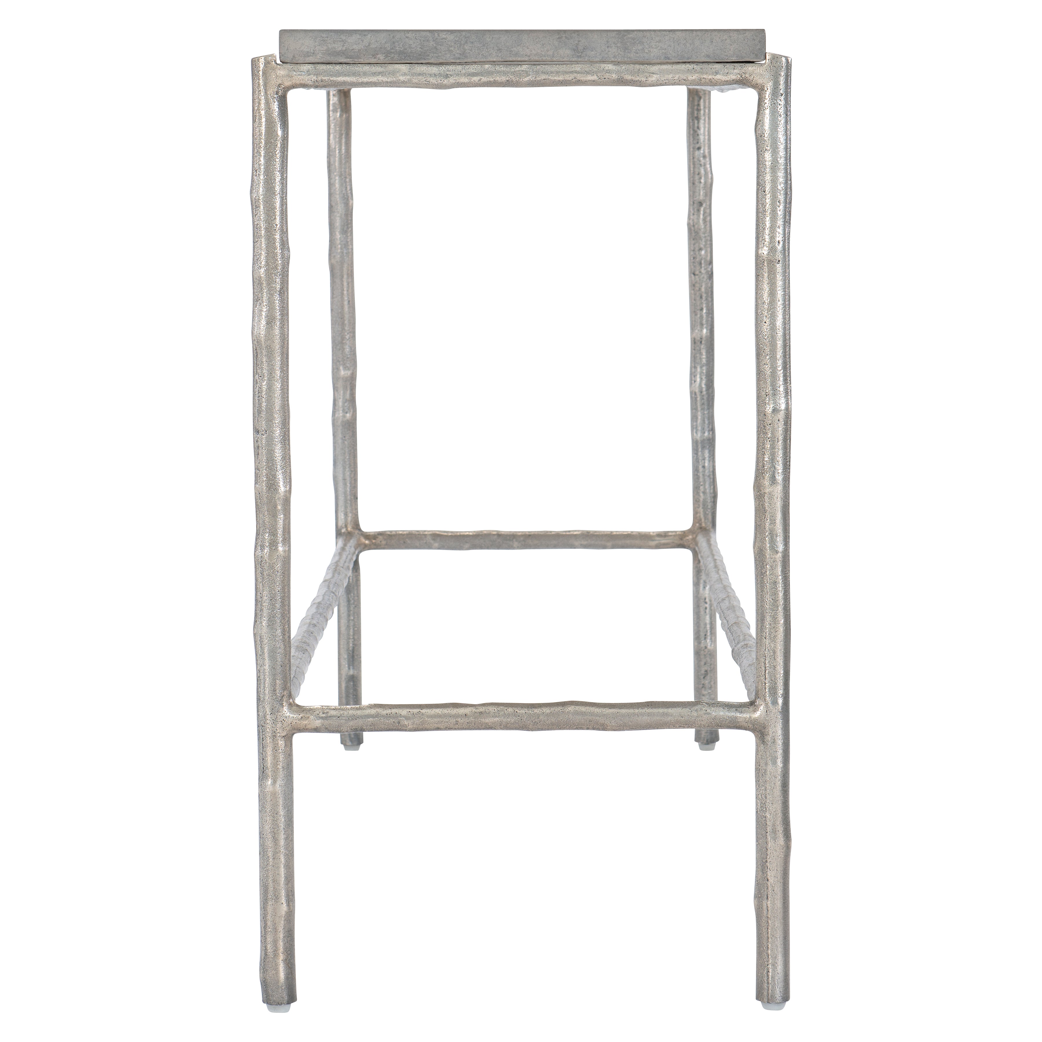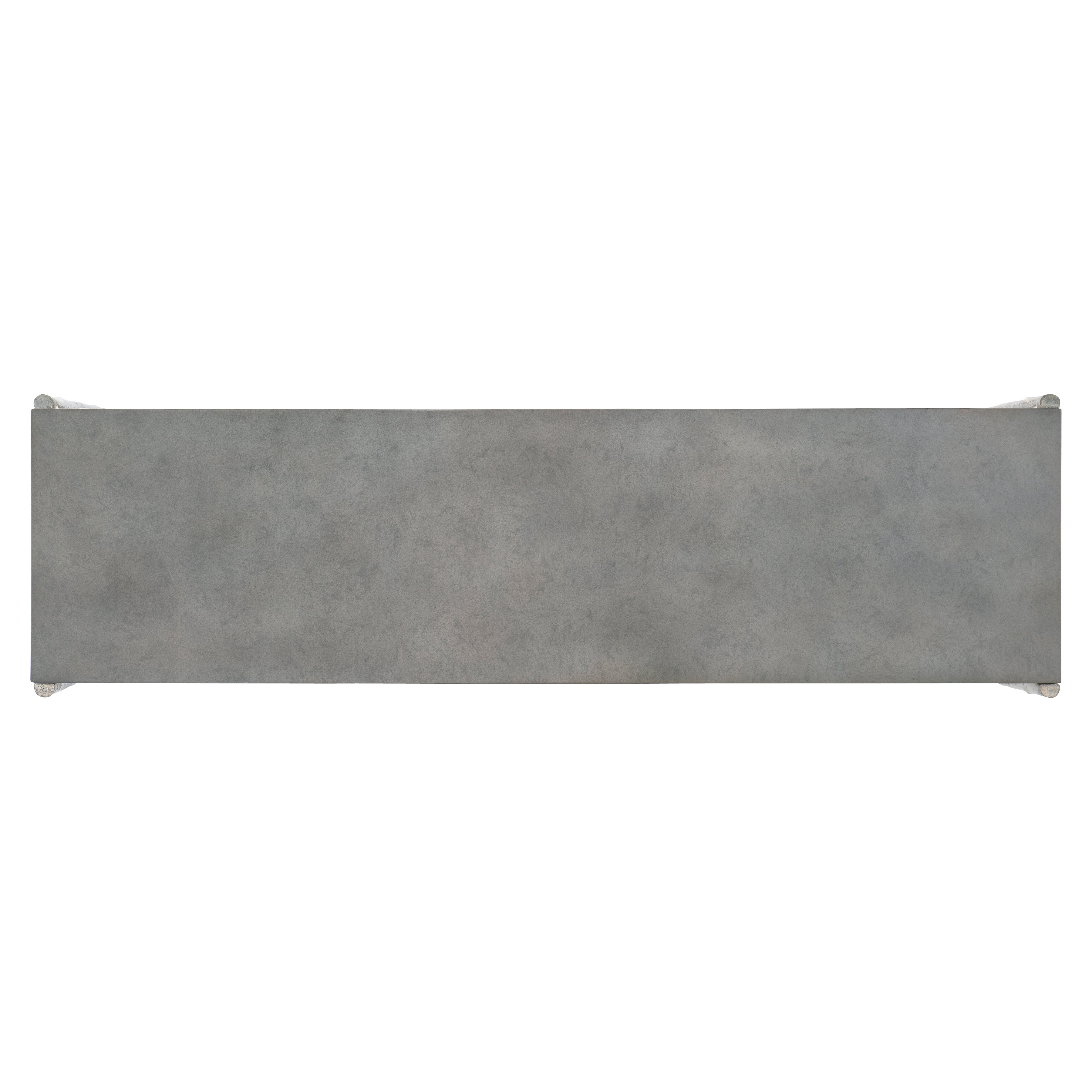 Rectangular console table with GRC top in Dovetail finish. Graphite finish on cast aluminum faux bois base and stretchers with protective finish. Stainless Steel adjustable glides.