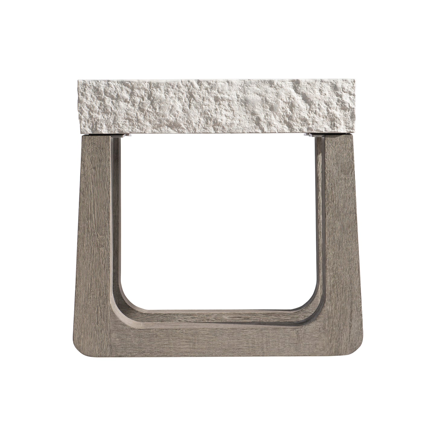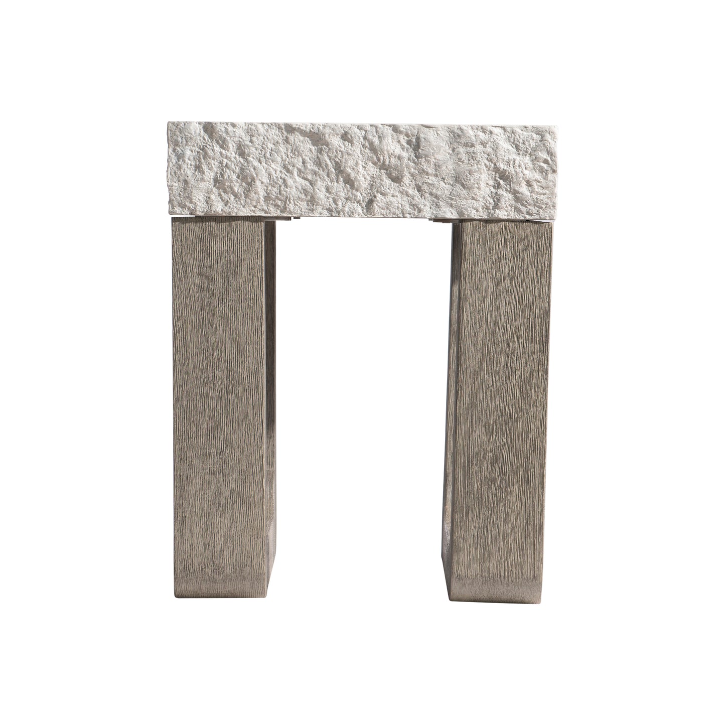Shaped and curved teak supports run parallel to each other on the Bristol outdoor side table. The smooth wood finds its perfect contrast in the textured band around the glass-reinforced concrete top. The surface is perfectly flat, showcasing the top's Sand Grey finish.