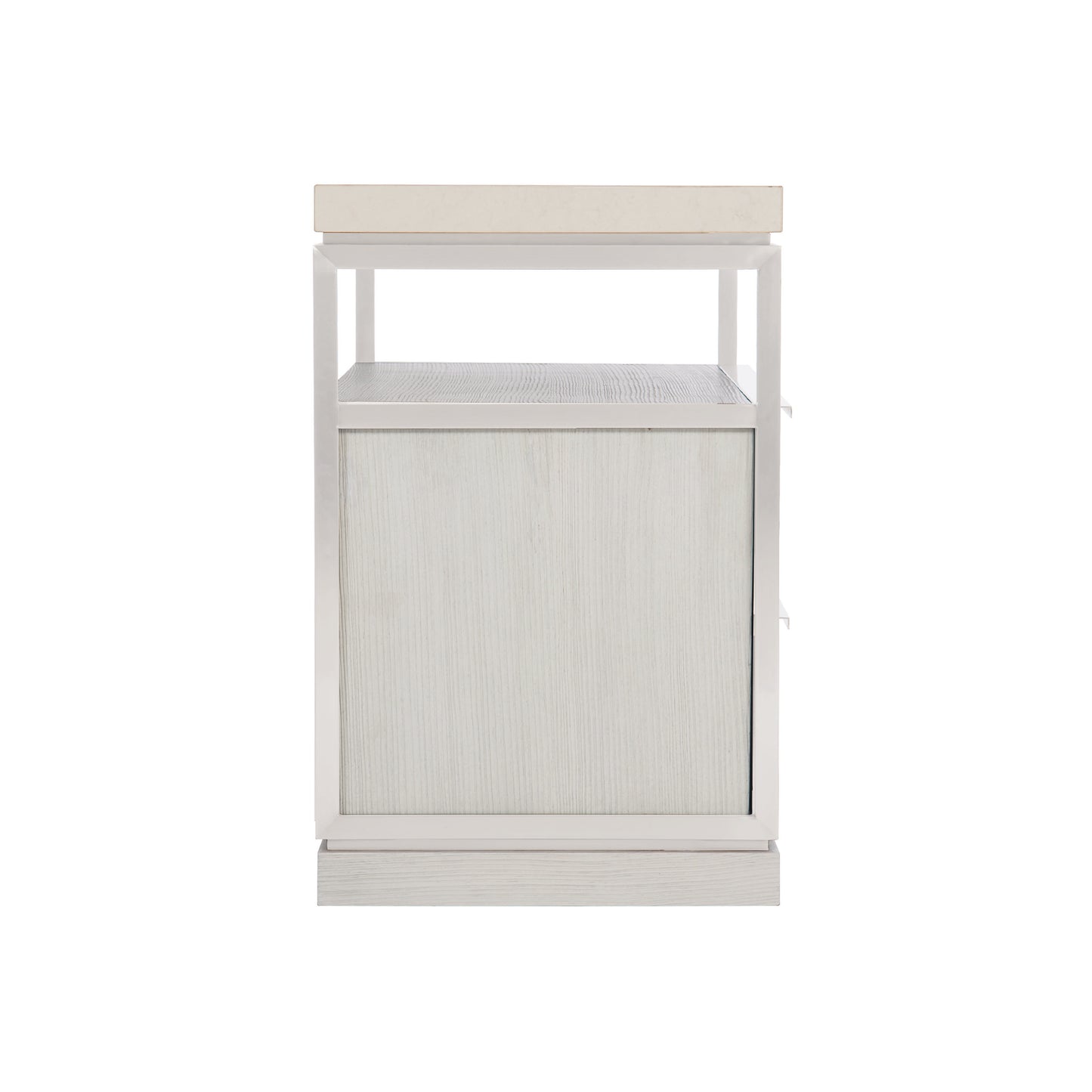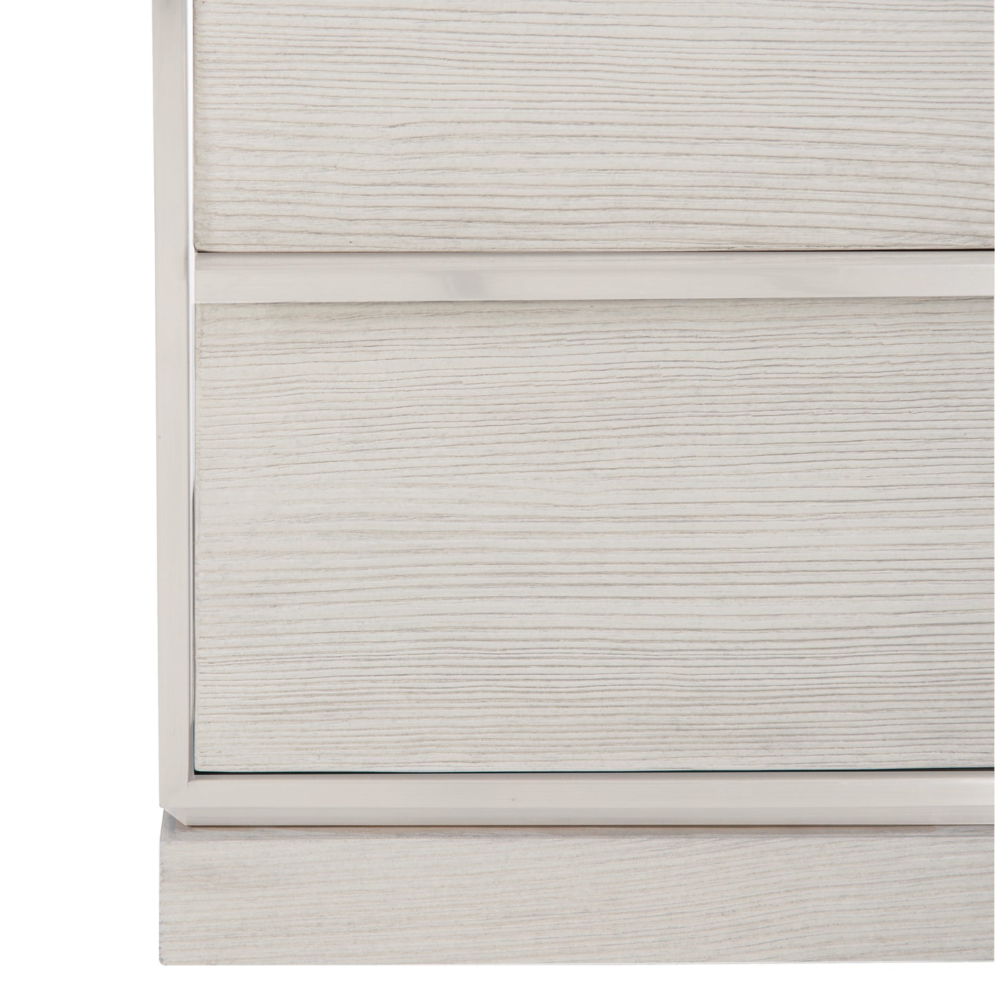 Influenced by Scandinavian minimalism, the Bryne nightstand achieves a sophisticated contemporary style with its simple, practical form. The streamlined design features two drawers and an open compartment topped with laminated white marble. The wire-brushed quartered pine veneers feature a muted Bone finish that highlights the linear wood grain. A stainless steel frame in Tarnished Nickel finish emphasizes the clean horizontal lines while adding a hint of shine to the otherwise subdued palette.