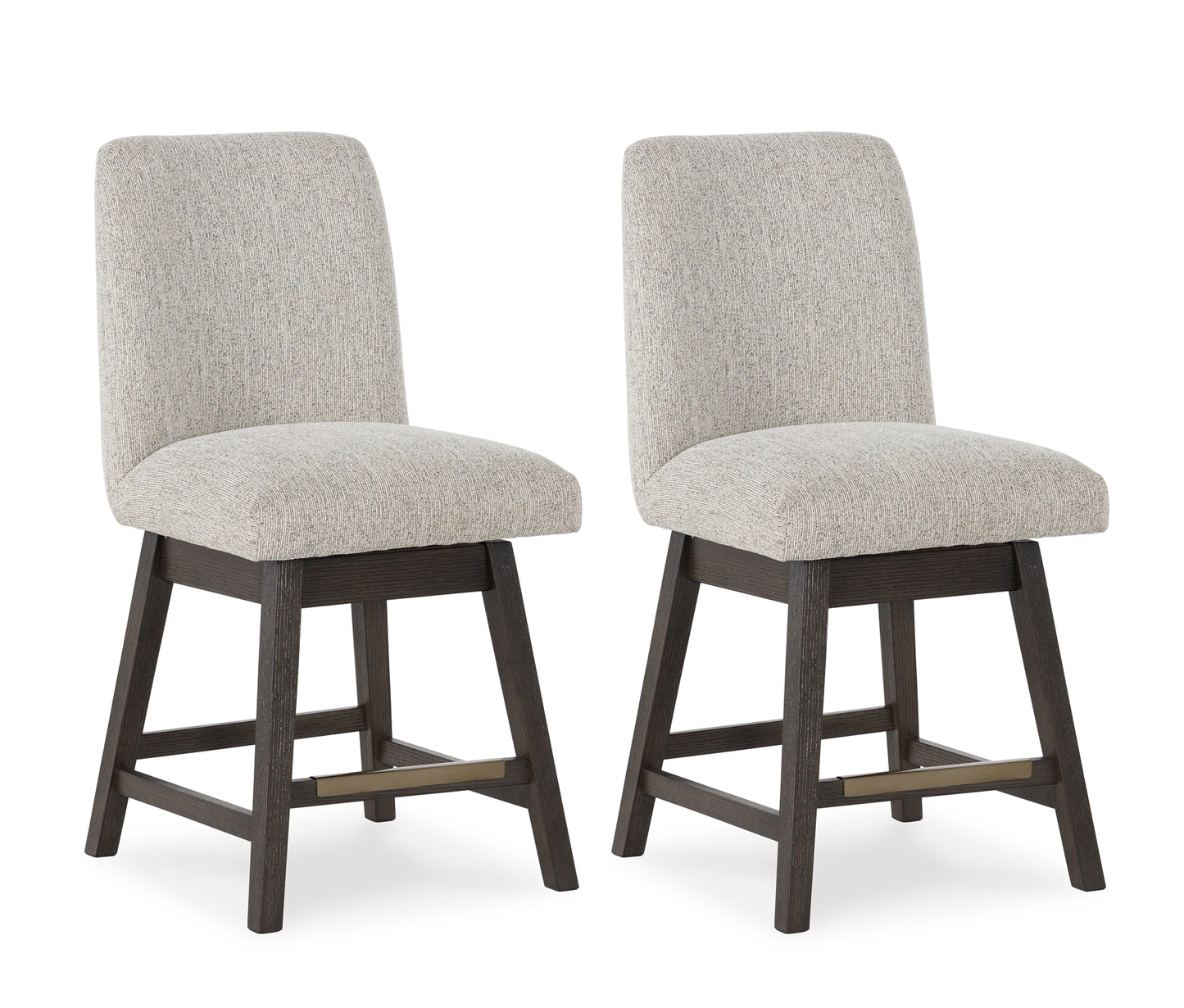 Dressed to thrill, this counter height bar stool offers a high-design look at a down-to-earth price. Ultra-sleek lines are accentuated with a dark waxy brown oak-tone finish that’s so easy on the eyes. Suitably upholstered in a tweed-like neutral fabric, the softly contoured back design is tailor-made for comfort. Whether it's part of a dining arrangement or used as extra seating, this timeless bar stool has a look that’s made to last.