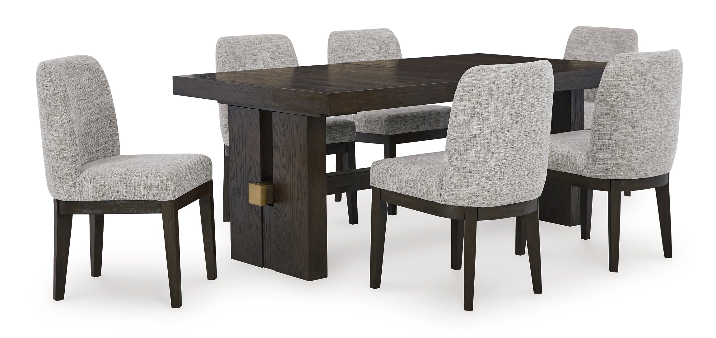 Dressed to thrill, this simply stunning dining table with 6 chairs offers a high-design look at a down-to-earth price. Ultra sleek lines are accentuated with a dark waxy brown oak-tone finish that’s so easy on the eyes. Clean-lined and modern, the double pedestal base and thick edge tabletop showcase quality craftsmanship and attention to detail. Whether you're hosting family meals or holiday entertaining, it has a timeless look that’s made to last.