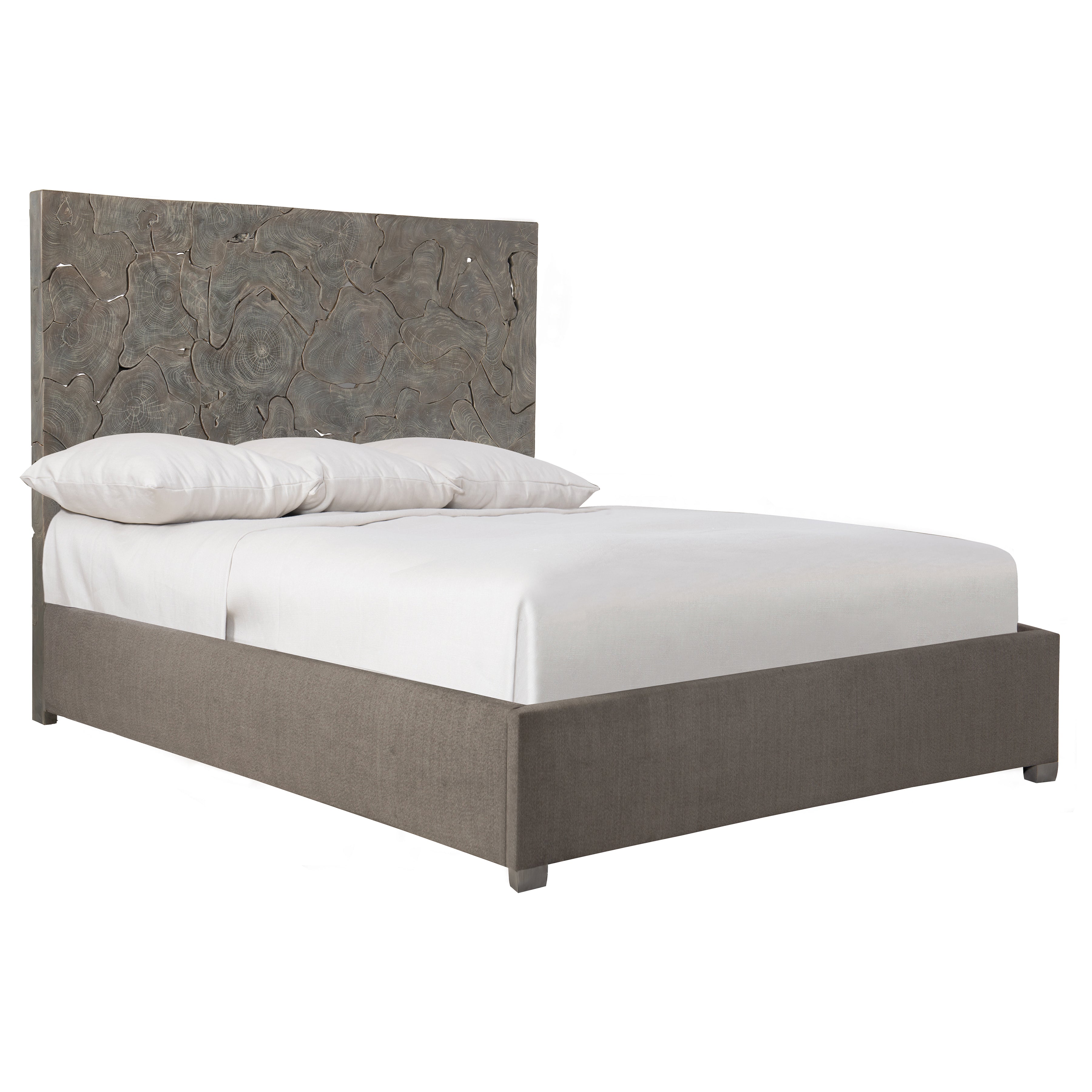 The texture of natural teak in a Smoked Truffle finish is balanced by softly upholstered panels on the Calavaras fabric panel bed. The headboard draws all eyes, with its open-work pattern of sliced teak, supported by an upholstered footboard and side rails. Exposed wood feet are finished in Smoke.