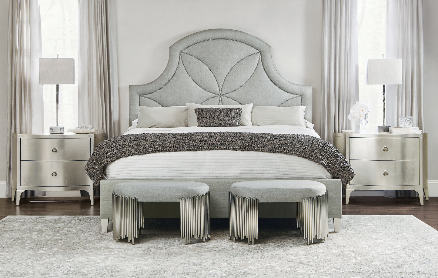 Shaped upholstered headboard with decorative nailhead trim. Upholstered footboard and side rails - no nailhead trim. Assigned fabric: B477 / Assigned nailhead: #13. Five wood slat support system with adjustable supports. Silken Pearl finish on feet.