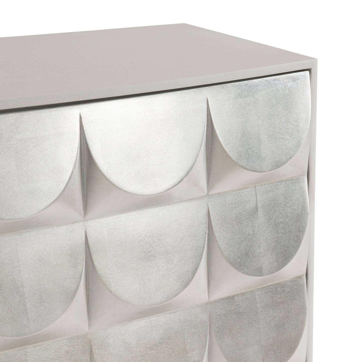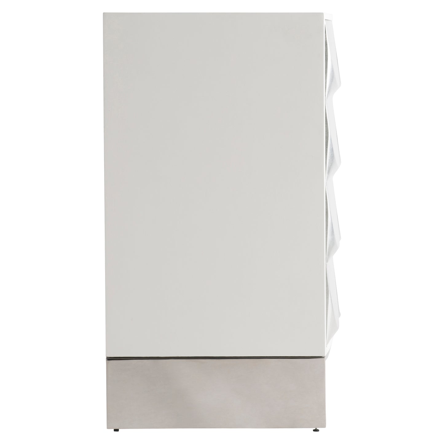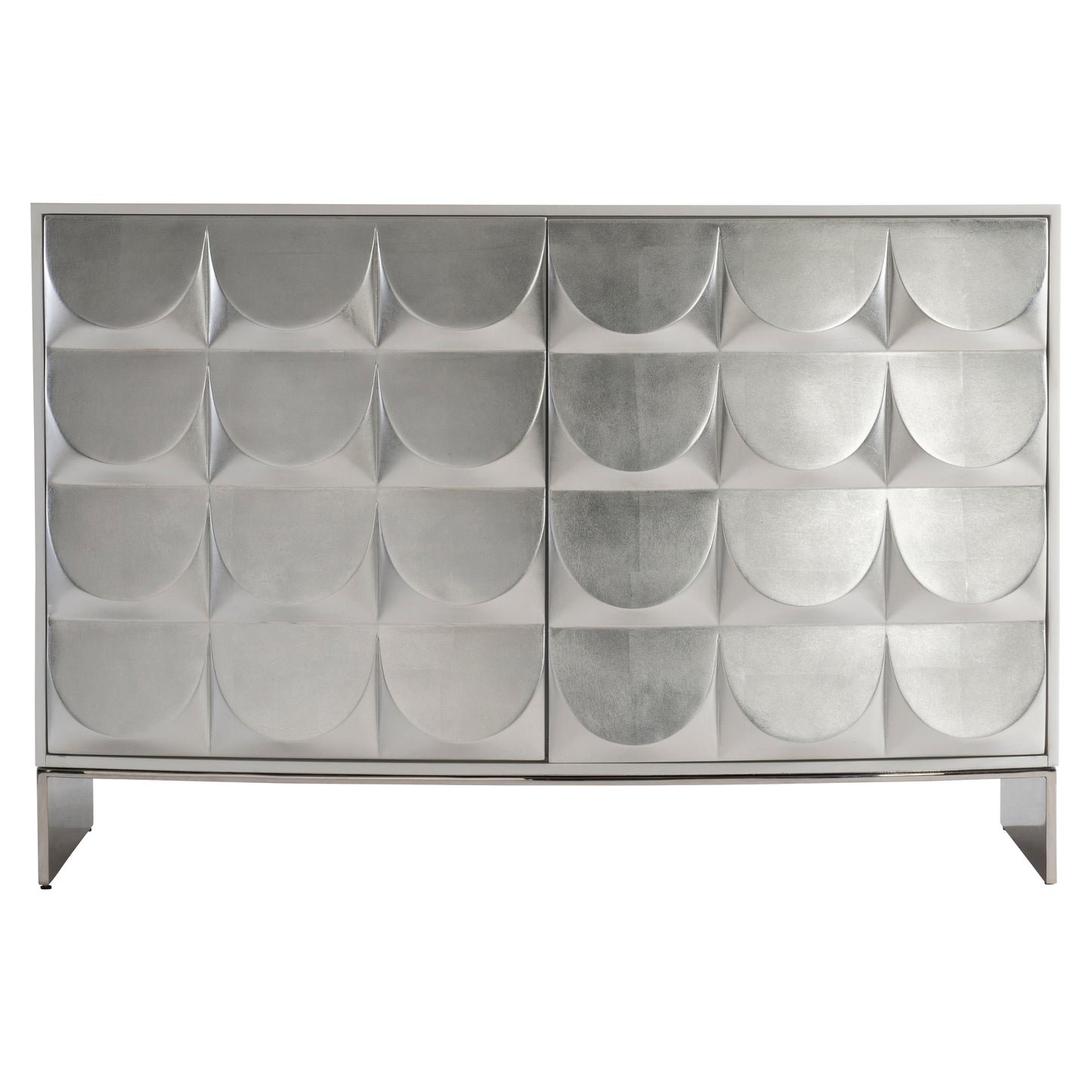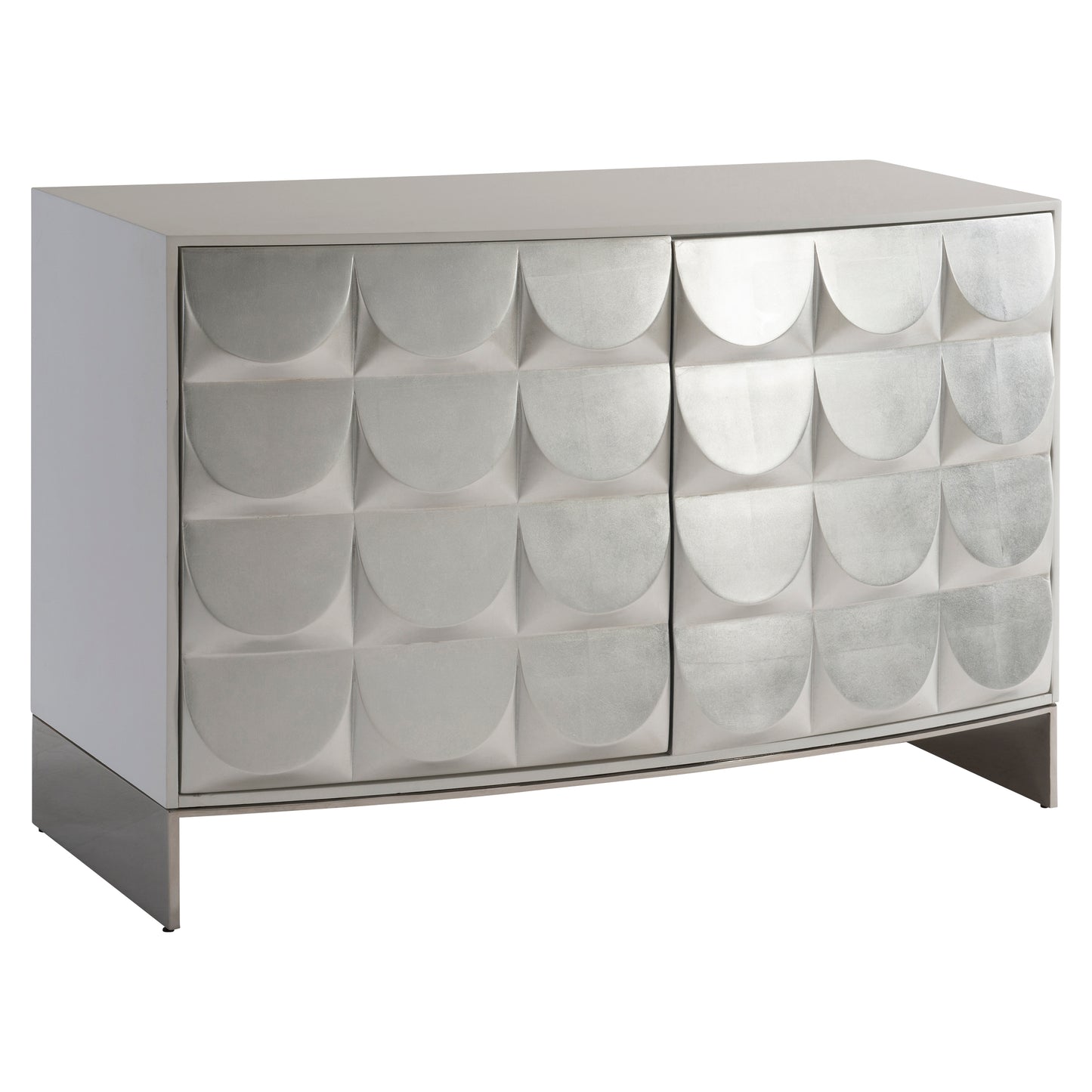 The Calliope door chest is inspired by Art Deco design with its scalloped cast resin overlays in Silver Leaf finish. The case is in a White Plaster finish with a white painted interior and a polished stainless steel base. Behind the softly glowing doors are four adjustable/removable shelves.