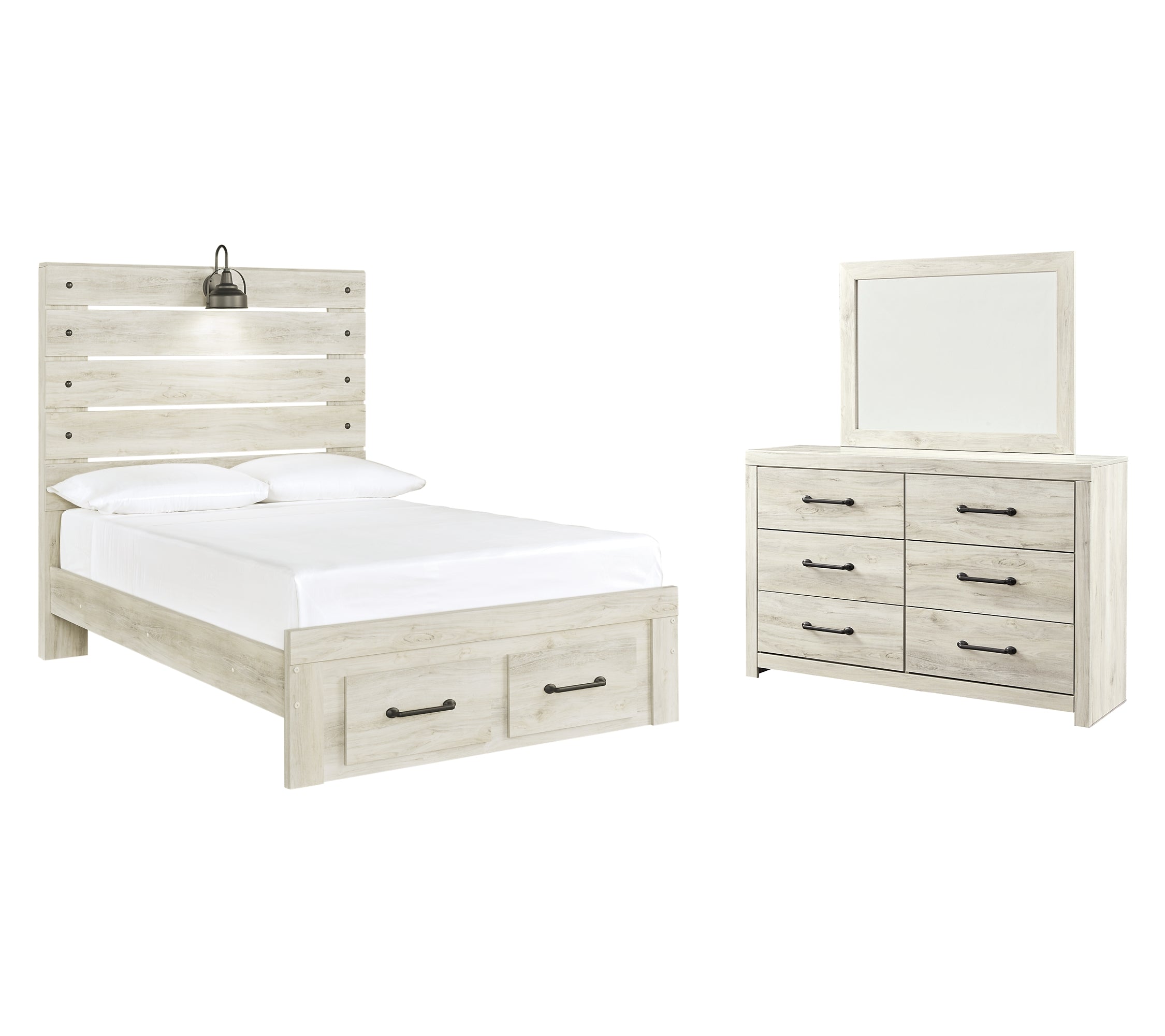 Whether you lean towards modern loft or modern farmhouse, this panel storage bed and dresser with mirror tip the balance in your favor. The wispy whitewash finish enhances the style without covering the grain for that weathered look you just can’t get enough of. Love to read in bed? You’re sure to find the retro-chic light sconce and USB plug-ins on the open-slat style headboard to be a totally bright idea while the elongated metal pulls really elevate the aesthetic. What a delightful take on rustic industrial style.