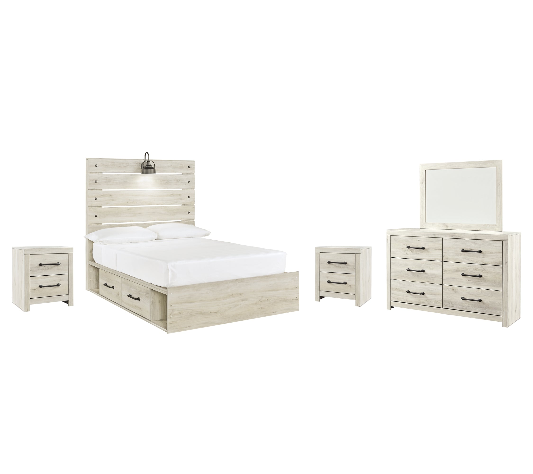 Whether you lean towards modern loft or modern farmhouse, this panel storage bed, two nightstands and dresser with mirror tip the balance in your favor. The wispy whitewash finish enhances the style without covering the grain for that weathered look you just can’t get enough of. Love to read in bed? You’re sure to find the retro-chic light sconce and USB plug-ins on the open-slat style headboard to be a totally bright idea, while the elongated metal drawer pulls really elevate the aesthetic. What a delightful take on rustic industrial style.