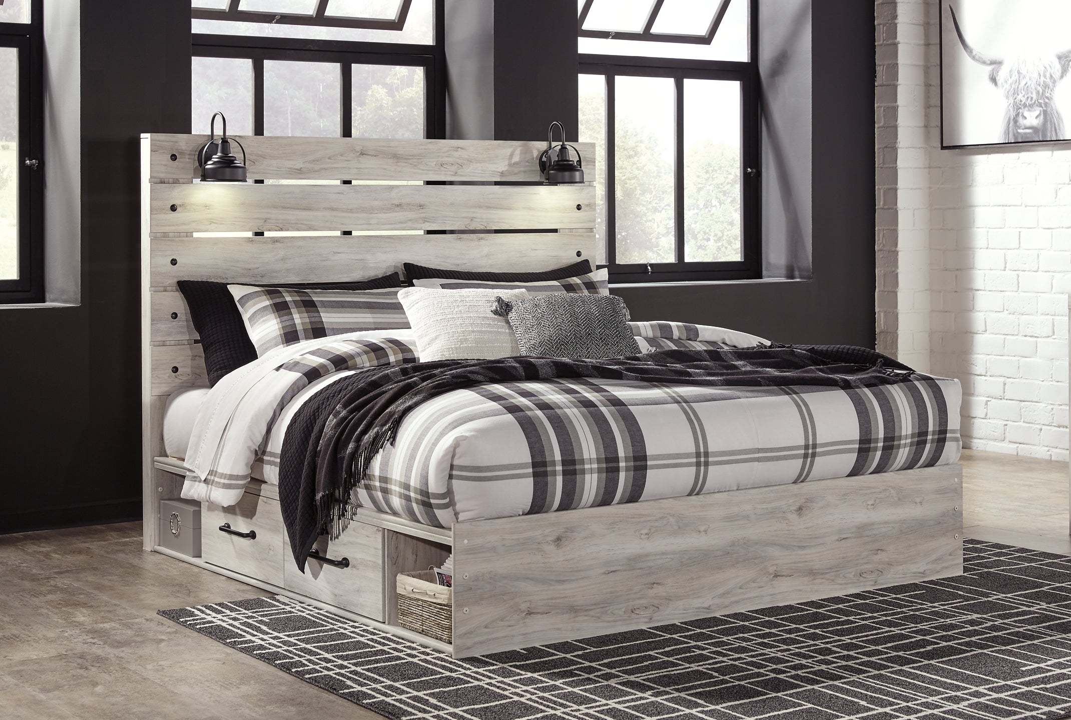Whether you lean towards modern loft or modern farmhouse, this panel storage bed and dresser tip the balance in your favor. The wispy whitewash finish enhances the style without covering the grain for that weathered look you just can’t get enough of. Love to read in bed? You’re sure to find the retro-chic light sconces and USB plug-ins on the open-slat style headboard to be a totally bright idea while the elongated metal drawer pulls on the dresser and underbed drawers really elevate the aesthetic. What a delightful take on rustic industrial style.