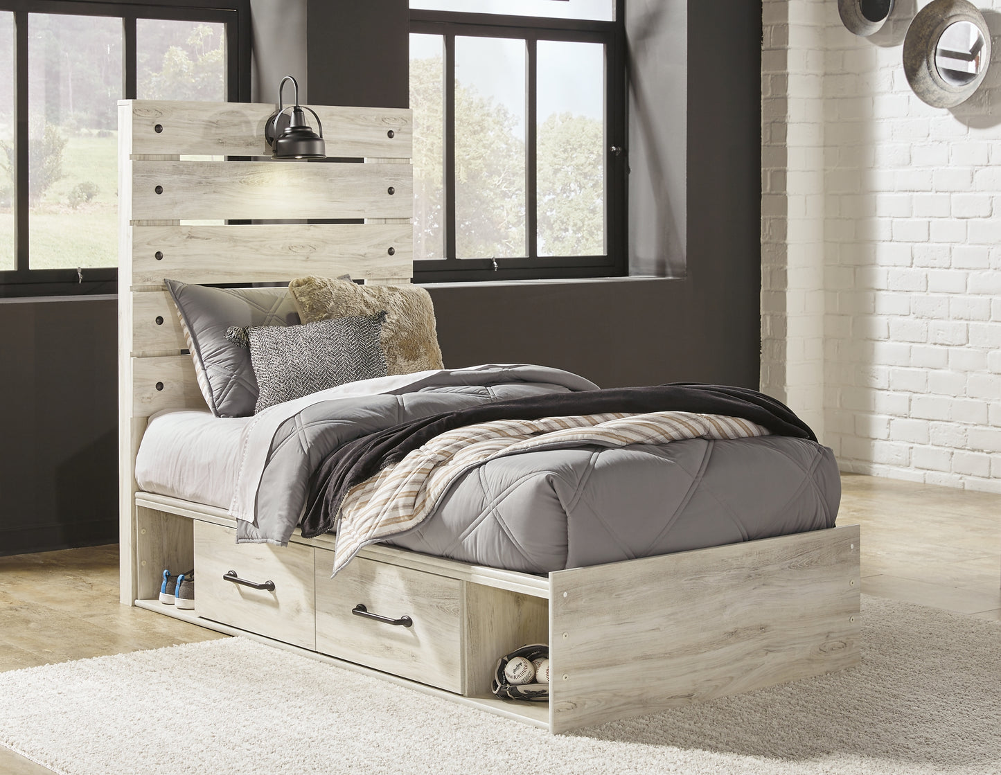 What a delightful take on rustic industrial style. Whether modern loft or modern farmhouse, this twin panel storage bed makes itself at home. The wispy whitewash palette enhances without covering the grain for that weathered look you crave. Love to read in bed? You’re sure to find the retro-chic light sconce and USB plug-ins on the open-slat style headboard such a bright idea. Elongated drawer pulls on the under bed storage drawers elevate the aesthetic.