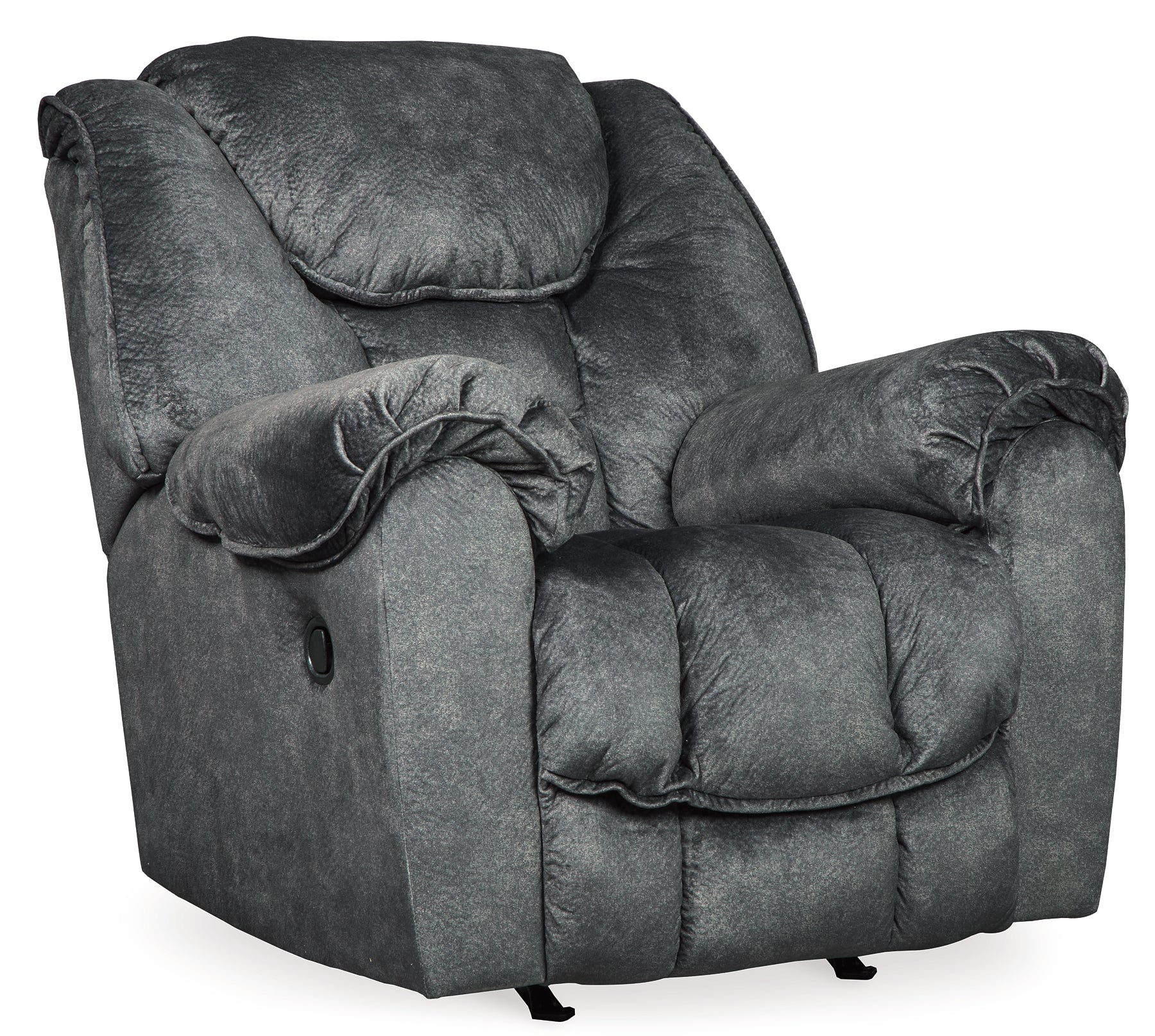 Sometimes seeing is believing. Rest assured this rocker recliner is every bit as indulgent as it looks. Designed to put you in the lap of luxury, this generously scaled recliner—wrapped in a wonderfully plush and practical granite gray upholstery—sports scooped pillow wrapped armrests and curvaceously cushioned head-neck support for feel-good flair.