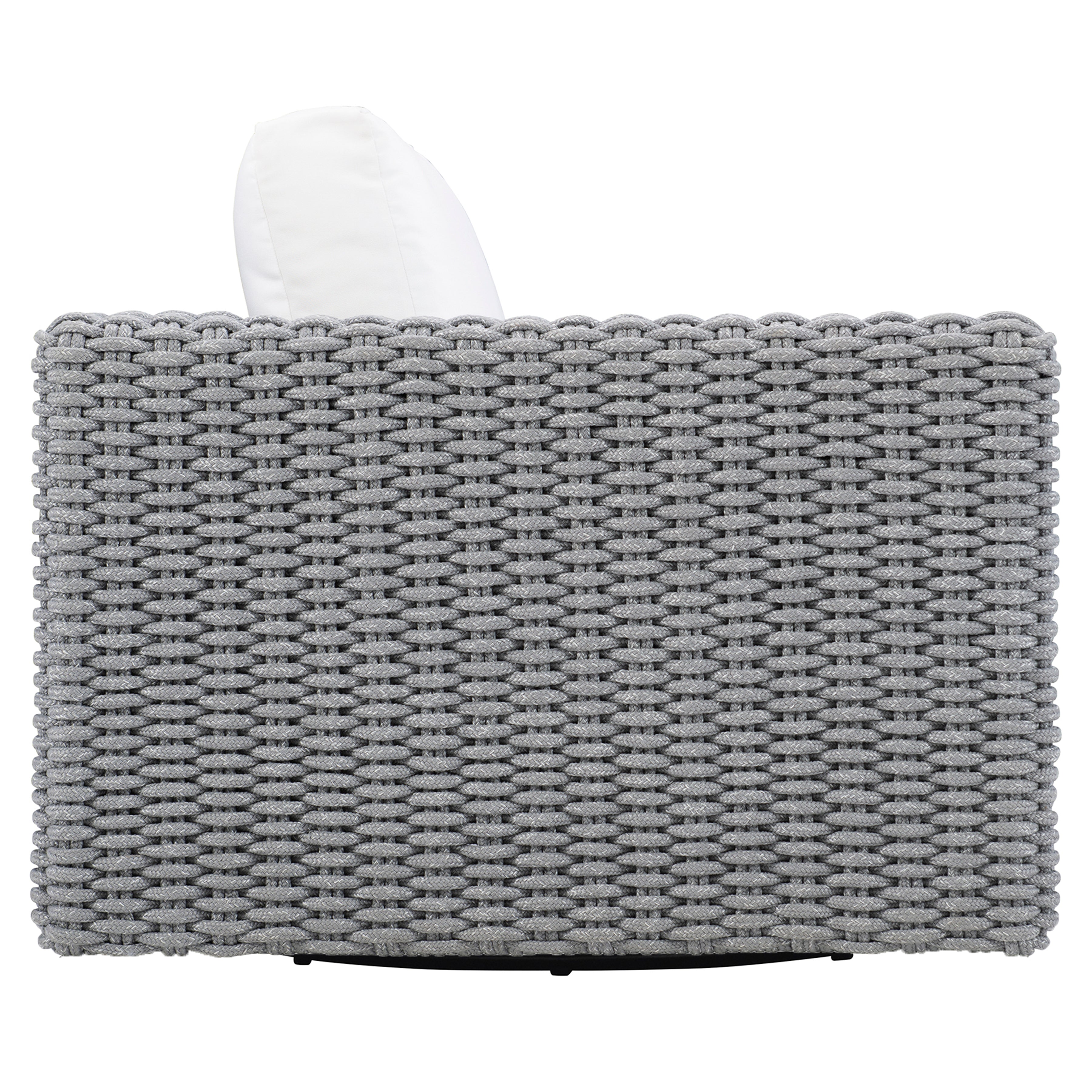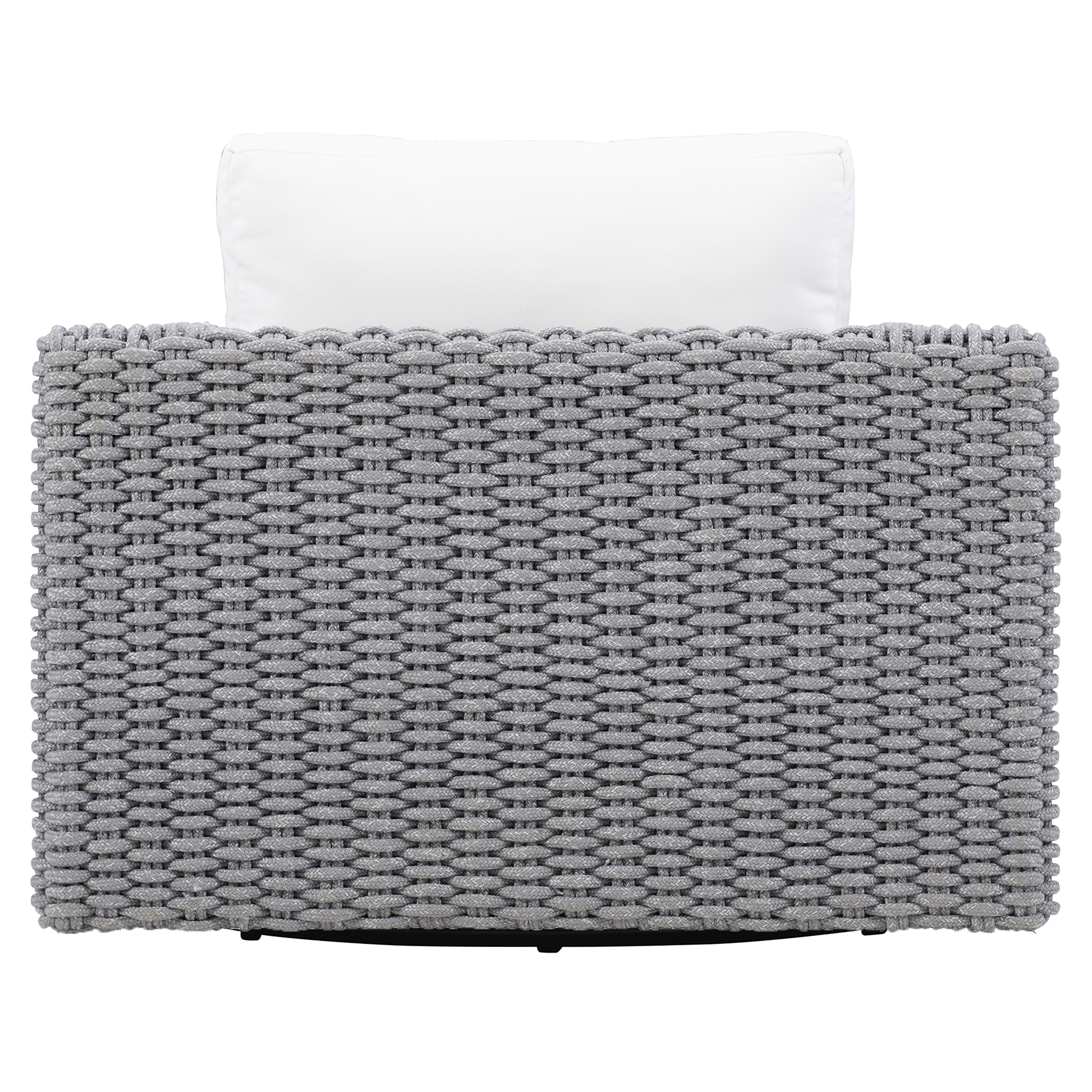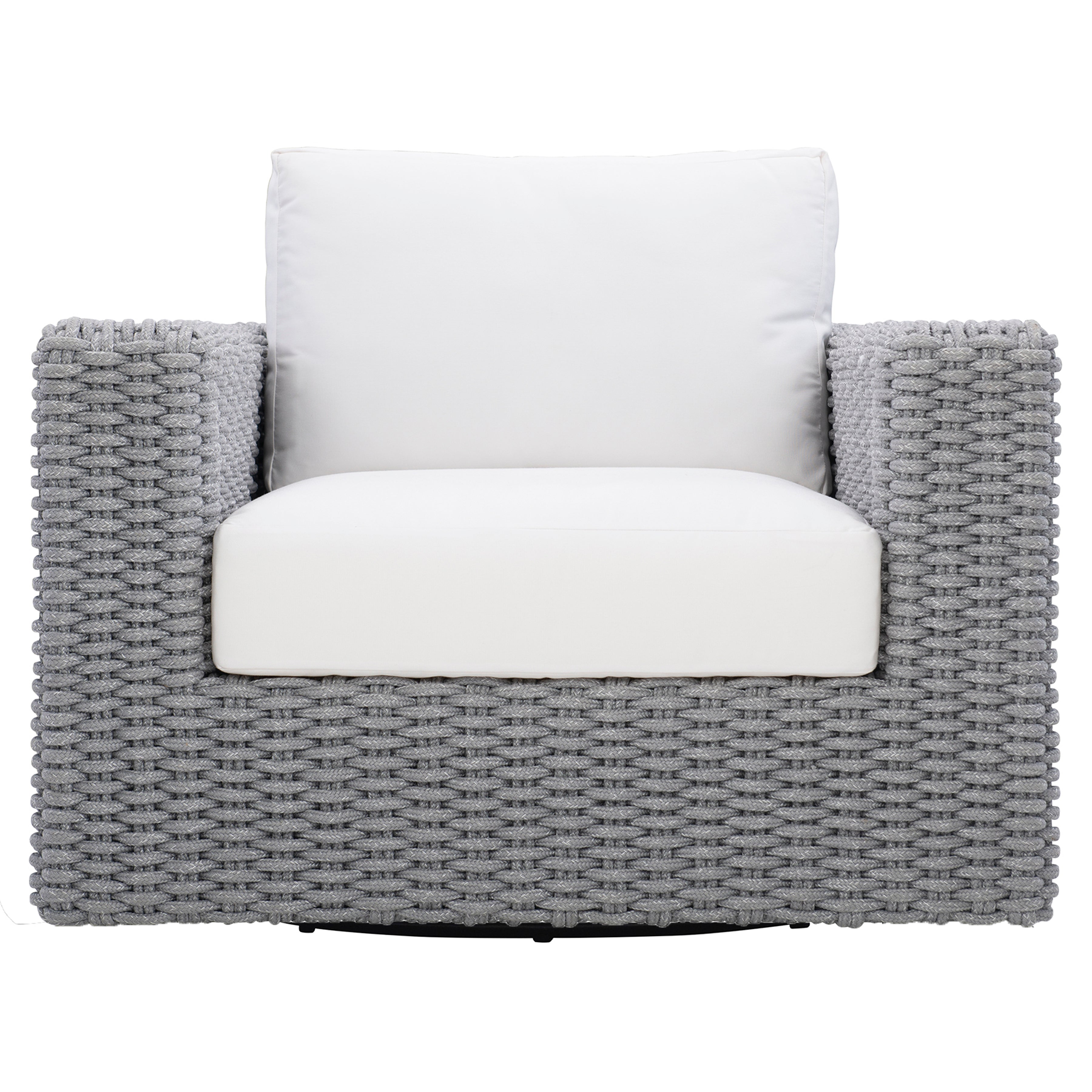 Engineered for outdoor use, the Capri swivel chair extends the indoor aesthetic outside. Loose fiber-back, quick dry foam seat and back cushions rest on a handsome hand-crafted rope base on a swivel. A powder-coated aluminum frames adds durability.